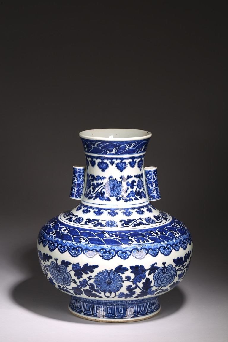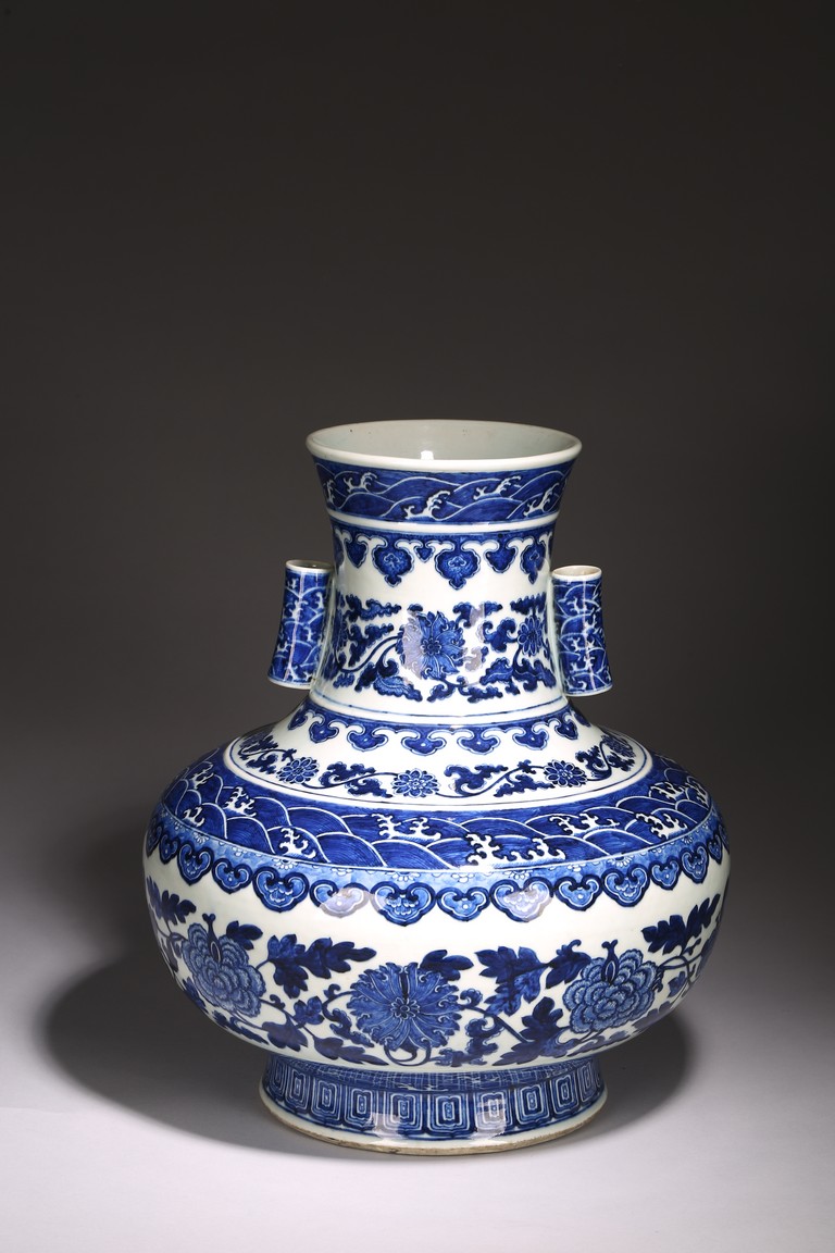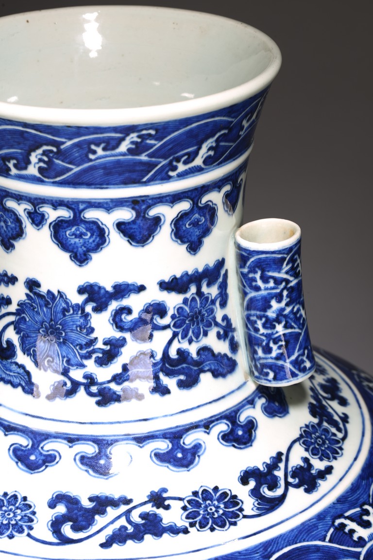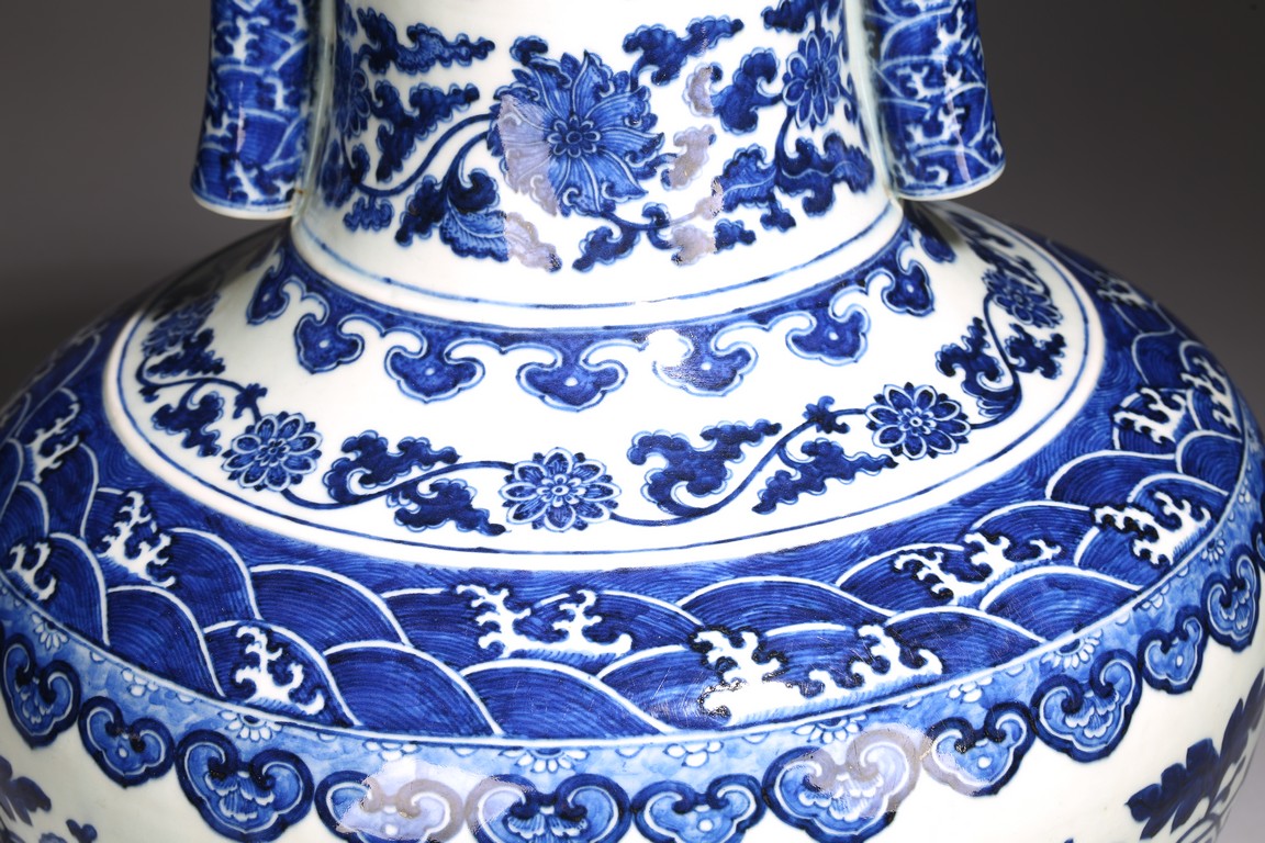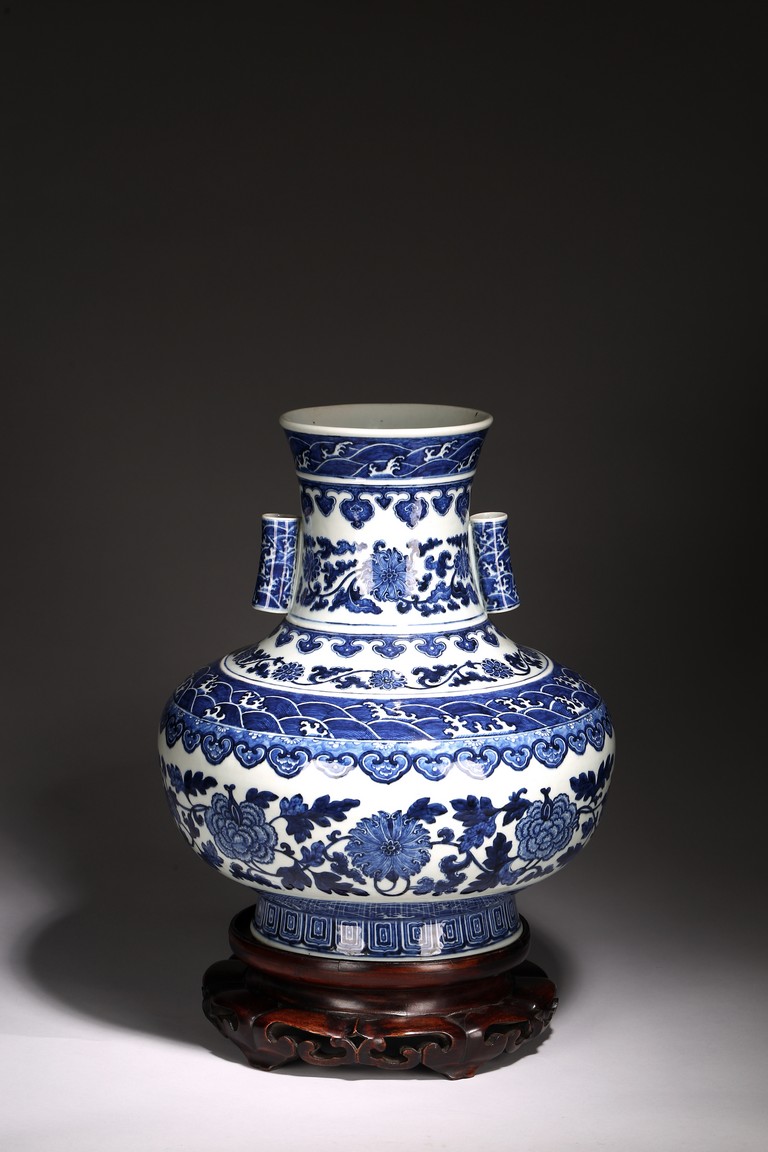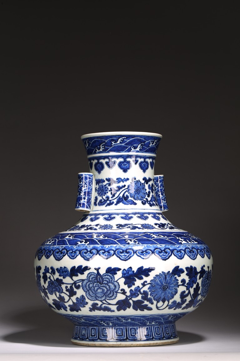 本品外形敦實而線條硬朗,穩重恢宏而氣息尊貴,直口,長頸,頸兩側對稱飾貼豎直管狀耳,折肩,肩下漸收,圈足,造型穩重古樸。胎骨精良堅致,釉汁溫潤如玉。通體青花為飾,蒼妍雄渾,髮色沉穩而不失艷麗,層次分明。其紋飾自上而下繁密鋪陳,“海水紋”“倒掛如意紋”“纏枝花卉紋”“蕉葉紋”等,紋飾雖見繁縟但層次清晰,每重紋飾之間均有留白,對比鮮明,予人異常醒目之視覺效果。其佈局疏密有致,繪畫精湛,運筆流暢,點塗錯落,古雅盡顯。整體線條硬朗,體型巨大,青花呈色艷麗,紋飾層次清晰,畫工精細,紋飾精美、描繪細緻,構思巧妙,裝飾手法奇巧別緻,匠心獨運。為宮廷御用陳設佳器,“大清乾隆年制”款識。來源:洛杉磯華裔女導演藏家提供,由其外祖父與上世紀60年代購於加州古董市場 Provenance: Property from the collection of a lady, Los Angeles, acquired by her late grandparent during 1960s from antique markets in Southern California.