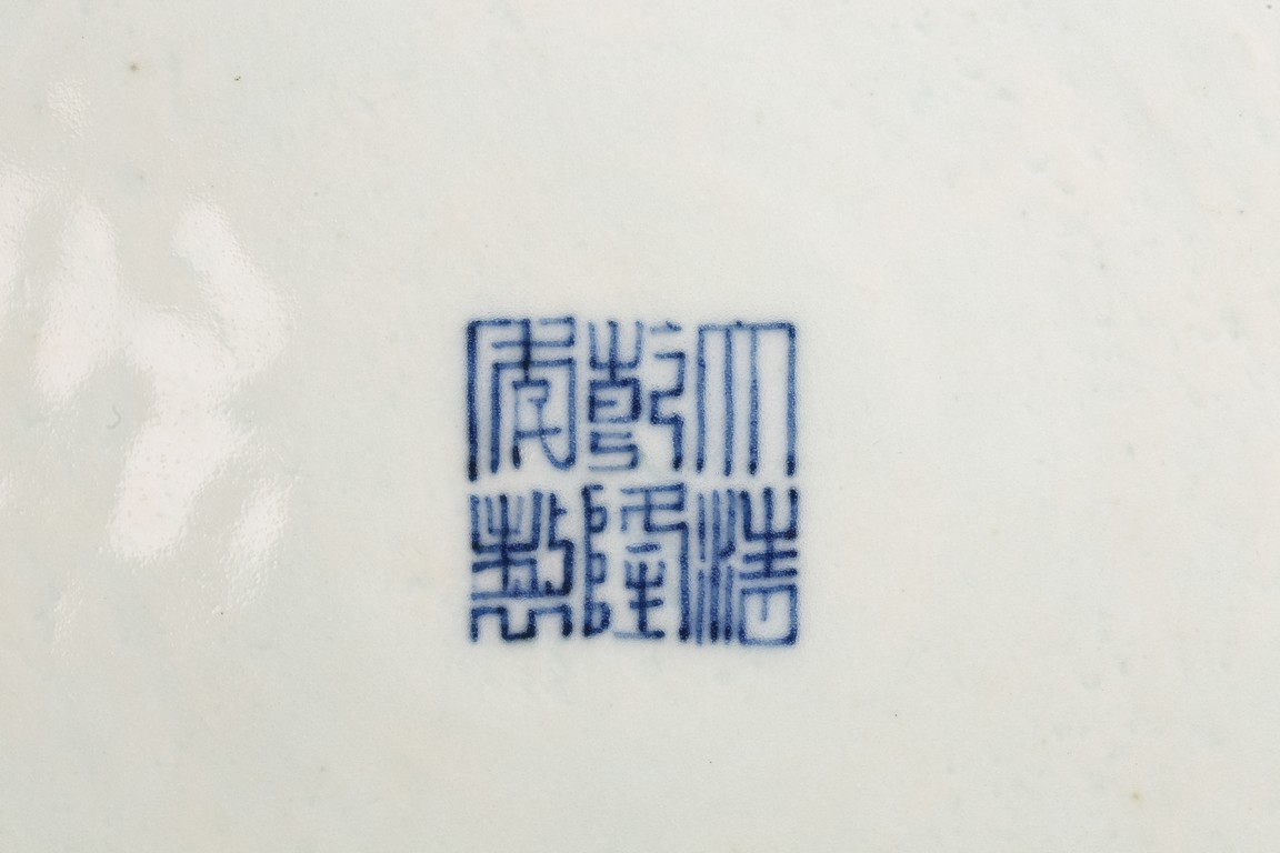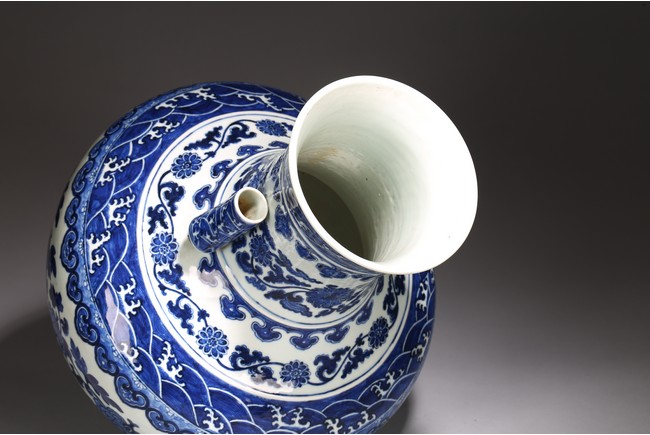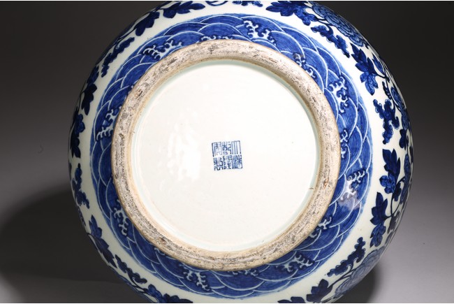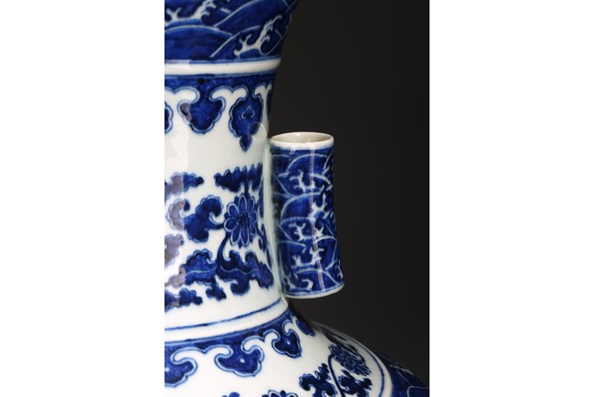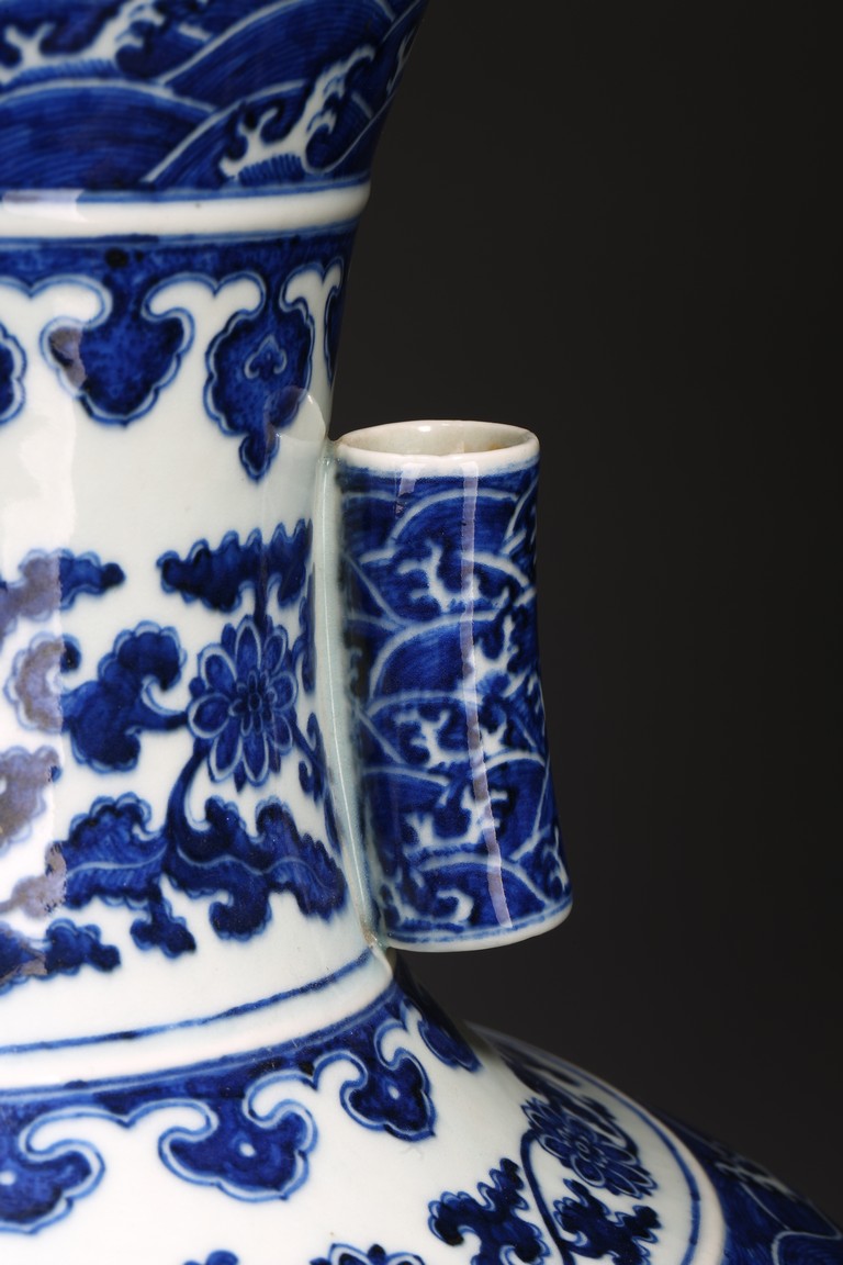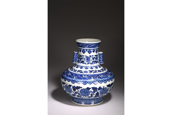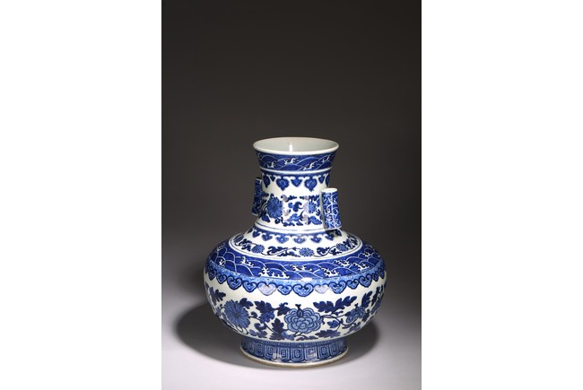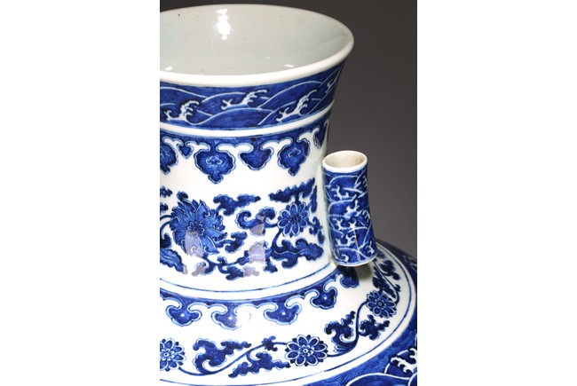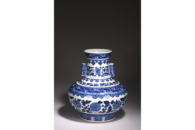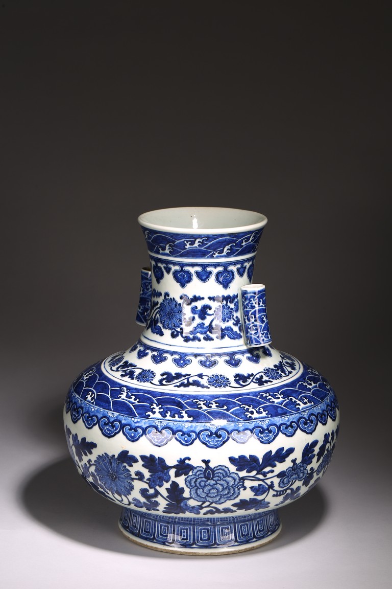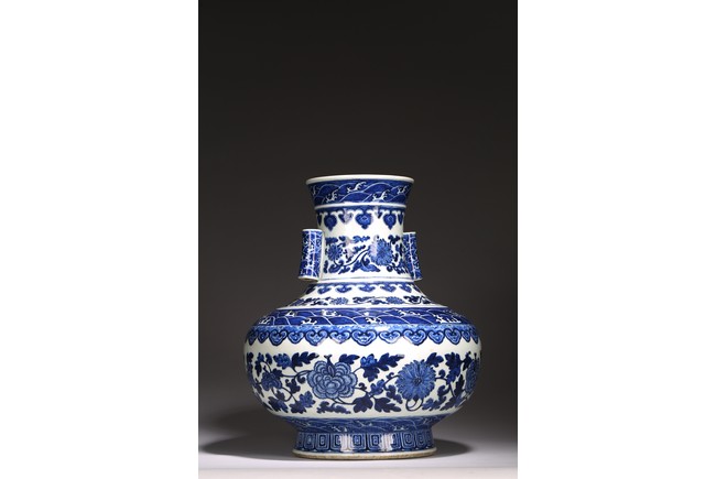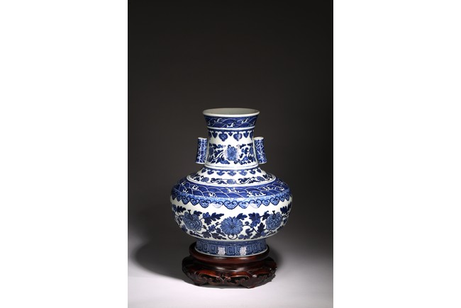 本品外形敦實而線條硬朗,穩重恢宏而氣息尊貴,直口,長頸,頸兩側對稱飾貼豎直管狀耳,折肩,肩下漸收,圈足,造型穩重古樸。胎骨精良堅致,釉汁溫潤如玉。通體青花為飾,蒼妍雄渾,髮色沉穩而不失艷麗,層次分明。其紋飾自上而下繁密鋪陳,“海水紋”“倒掛如意紋”“纏枝花卉紋”“蕉葉紋”等,紋飾雖見繁縟但層次清晰,每重紋飾之間均有留白,對比鮮明,予人異常醒目之視覺效果。其佈局疏密有致,繪畫精湛,運筆流暢,點塗錯落,古雅盡顯。整體線條硬朗,體型巨大,青花呈色艷麗,紋飾層次清晰,畫工精細,紋飾精美、描繪細緻,構思巧妙,裝飾手法奇巧別緻,匠心獨運。為宮廷御用陳設佳器,“大清乾隆年制”款識。來源:洛杉磯華裔女導演藏家提供,由其外祖父與上世紀60年代購於加州古董市場 Provenance: Property from the collection of a lady, Los Angeles, acquired by her late grandparent during 1960s from antique markets in Southern California.