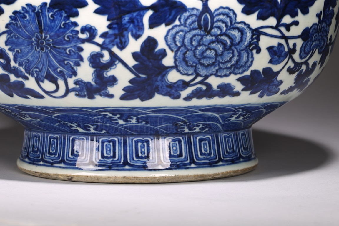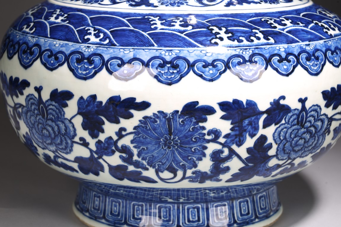 Chinese. The robustly potted vessel is finely decorated around the slightly compressed bulbous lower section with large floral blooms borne on leafy meandering scrollst between a band of 'ruyi' heads at the shoulder and crashing waves at the base, the waisted neck flanked by a pair of tubular lug handles, the wave band further repeated around the shoulders, mouth and handles, with two registers of lotus flowers filling out the decoration around the neck, the base bears a six character 'Qianlong' mark. Qing Dynasty period.