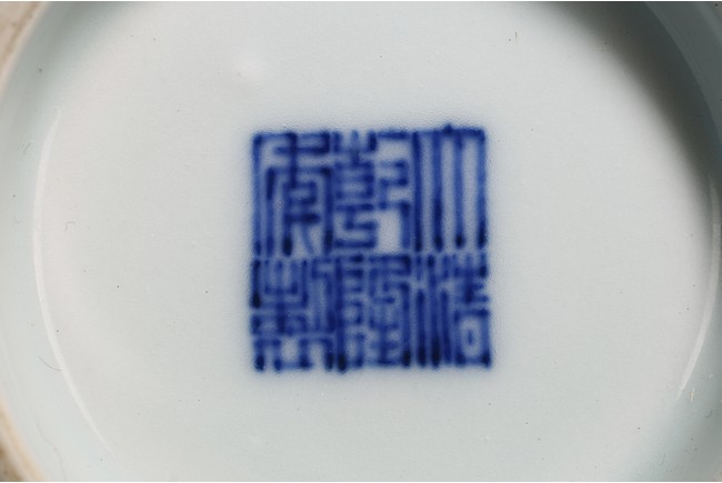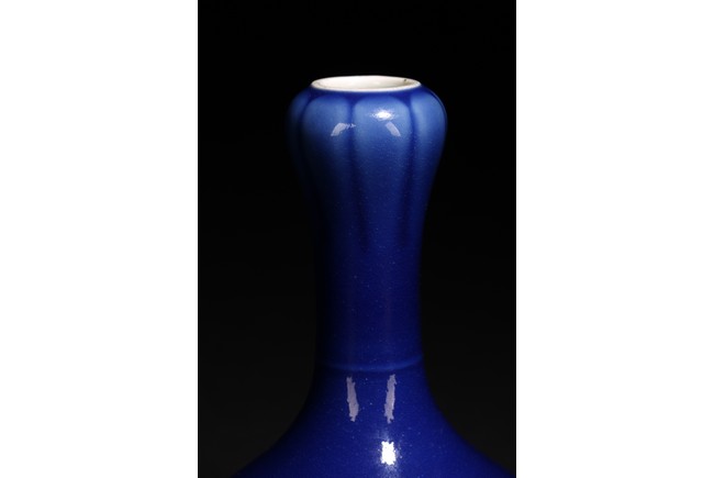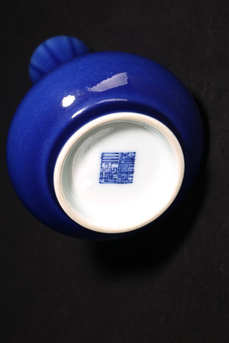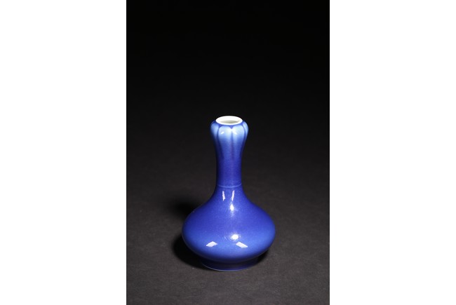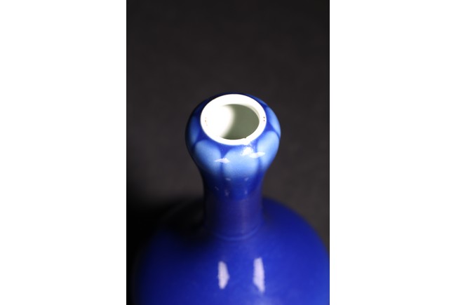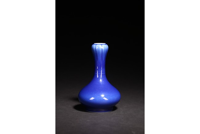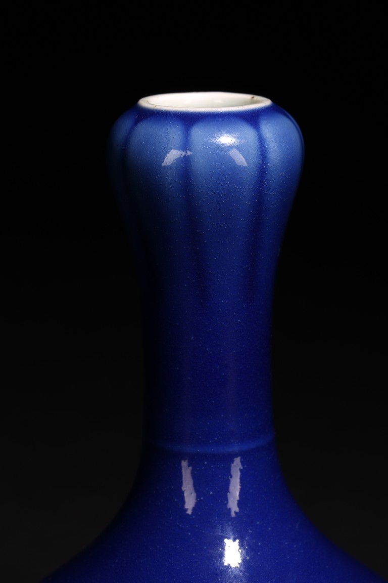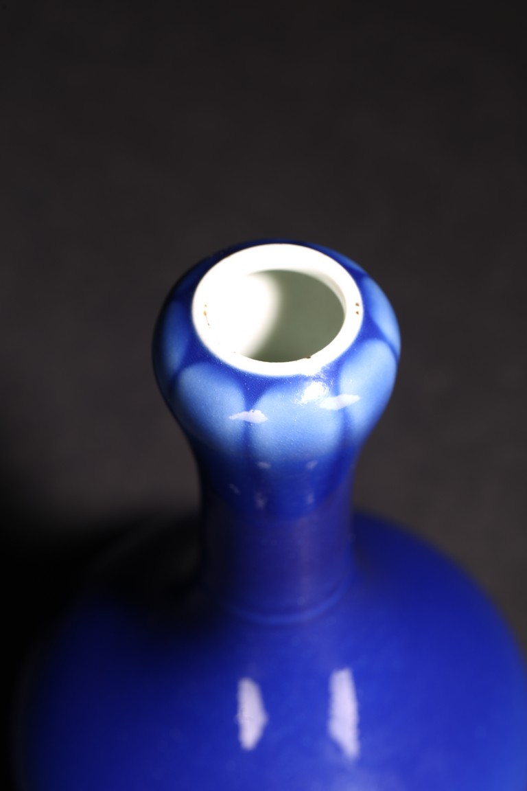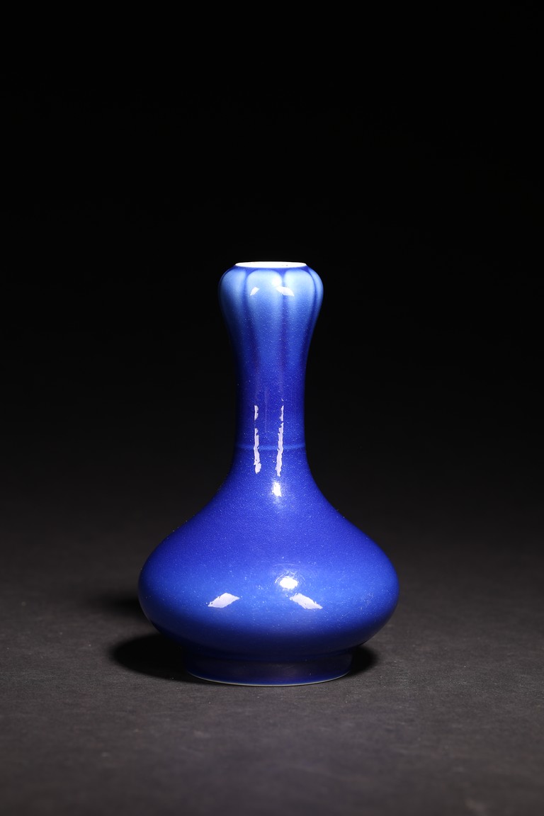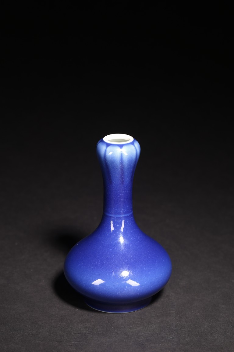瓶口若蒜頭,長頸,溜肩,垂圓腹,圈足,通體施“祭藍釉”,其線條柔美起伏,盡見迤邐之姿,所施祭藍一色,勻淨瑩亮,靜穆古雅,胎骨細薄堅致,麗質怡人。 “大清乾隆年制”款識。