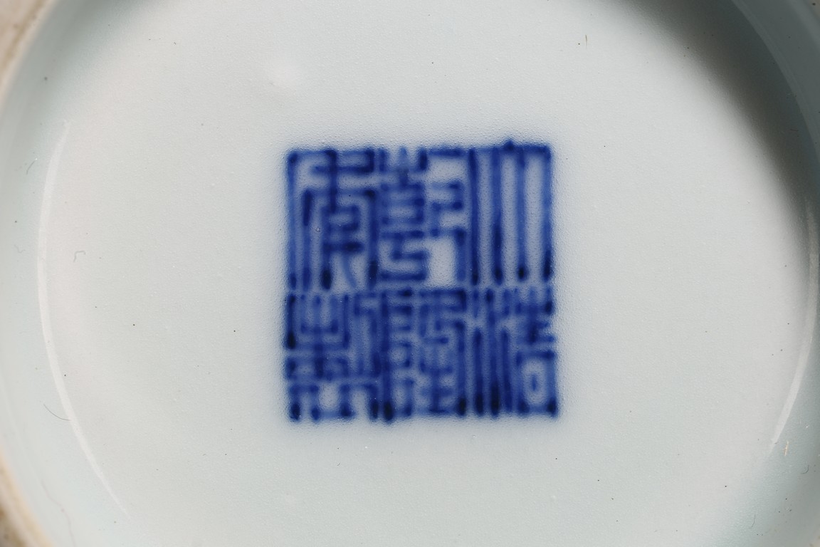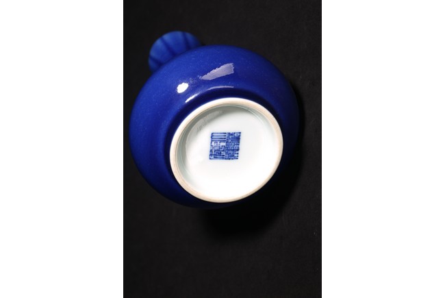 Chinese. The compressed globular body resting on a short tapered foot, rising to a slender neck encircled by a raised filet and to a wide garlic-head mouth, the exterior covered with a rich blue glaze, draining to pale tones at the shoulder and mouth, stopping just above the unglazed foot ring, the base bears a six character reign mark. Qing Dynasty period.