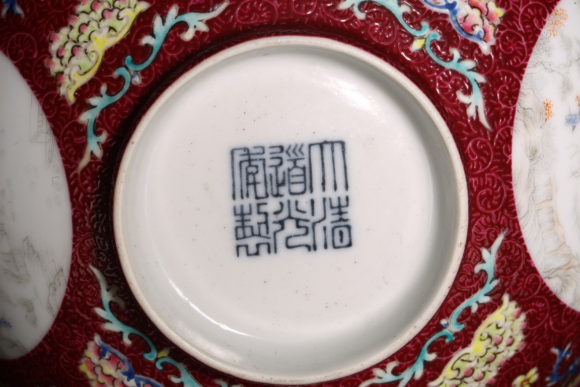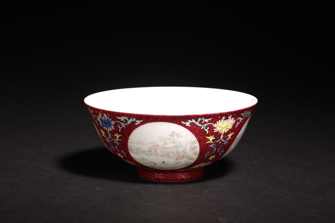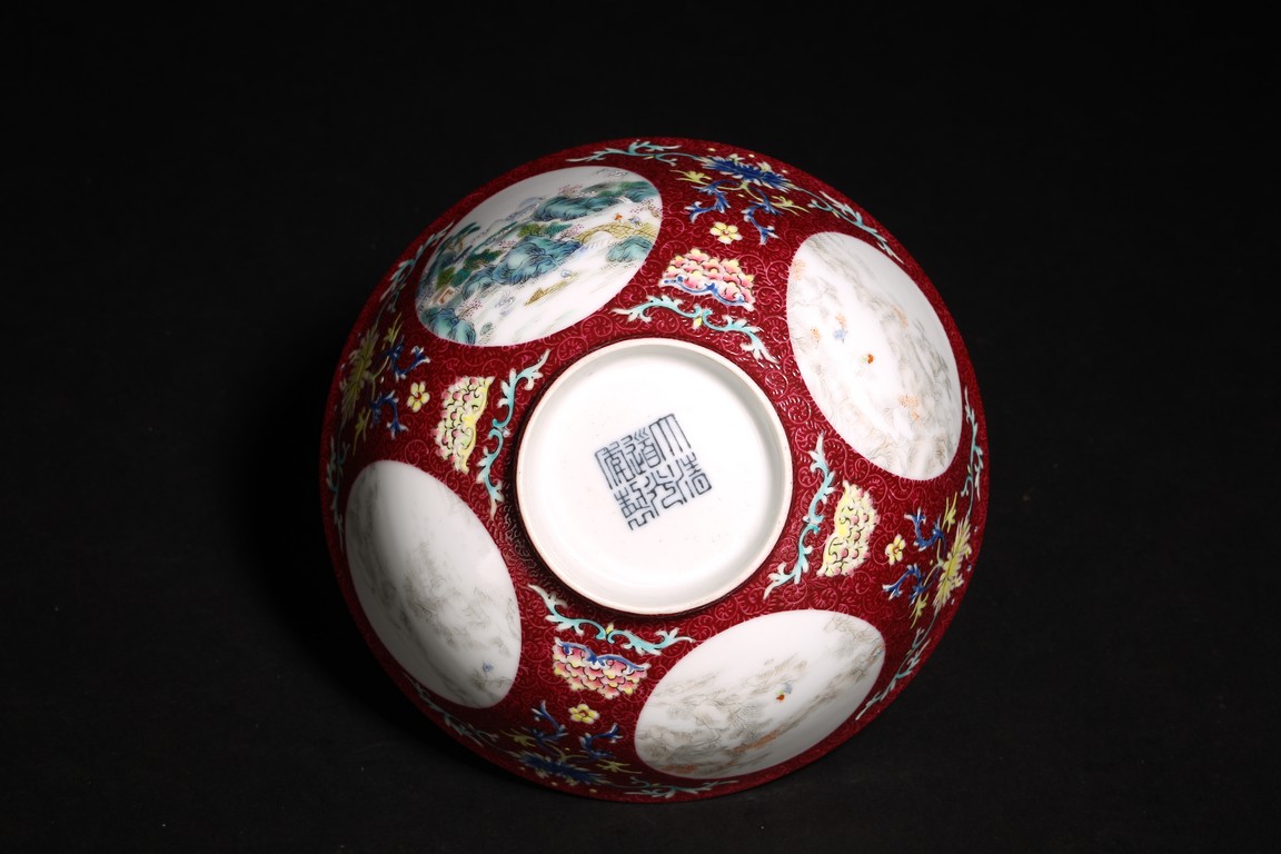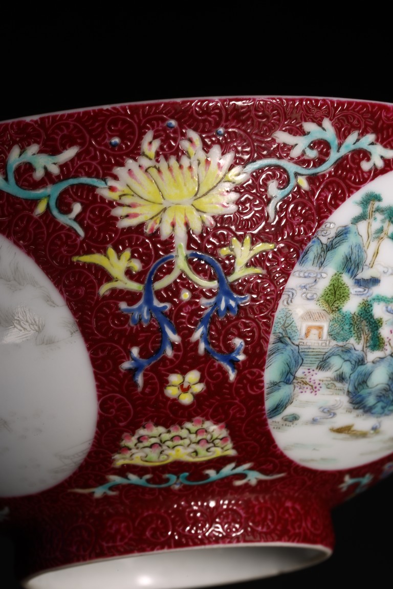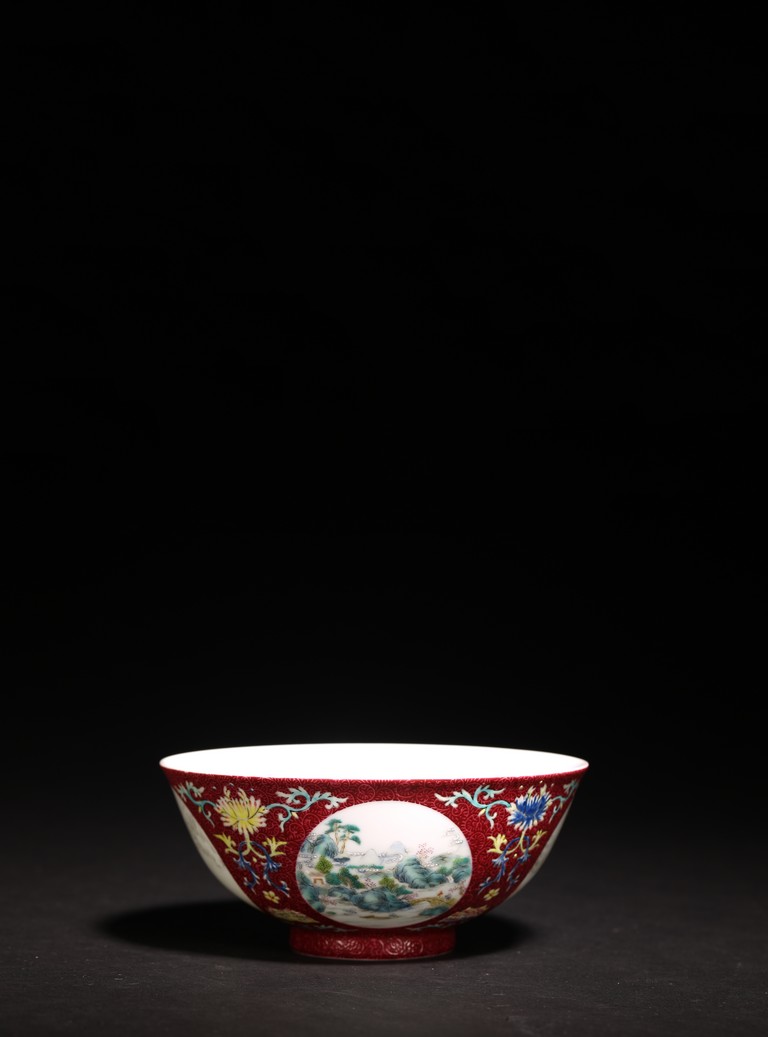 直口,弧腹,圈足。通體施以胭脂紫彩為色地,四開光山水圖,開光外軋道飾花卉紋。碗心飾寶相花頭。整器秀美華貴,妍而不俗,氣質非凡,畫工致細膩,胭脂紫彩厚潤勻淨,花飾柔美舒雅,諸彩妍麗而含蓄。 “大清道光年制”款識。來源: 德州達拉斯私人藏家提供 Provenance: Property from a Dallas, Texas private collection
