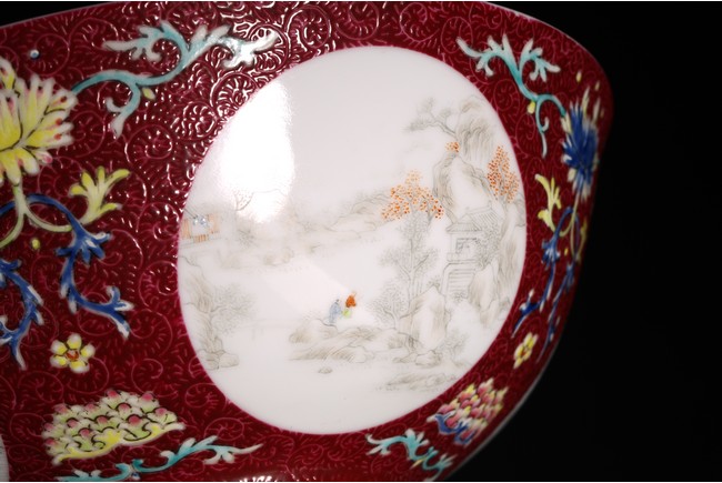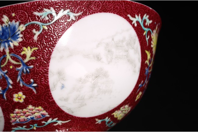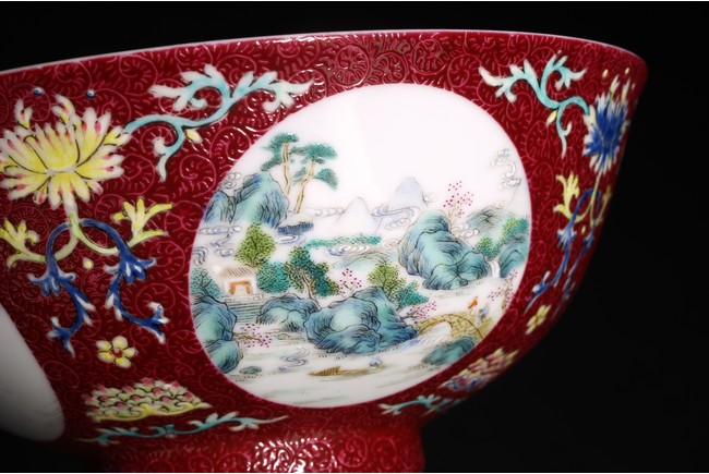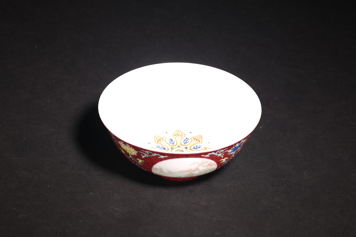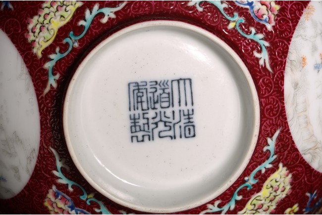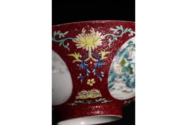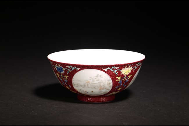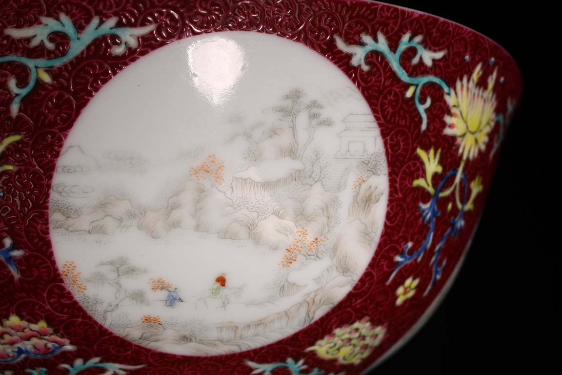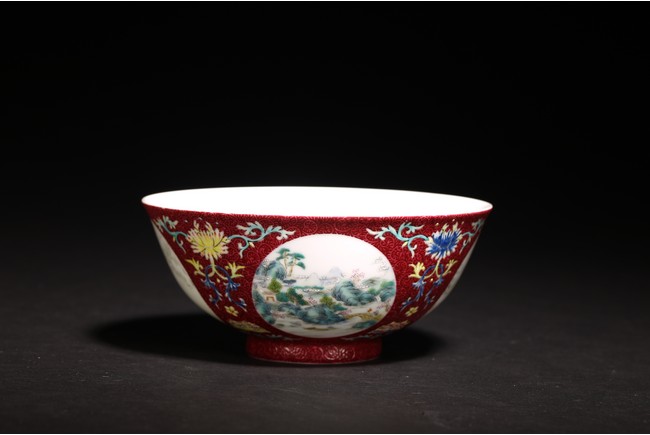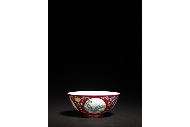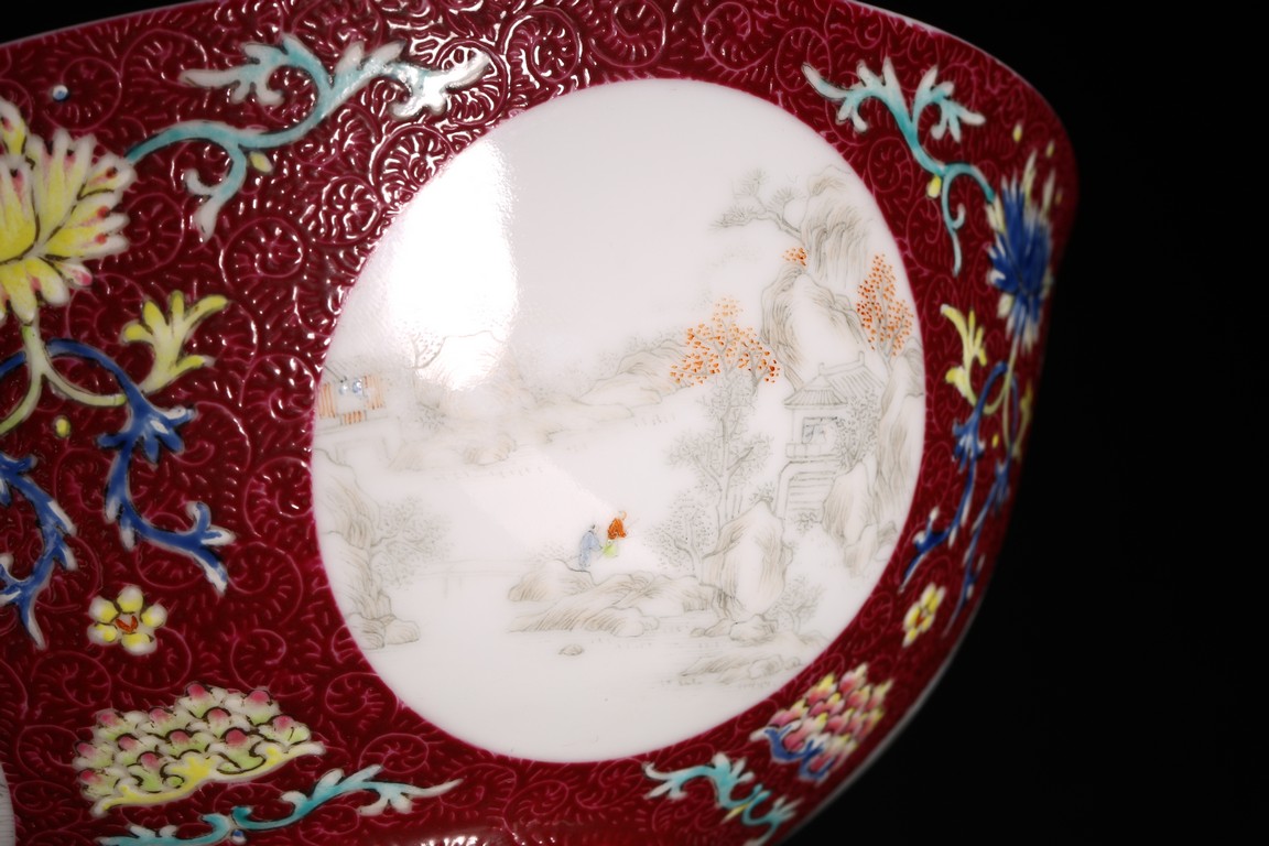 直口,弧腹,圈足。通體施以胭脂紫彩為色地,四開光山水圖,開光外軋道飾花卉紋。碗心飾寶相花頭。整器秀美華貴,妍而不俗,氣質非凡,畫工致細膩,胭脂紫彩厚潤勻淨,花飾柔美舒雅,諸彩妍麗而含蓄。 “大清道光年制”款識。來源: 德州達拉斯私人藏家提供 Provenance: Property from a Dallas, Texas private collection
