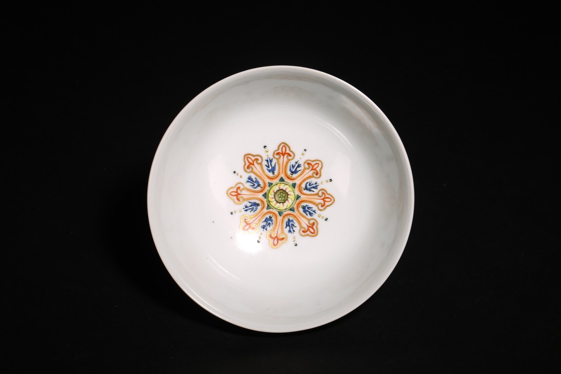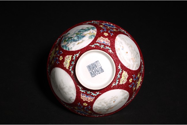 Chinese. With deep rounded sides, the exterior painted with four medallions depicting various landscape scenes, all divided by floral scrolls, the interior painted with a stylised octagonal rosette highlighted in gilt, the base with a six-character seal mark. Qing Dynasty Daoguang period.