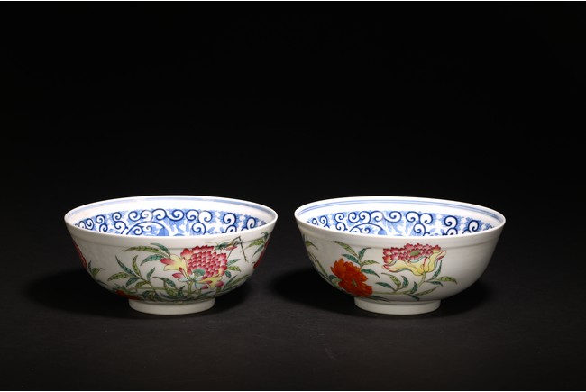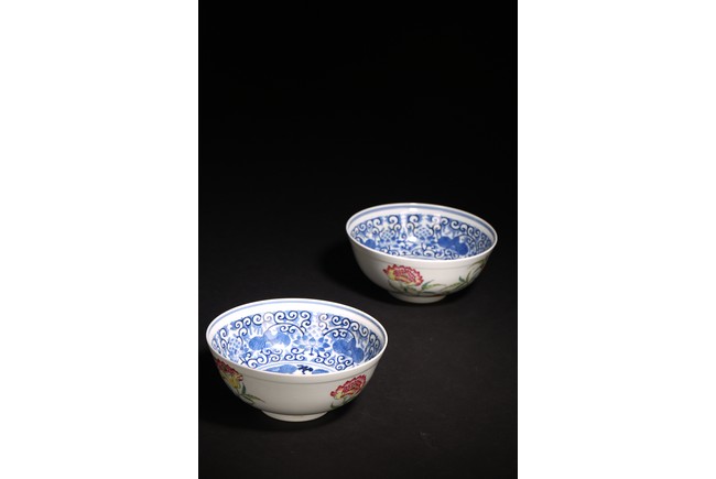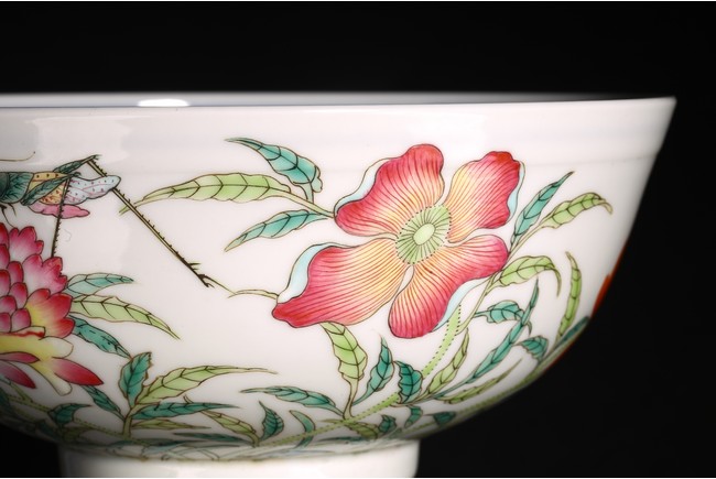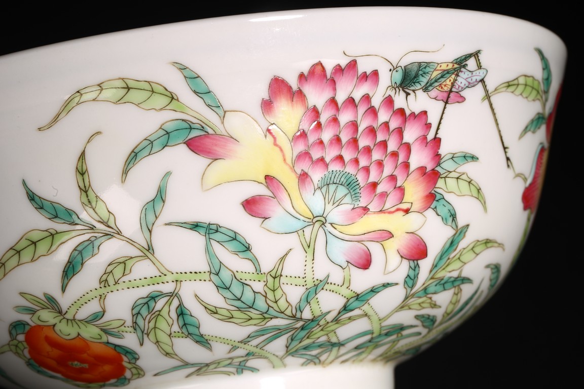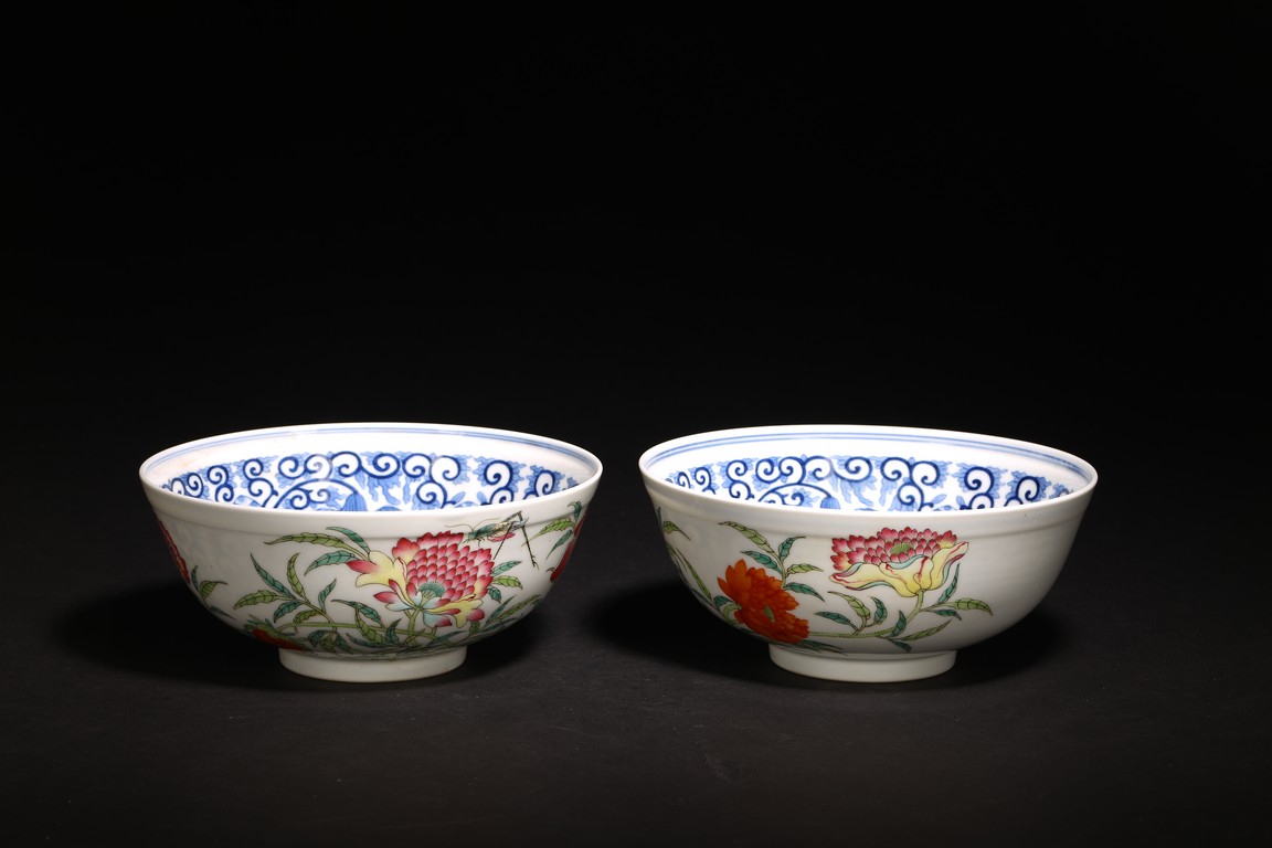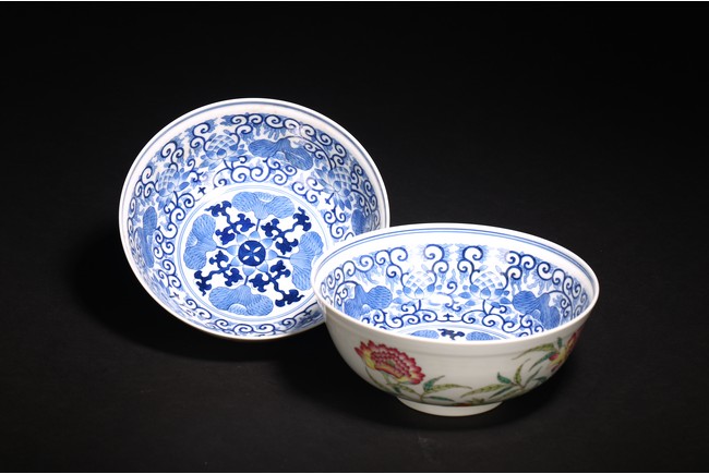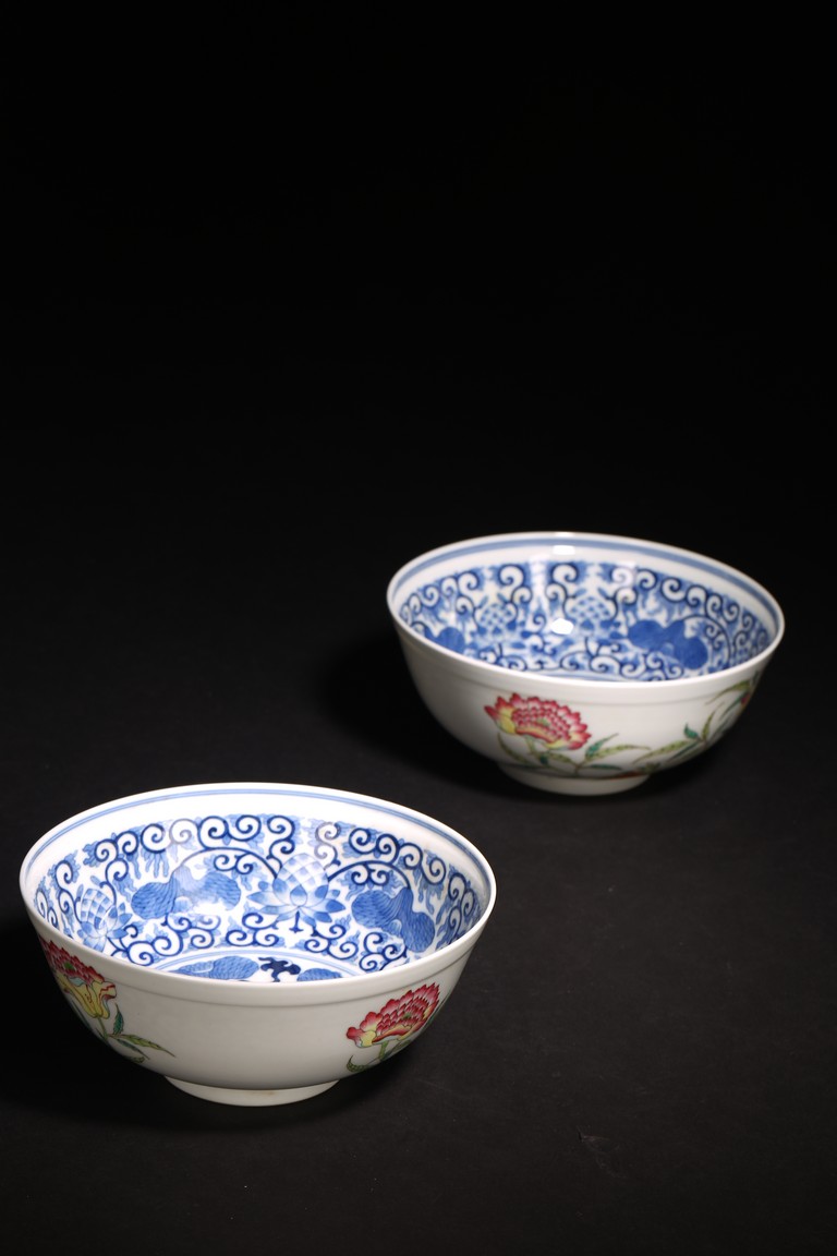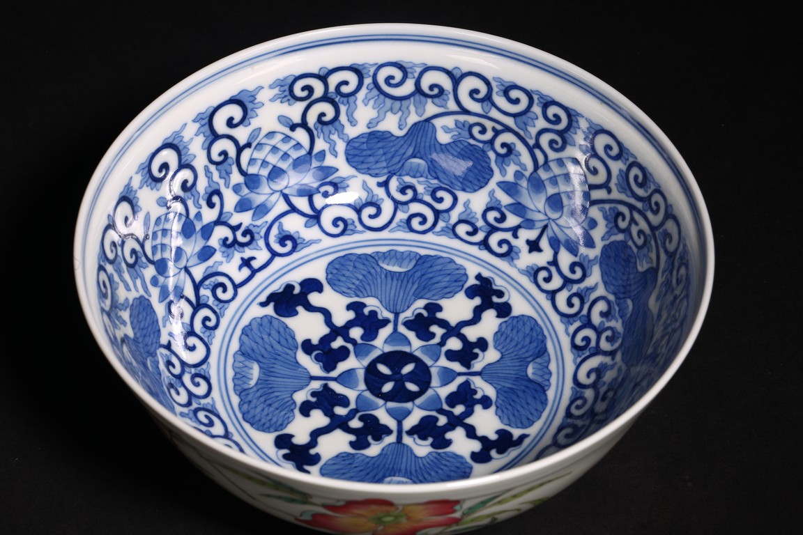 直口,弧腹,圈足。器外壁施粉彩繪“花卉紋”,花繁葉茂,色彩艷麗,芬芳吐艷,花姿招展。器心施青花繪“對稱花卉紋”,紋飾繁而不亂,對稱規矩,嚴謹大方。 “大清光緒年制”款識。