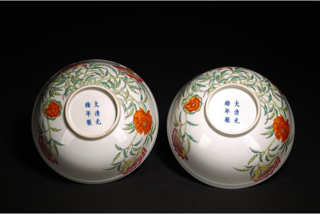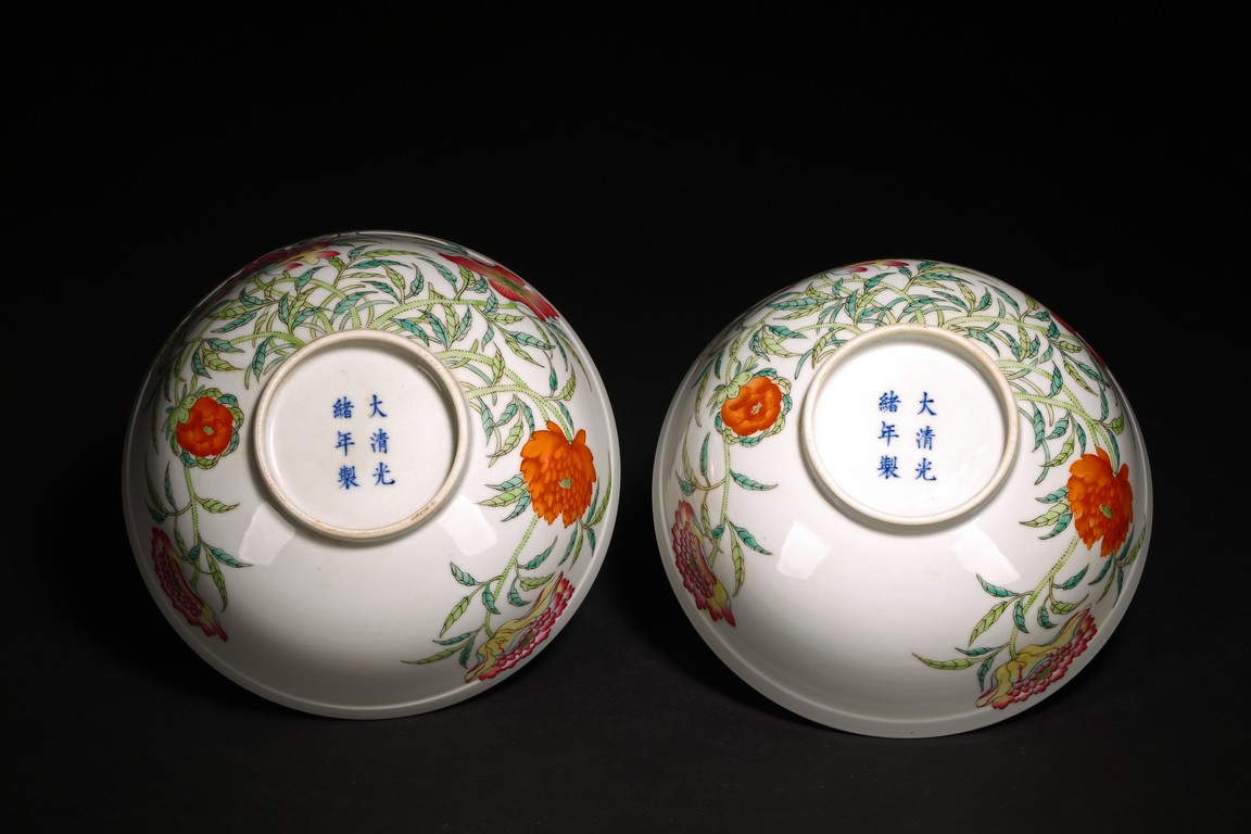 Chinese. Each with steep rounded sides rising from a straight foot to a beaded rim, the exterior enamelled in the famille rose palette with lotus, peony and chrysanthemum growing from the base, the interior painted with lotus leaves radiating from a central flower, surrounded by similar stylised lotus flowers and leaves on a scrolling stems, the base bears Guangxu mark. Qing Dynasty Guangxu period.
