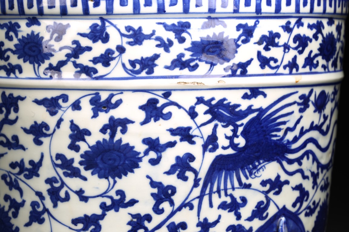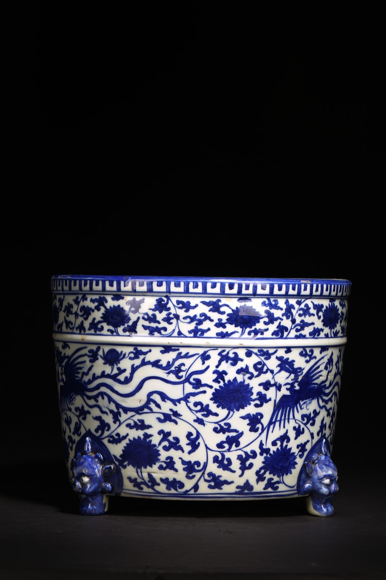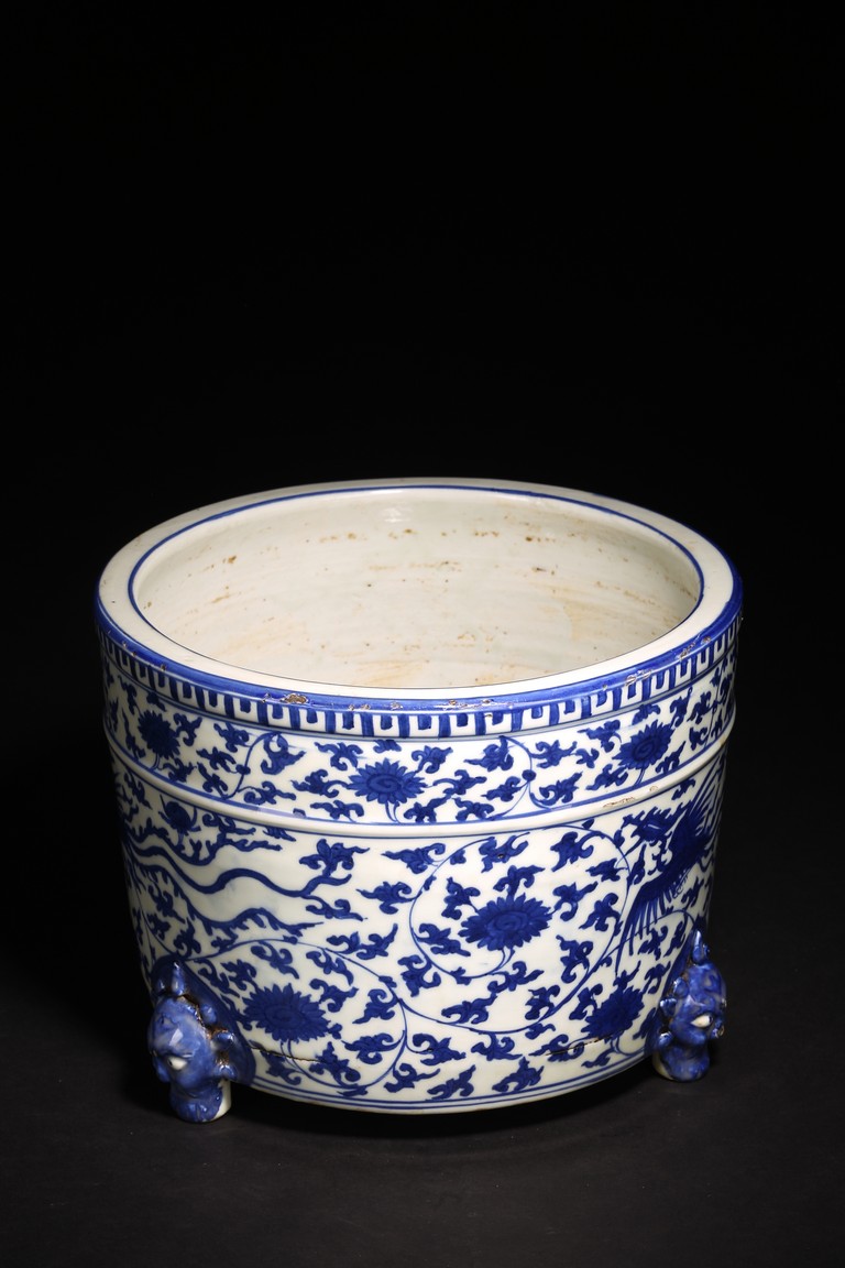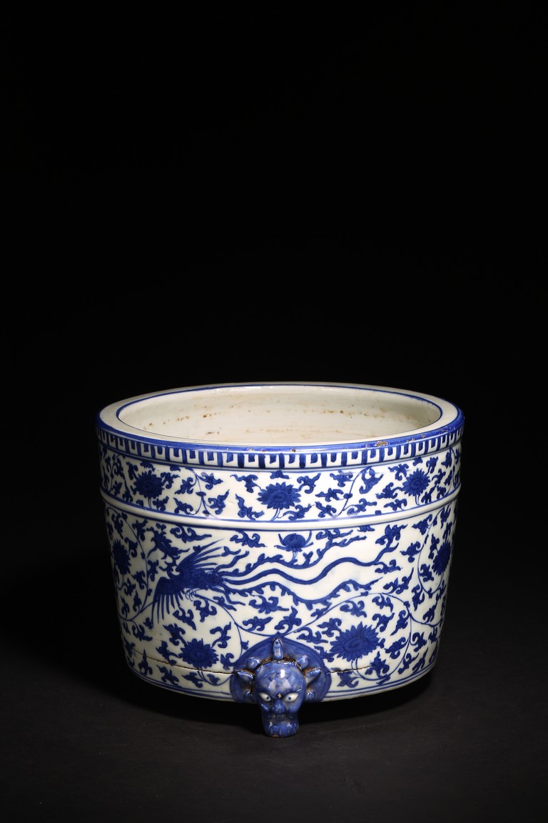 Chinese. The cylindrical body painted vibrant tones of blue with phoenix in flight amidst lotus scrolls below a raised filet and a band of further lotus scroll, all supported on three animal-mask feet, the base bears a six character Jiajing mark within double line border in underglaze blue. Ming Dynasty Jiajing period.