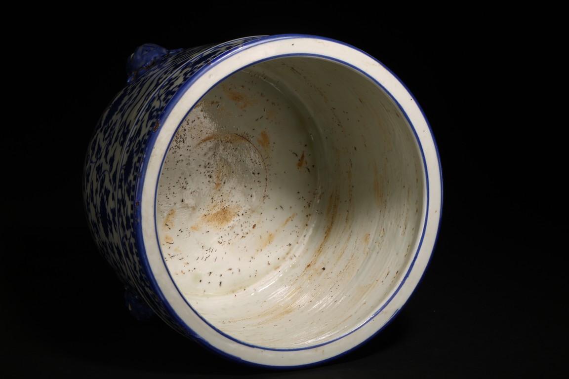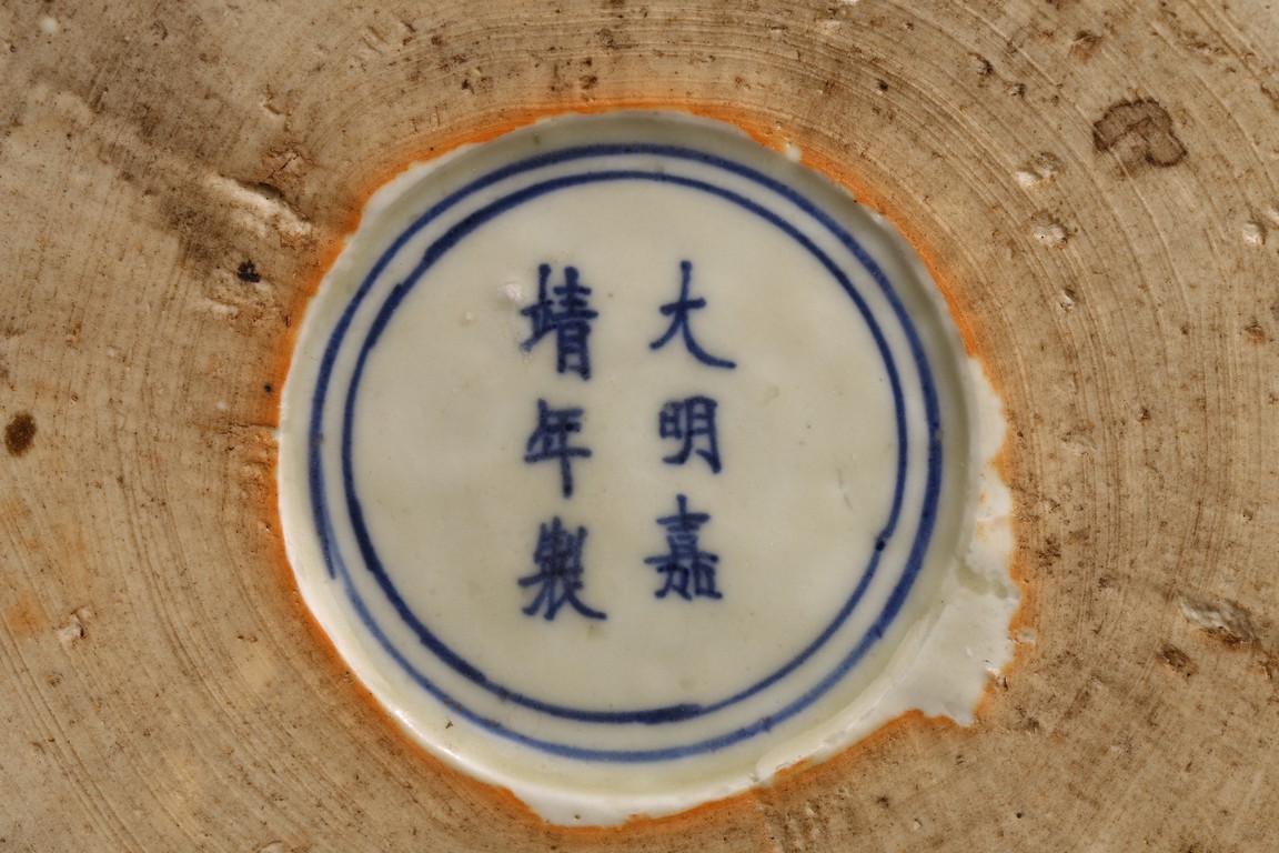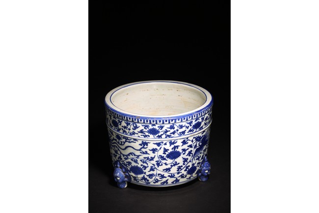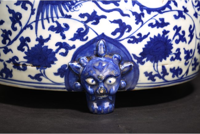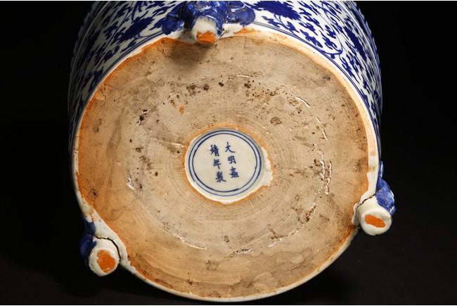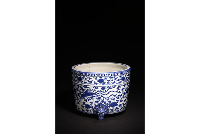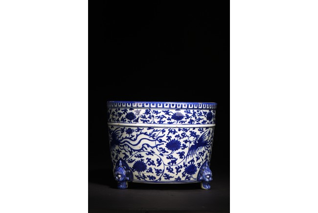 Chinese. The cylindrical body painted vibrant tones of blue with phoenix in flight amidst lotus scrolls below a raised filet and a band of further lotus scroll, all supported on three animal-mask feet, the base bears a six character Jiajing mark within double line border in underglaze blue. Ming Dynasty Jiajing period.