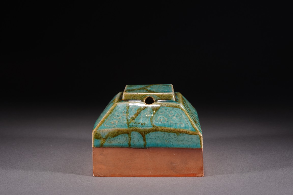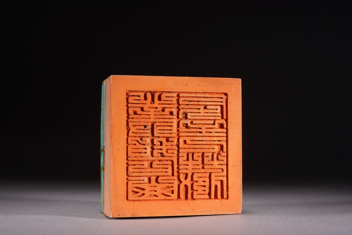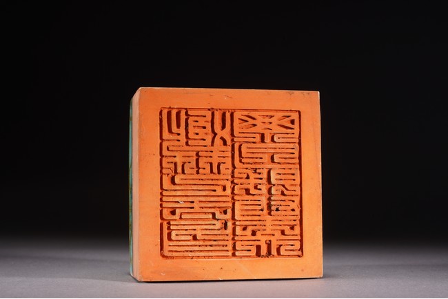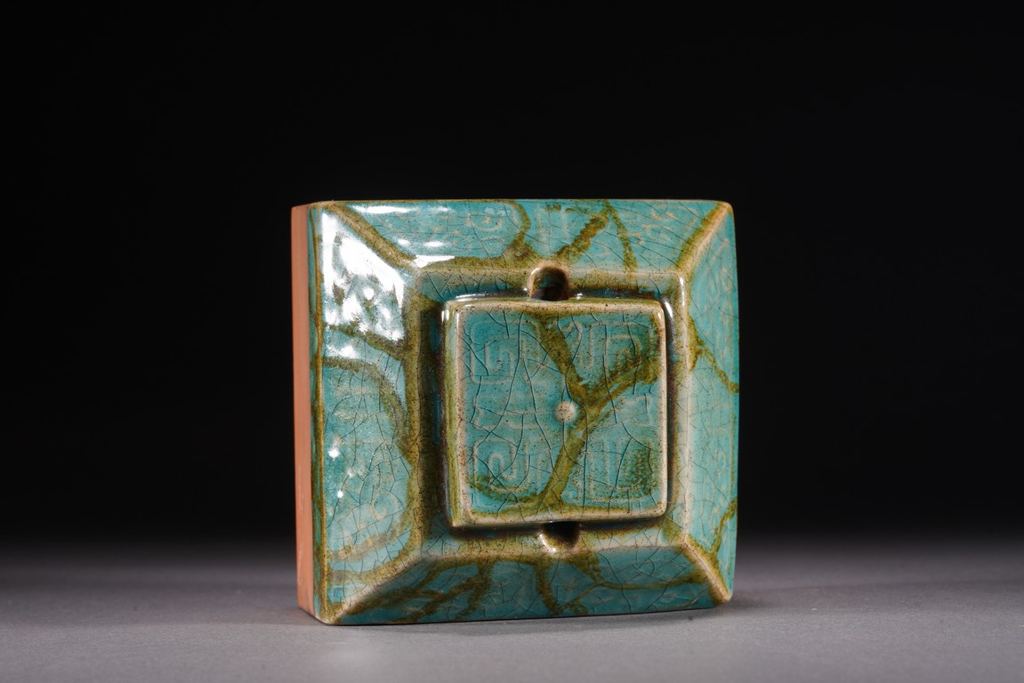 Chinese. The seal suffused with green and russet glaze with fine crackles and moulded with archaistic pattern, the base carved with six characters. Republic period.
