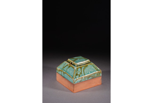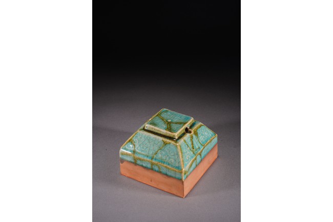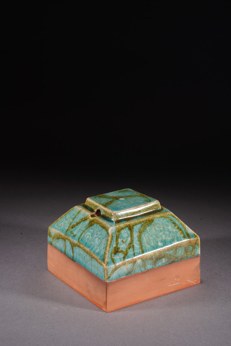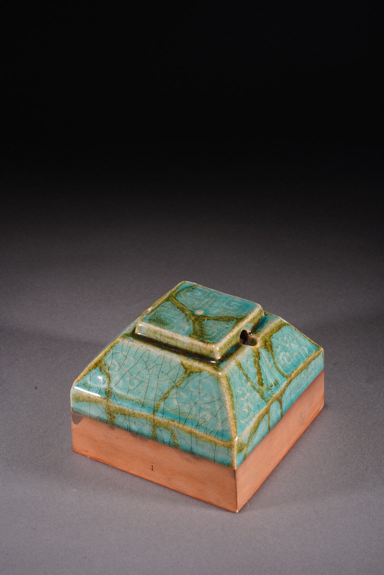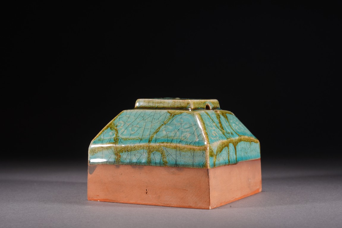Chinese. The seal suffused with green and russet glaze with fine crackles and moulded with archaistic pattern, the base carved with six characters. Republic period.