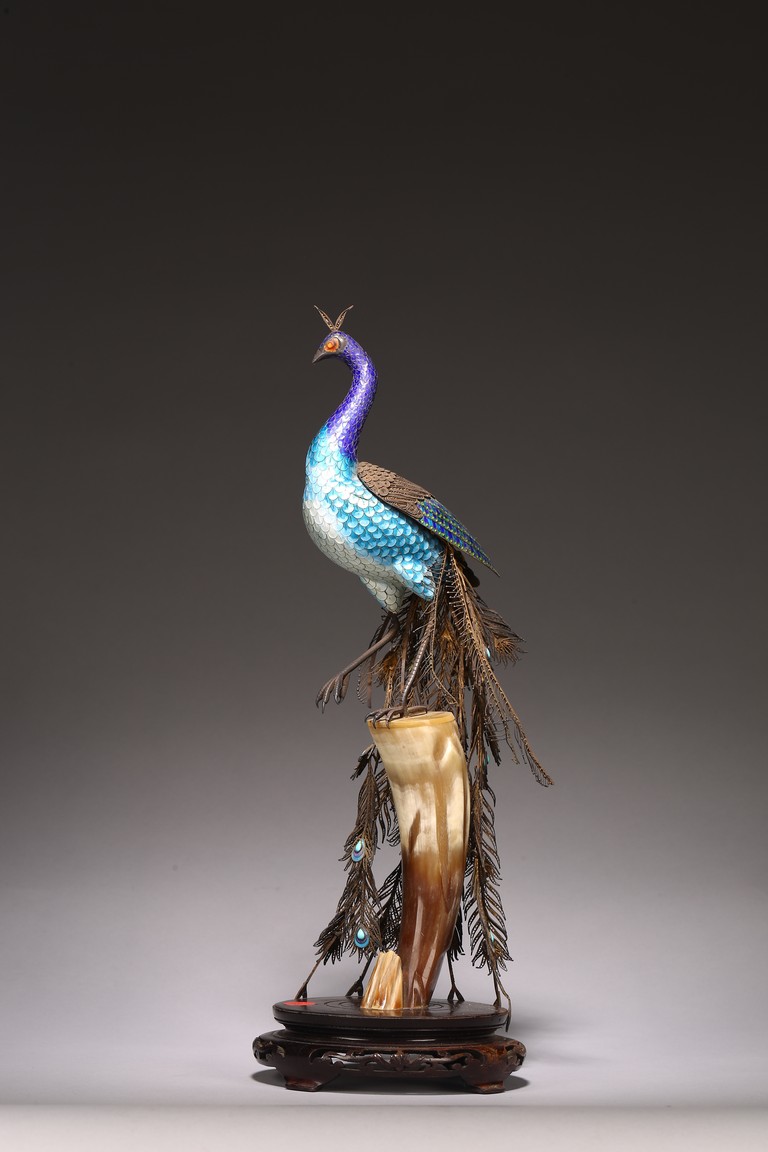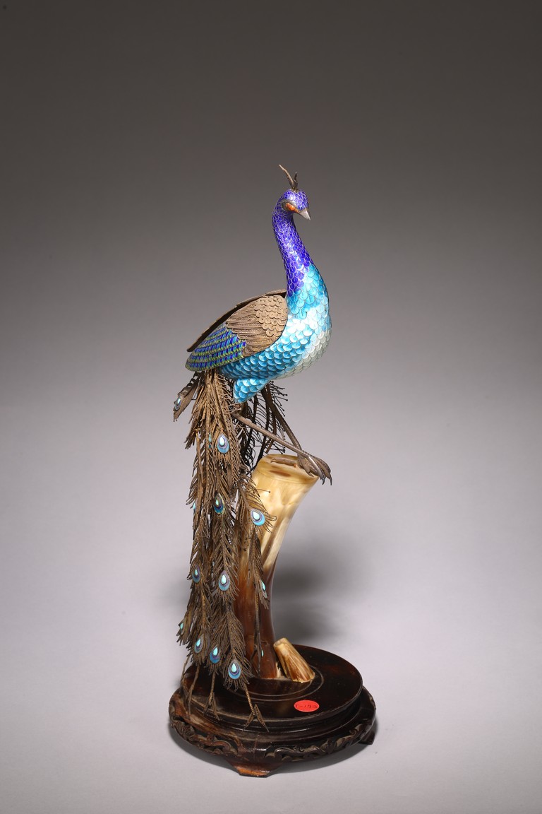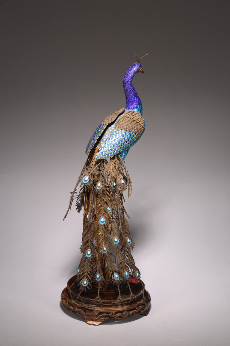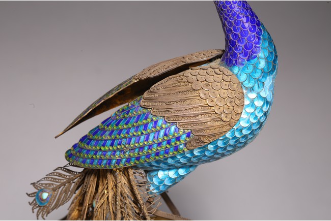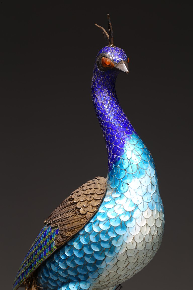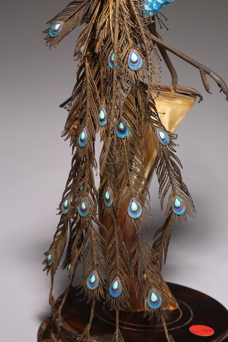 Chinese. Made from enamelled and gilded (gold-plated) silver and silver filigree. The tail feathers are also inset with large pear-shaped turquoise cabochons.decorated with light and dark blue, light green and cream enamel. Qing Dynasty period.