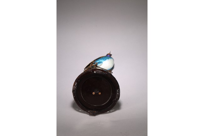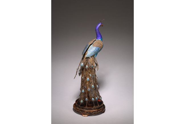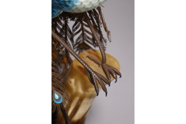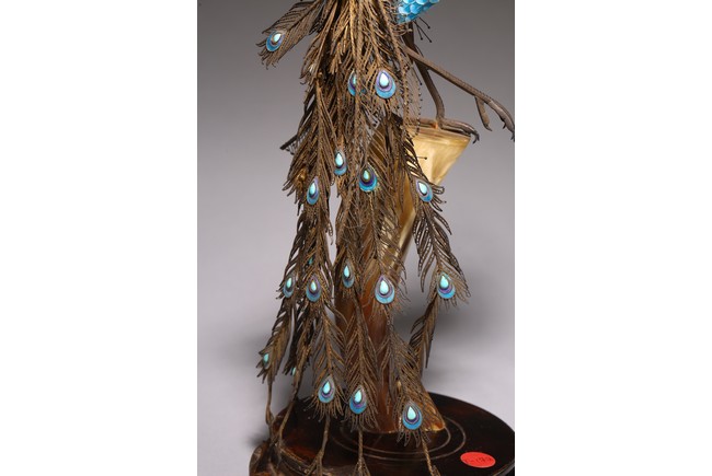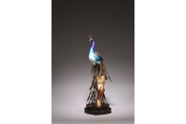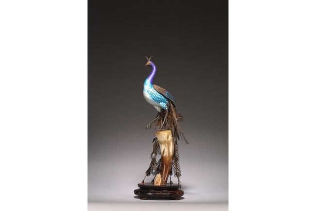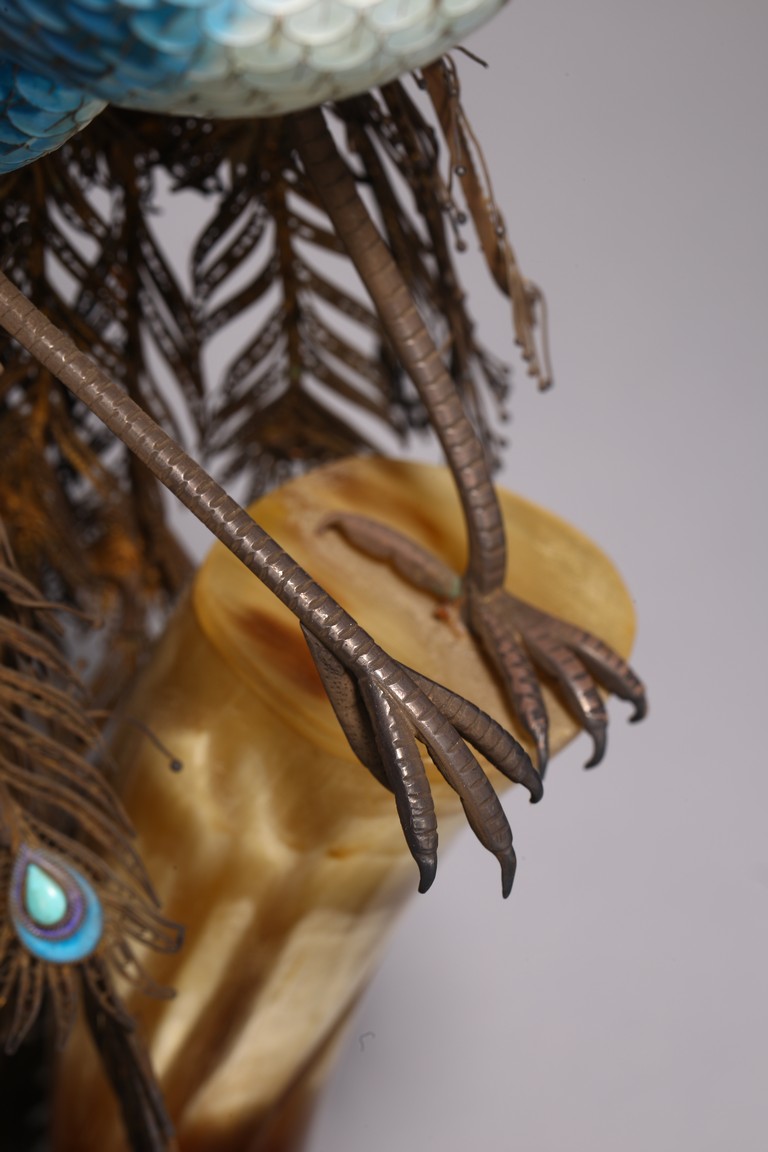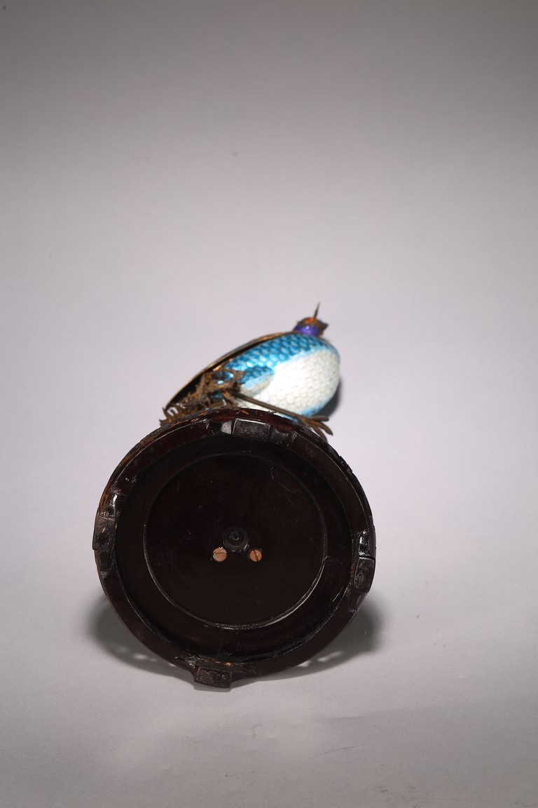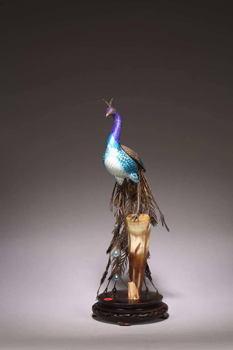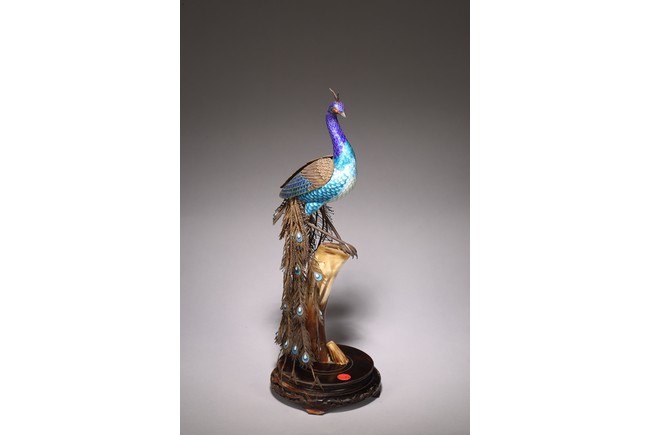 Chinese. Made from enamelled and gilded (gold-plated) silver and silver filigree. The tail feathers are also inset with large pear-shaped turquoise cabochons.decorated with light and dark blue, light green and cream enamel. Qing Dynasty period.