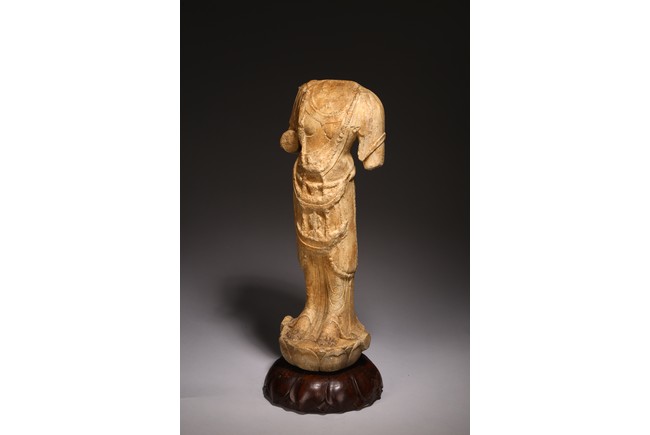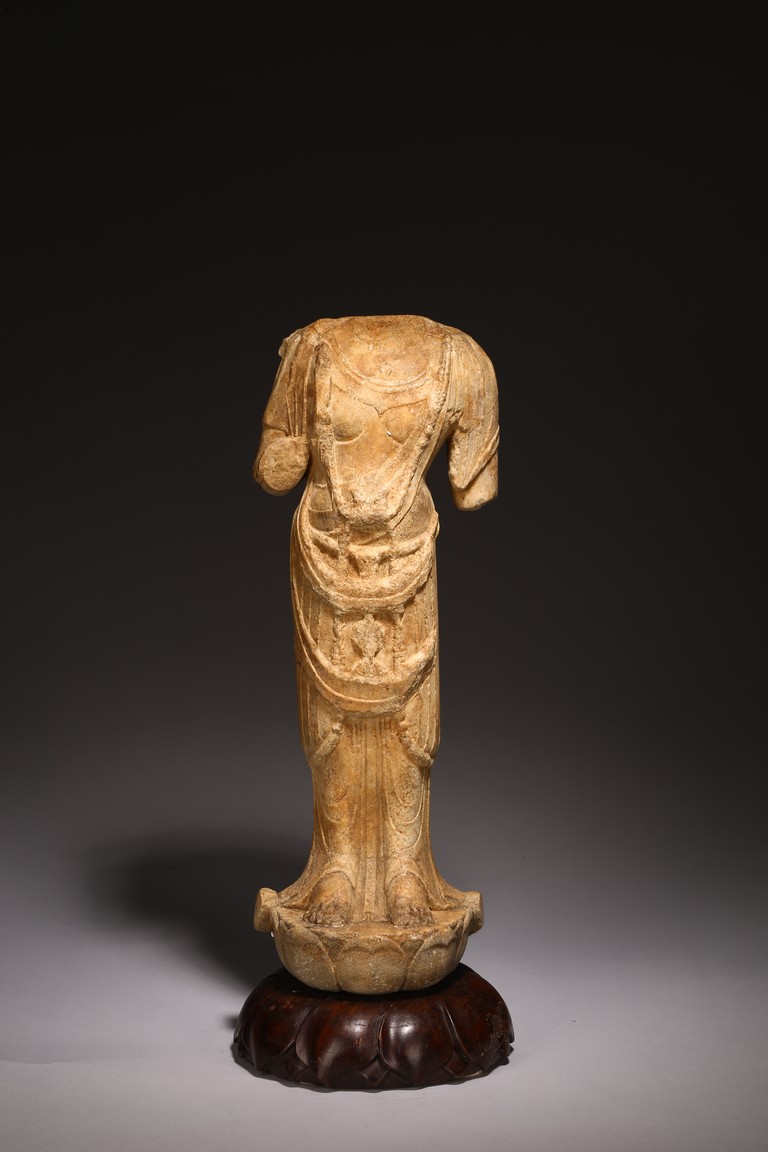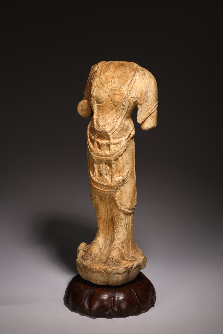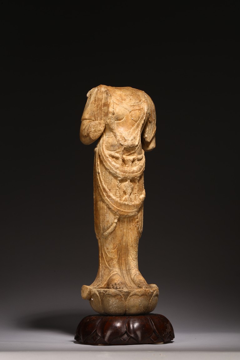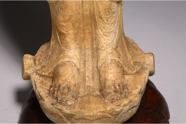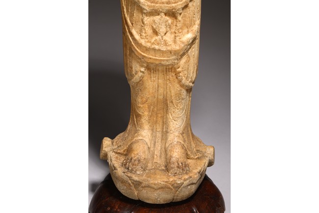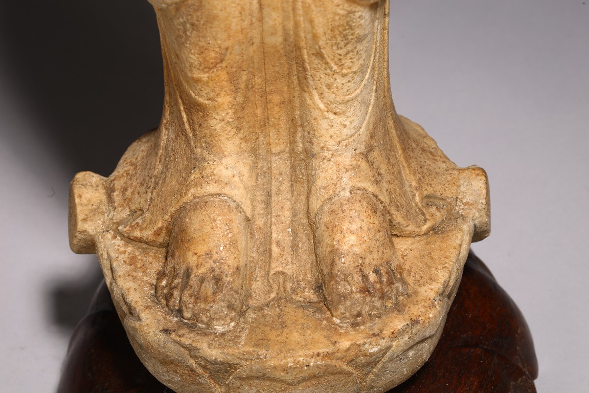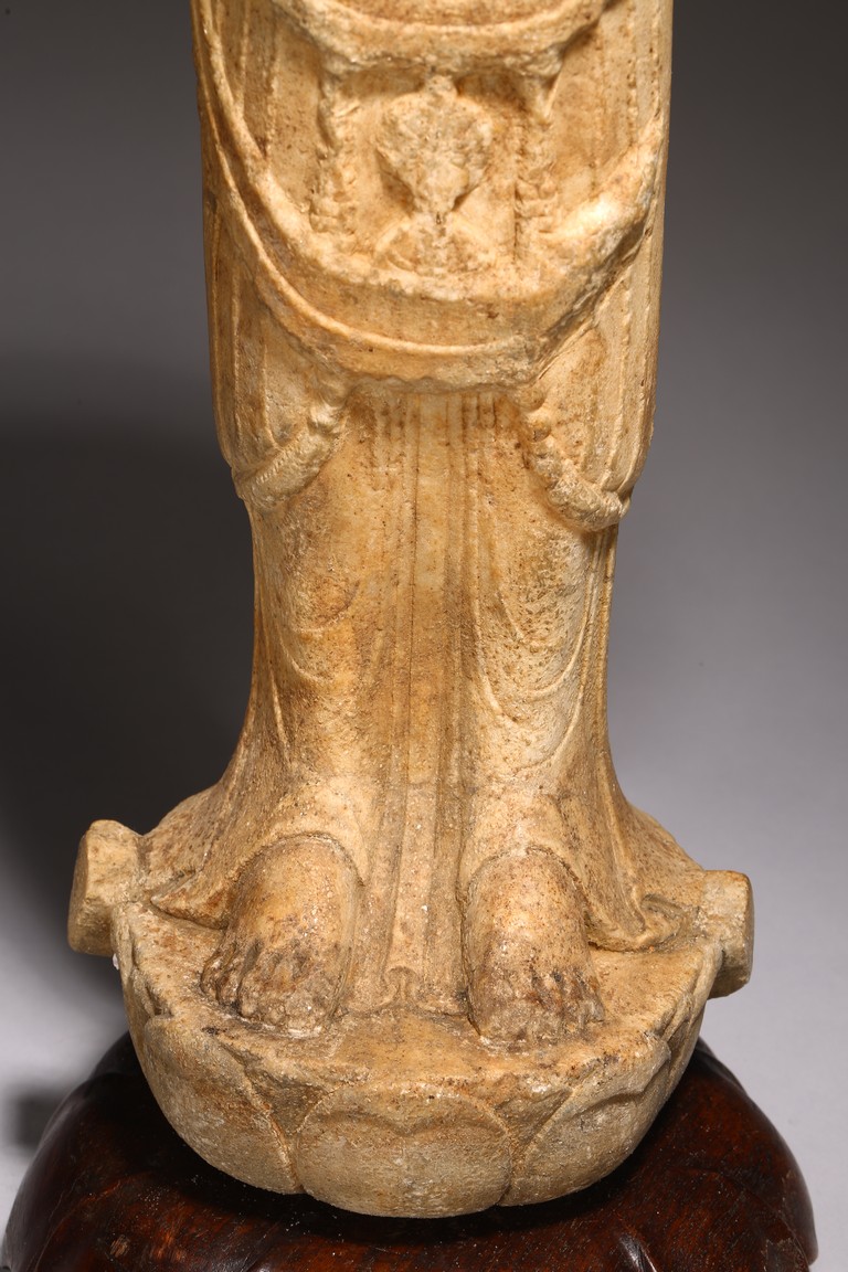 Chinese. shown standing on a lotus-pod-shaped plinth, and dressed in long monastic robes falling in neat symmetrical folds to the bare feet, rosewood stand. Tang Dynasty period.