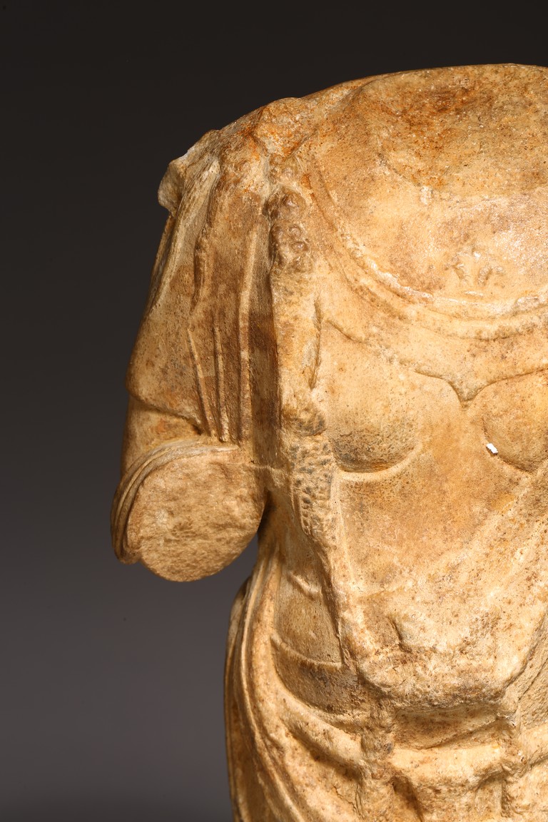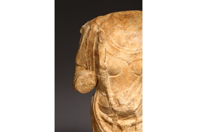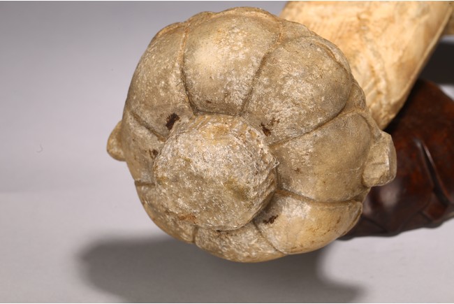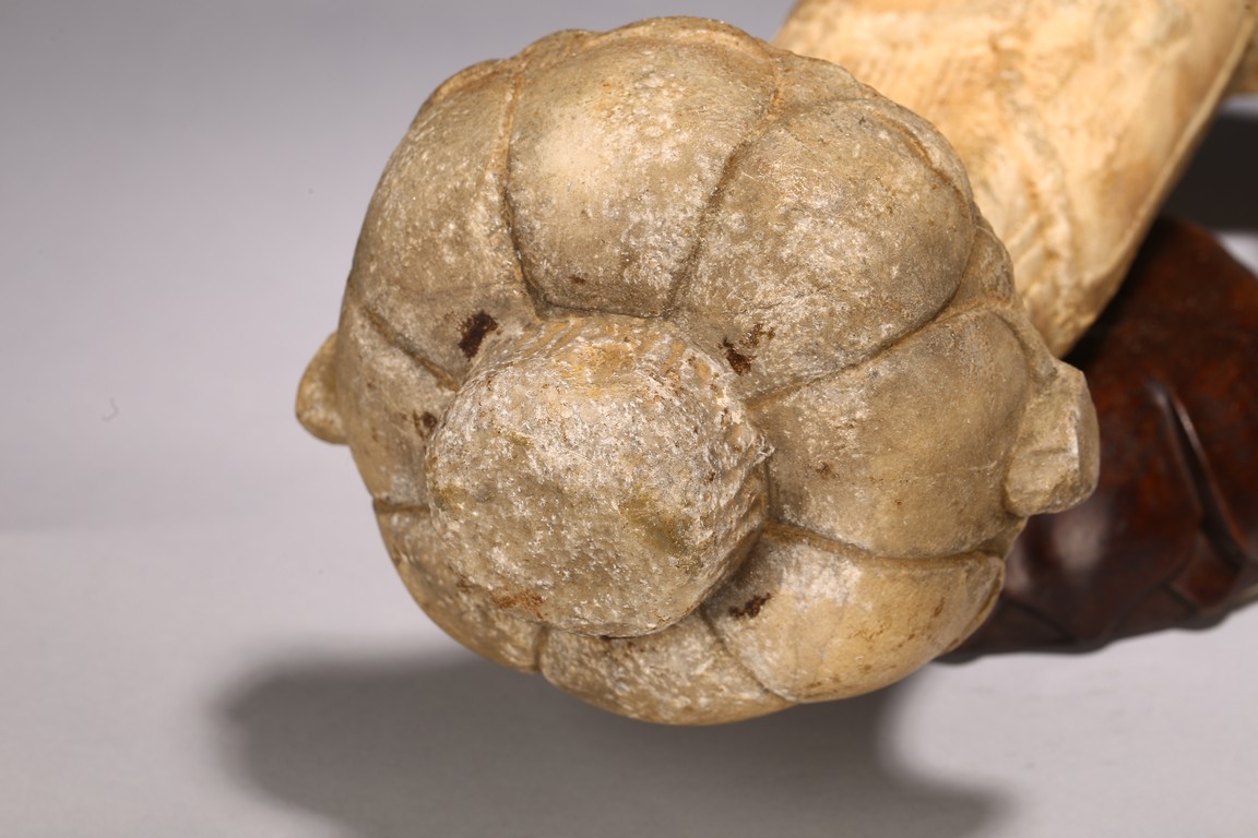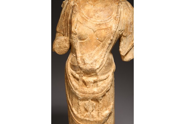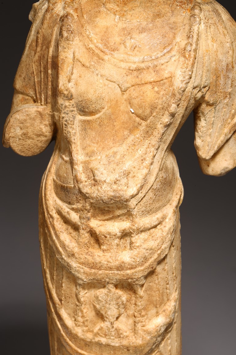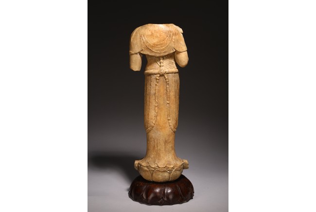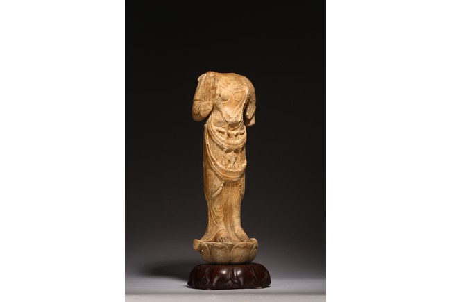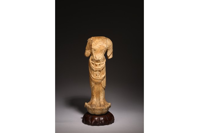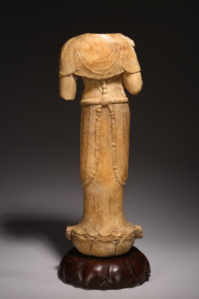 Chinese. shown standing on a lotus-pod-shaped plinth, and dressed in long monastic robes falling in neat symmetrical folds to the bare feet, rosewood stand. Tang Dynasty period.
