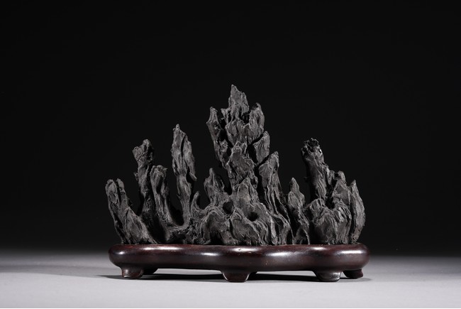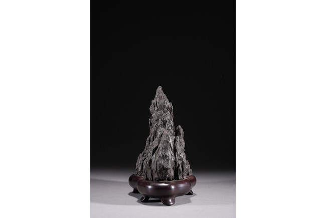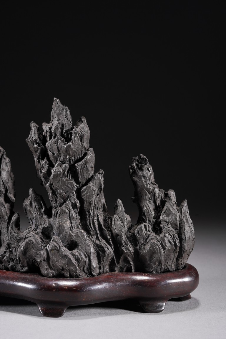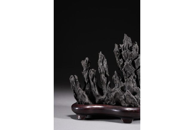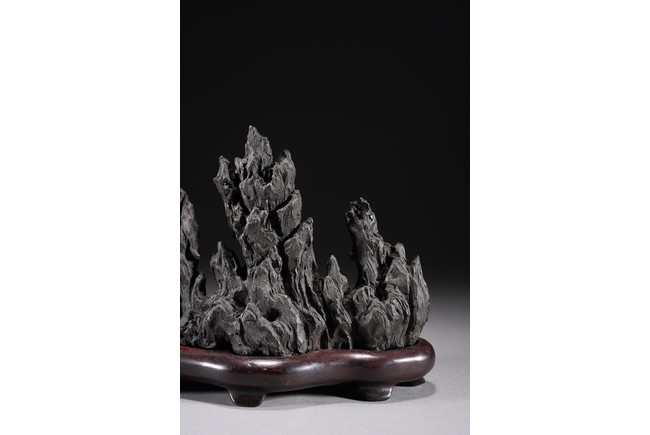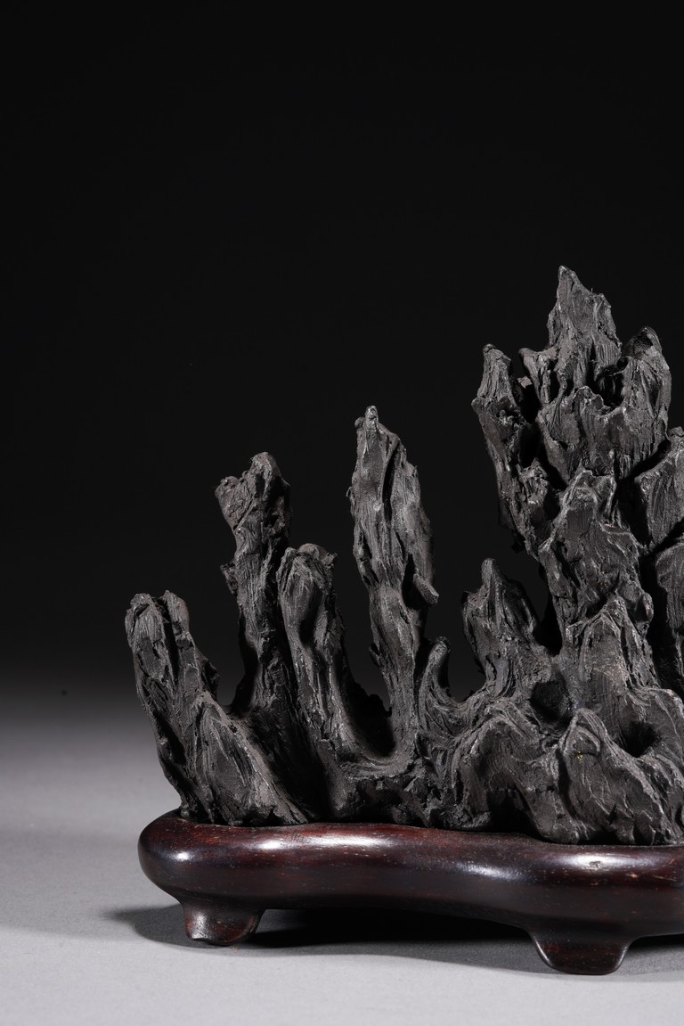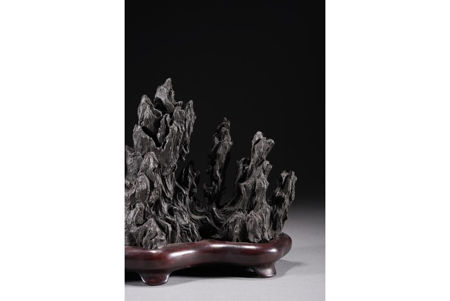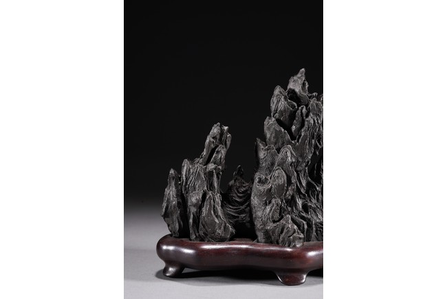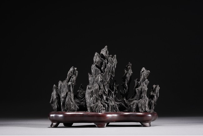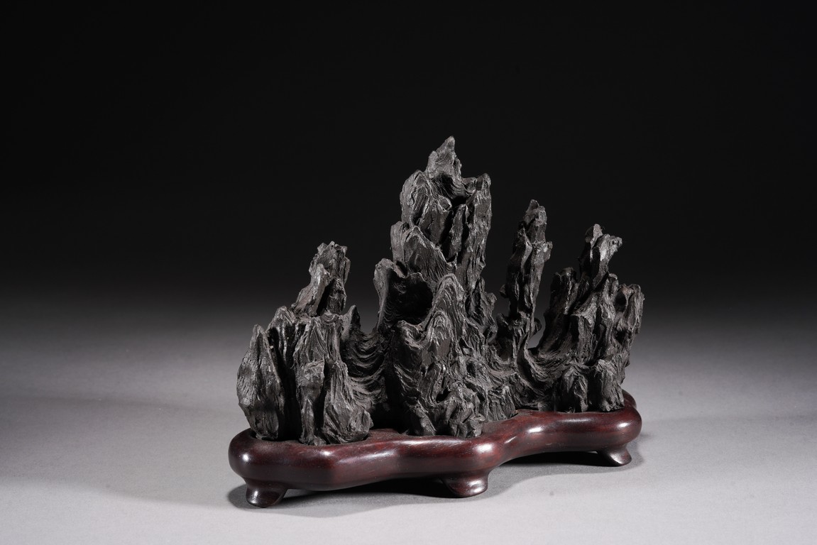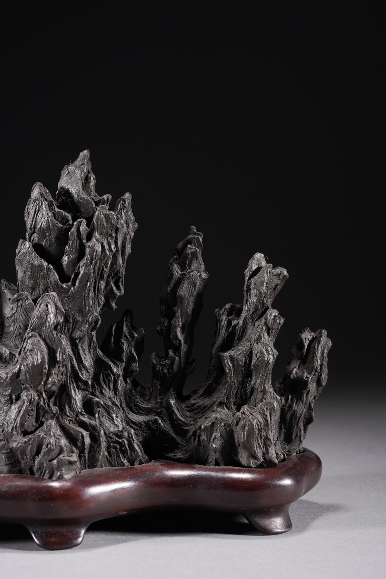 Chinese. Carved in the form of a multiple-peak mountain, covered with crevices, ridges and jagged protrusions, rosewood stand. Qing Dynasty period.