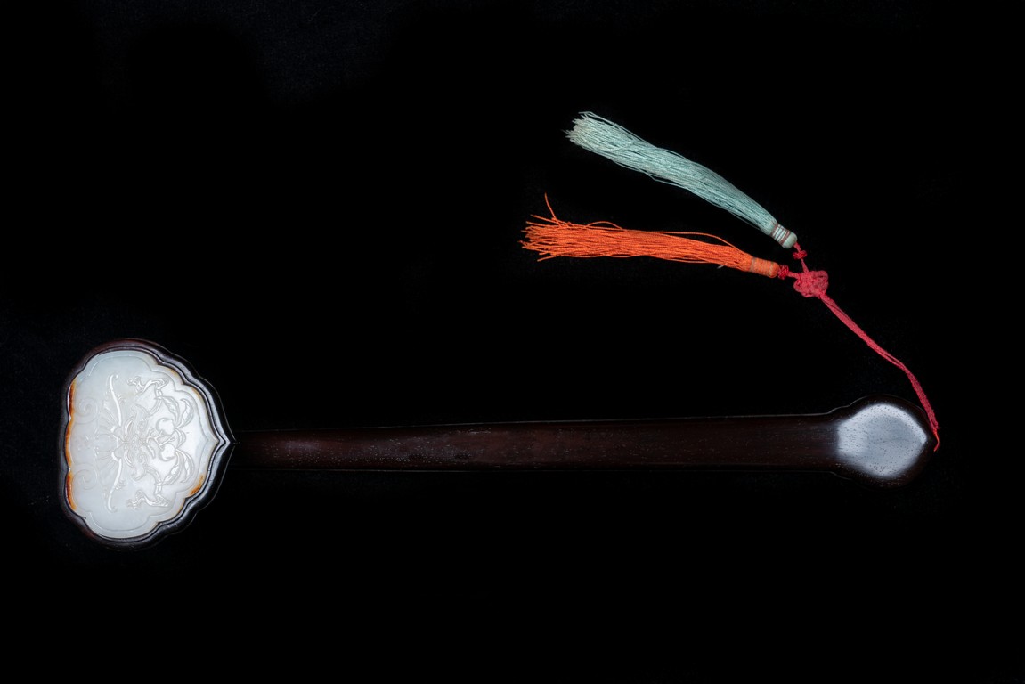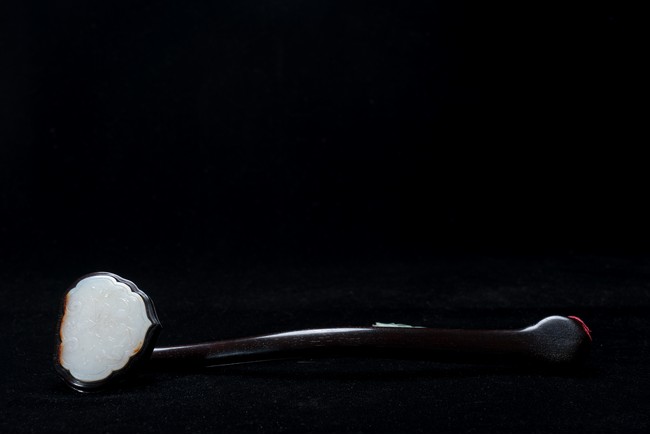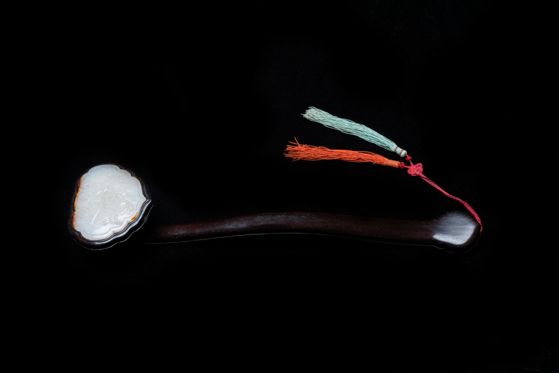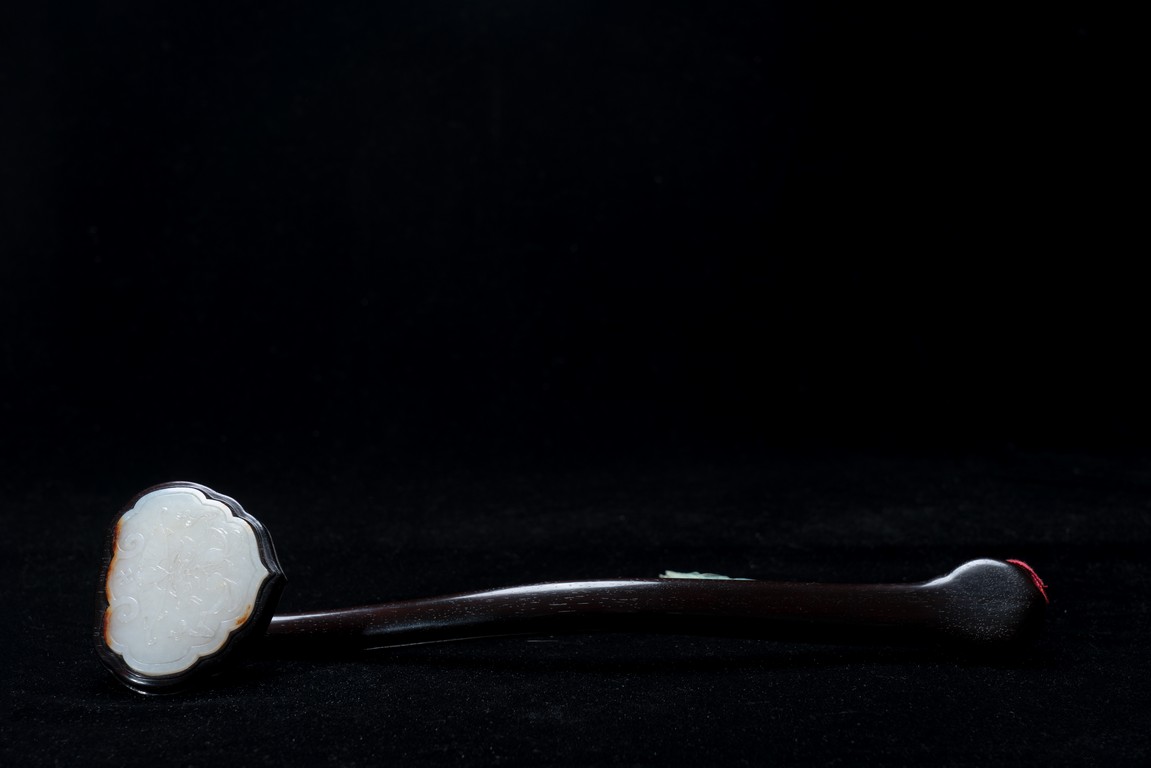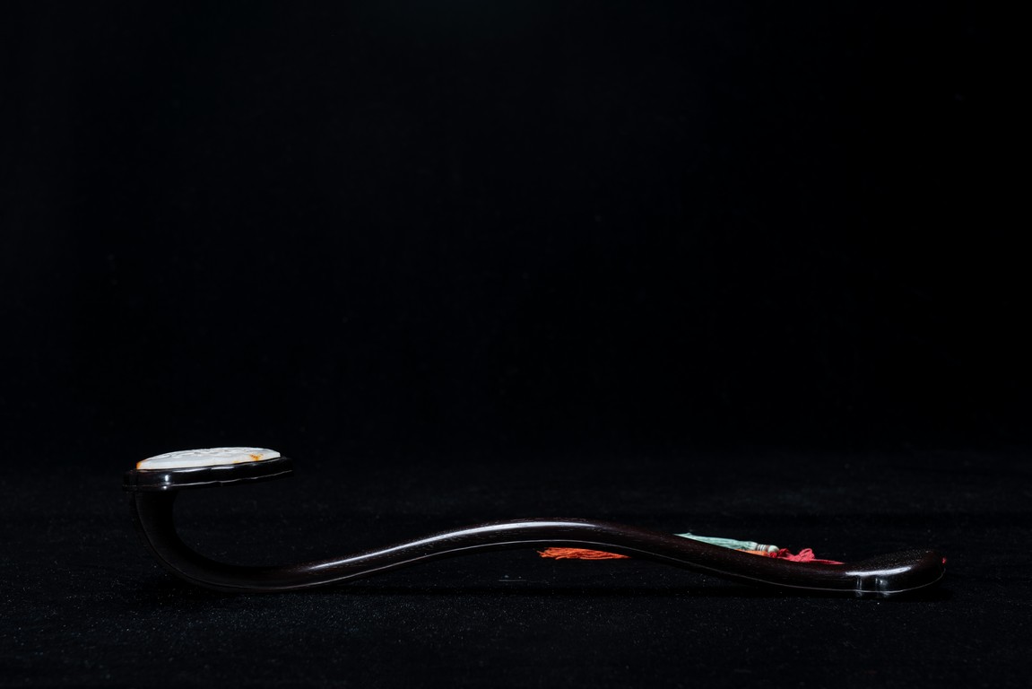 如意雖源於古代的抓癢工具,但隨著文人的隨身喜用,發展到清代之際,如意似乎已然是富含祥瑞表徵的祈福珍品。乾隆皇帝於燕閒清居時,手中大多會揣著如意。乾隆即曾於其御製詩提及:「處處座之傍,率陳如意常,雖圖語告吉,艱致兆頻祥。」鮮見當時帝王對如意的喜好,確實情有獨鍾。如意紅木製成,器身一木連作,與首部玉瓦托銜接,其嚴絲合縫,渾然一體。木色純正,紋理清晰,顏色黑紅。如意云葉式首,鑲嵌白玉,玉質潔白細膩,瑩潤光潔,如脂如膏,光亮十足。淺浮雕刻“卐字紋”“蝙蝠”“玉磬”“壽桃”,寓意美好,有福壽雙全之意。柄身中部隆起,自上而下漸寬,曲線優美。整器造型雍容端莊,曲線婉轉流暢,結構嚴謹有度,形制典雅,彰顯出至尊無上的皇家氣息。配有老穗。
