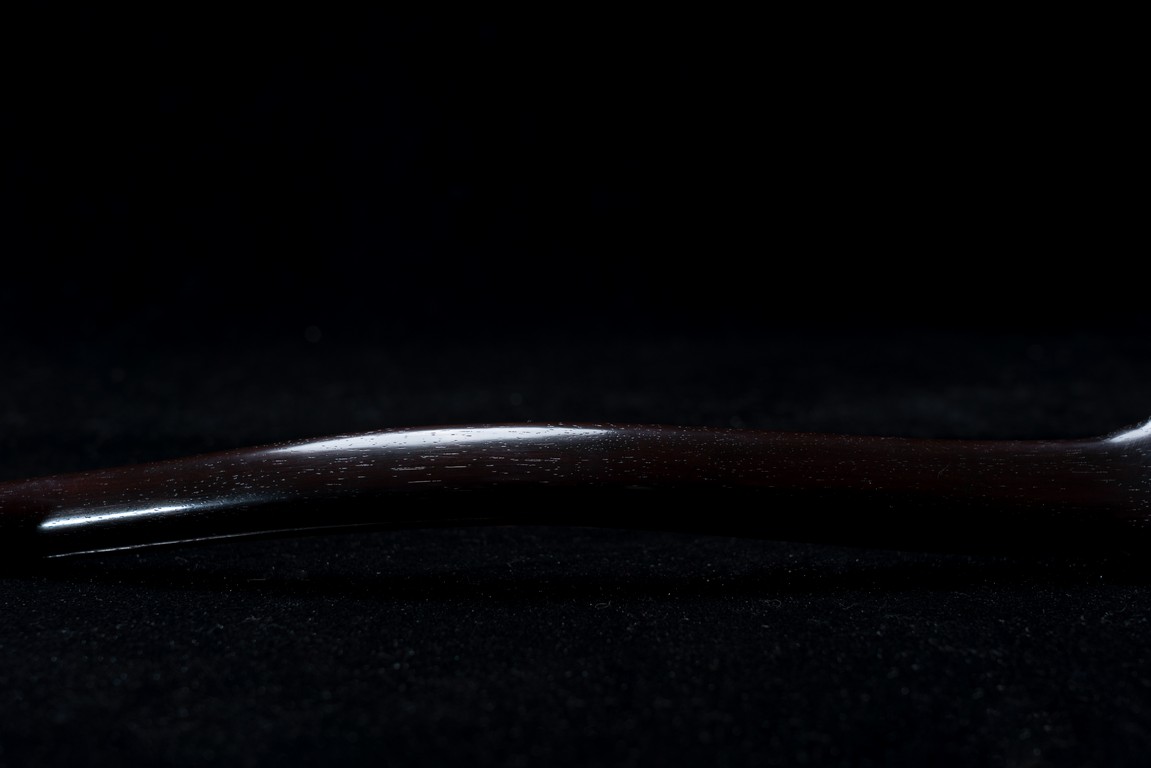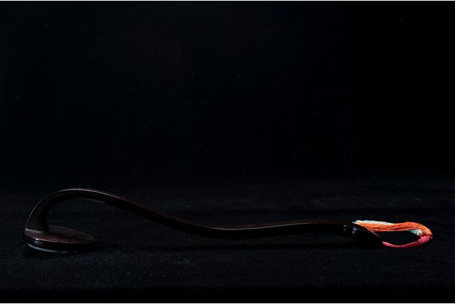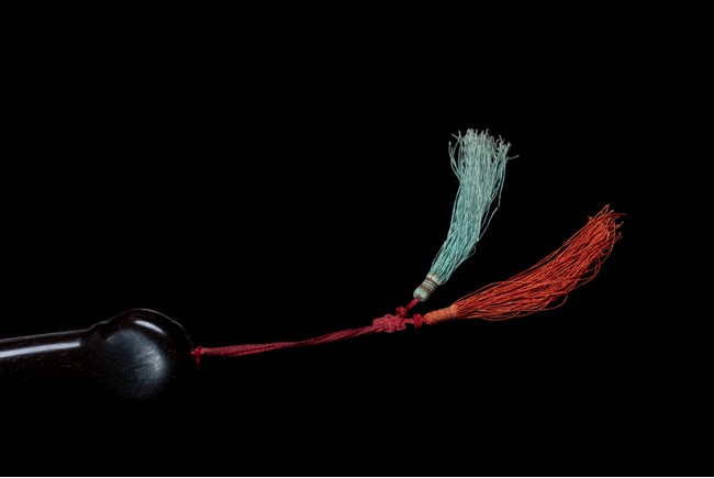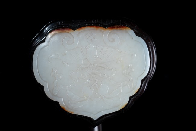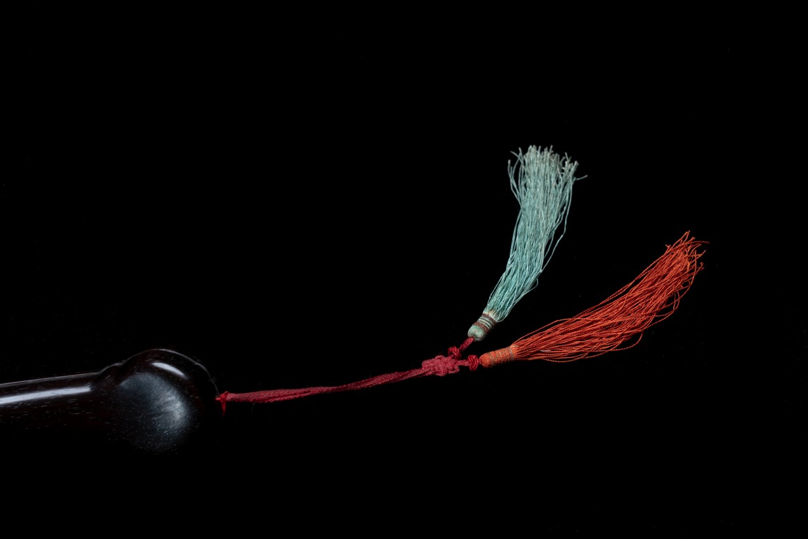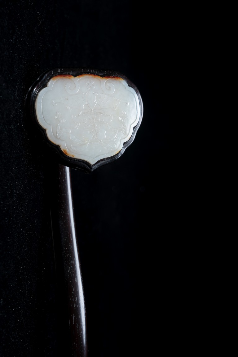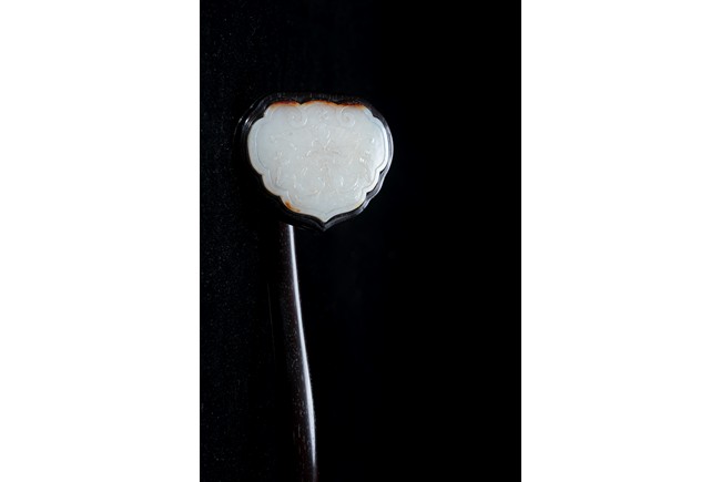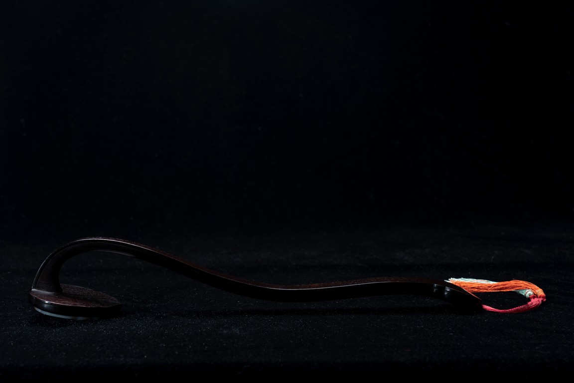 如意雖源於古代的抓癢工具,但隨著文人的隨身喜用,發展到清代之際,如意似乎已然是富含祥瑞表徵的祈福珍品。乾隆皇帝於燕閒清居時,手中大多會揣著如意。乾隆即曾於其御製詩提及:「處處座之傍,率陳如意常,雖圖語告吉,艱致兆頻祥。」鮮見當時帝王對如意的喜好,確實情有獨鍾。如意紅木製成,器身一木連作,與首部玉瓦托銜接,其嚴絲合縫,渾然一體。木色純正,紋理清晰,顏色黑紅。如意云葉式首,鑲嵌白玉,玉質潔白細膩,瑩潤光潔,如脂如膏,光亮十足。淺浮雕刻“卐字紋”“蝙蝠”“玉磬”“壽桃”,寓意美好,有福壽雙全之意。柄身中部隆起,自上而下漸寬,曲線優美。整器造型雍容端莊,曲線婉轉流暢,結構嚴謹有度,形制典雅,彰顯出至尊無上的皇家氣息。配有老穗。
