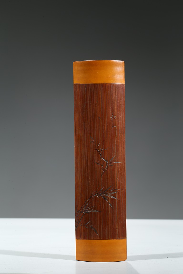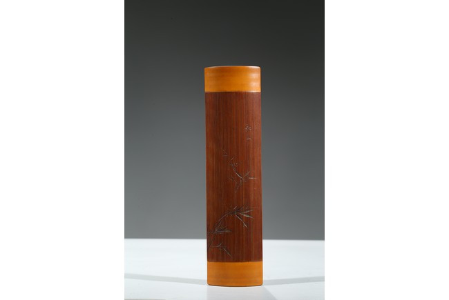 此件臂擱以竹為材,兩端貼竹黃,上刻竹圖,自然流暢,極富筆情墨趣。竹枝蒼勁雄渾,竹葉有如屈鐵,所表現的各個時節的竹風,無不生動有致。刀法犀利,凹凸抑揚,纖細曲折。 “松山”款識。吳嵩山,一作松山,清代嘉定竹刻名家,居南翔寺,後流寓維揚。師從週芷岩學畫刻竹,工畫,亦擅竹刻。
