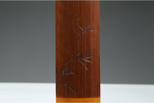 The arced section of bamboo incised with leafy bamboo decorations, inscribed by Song Shan. Qing Dynasty period.