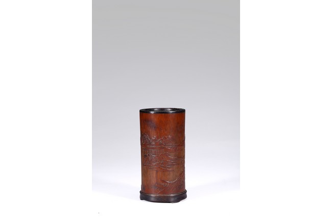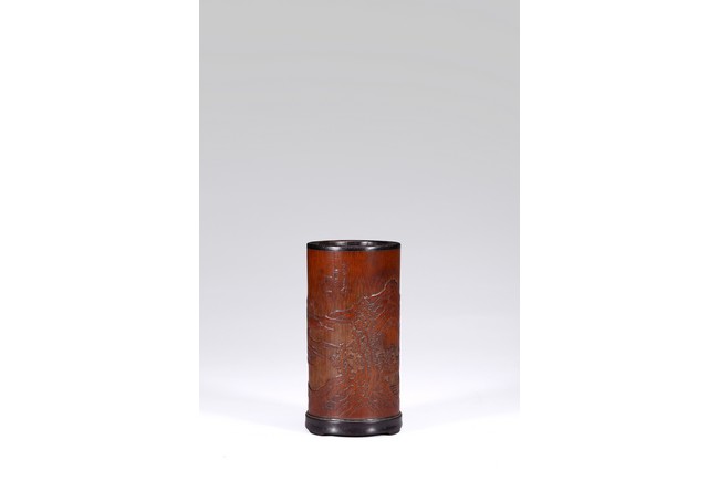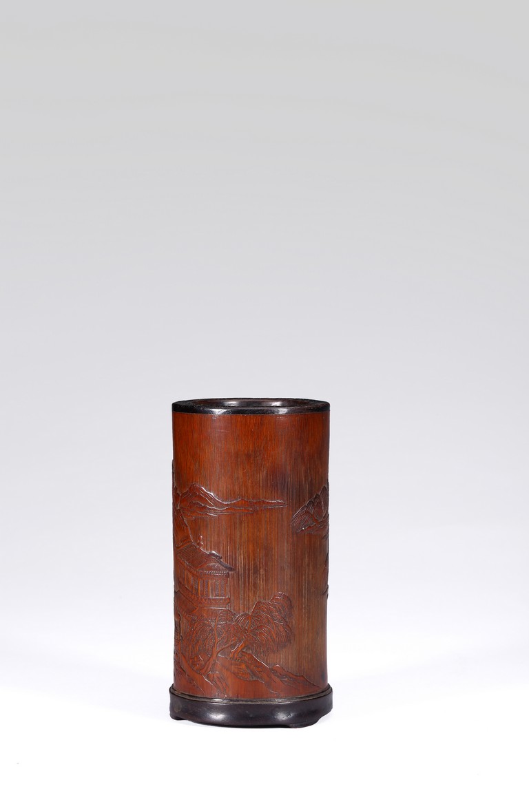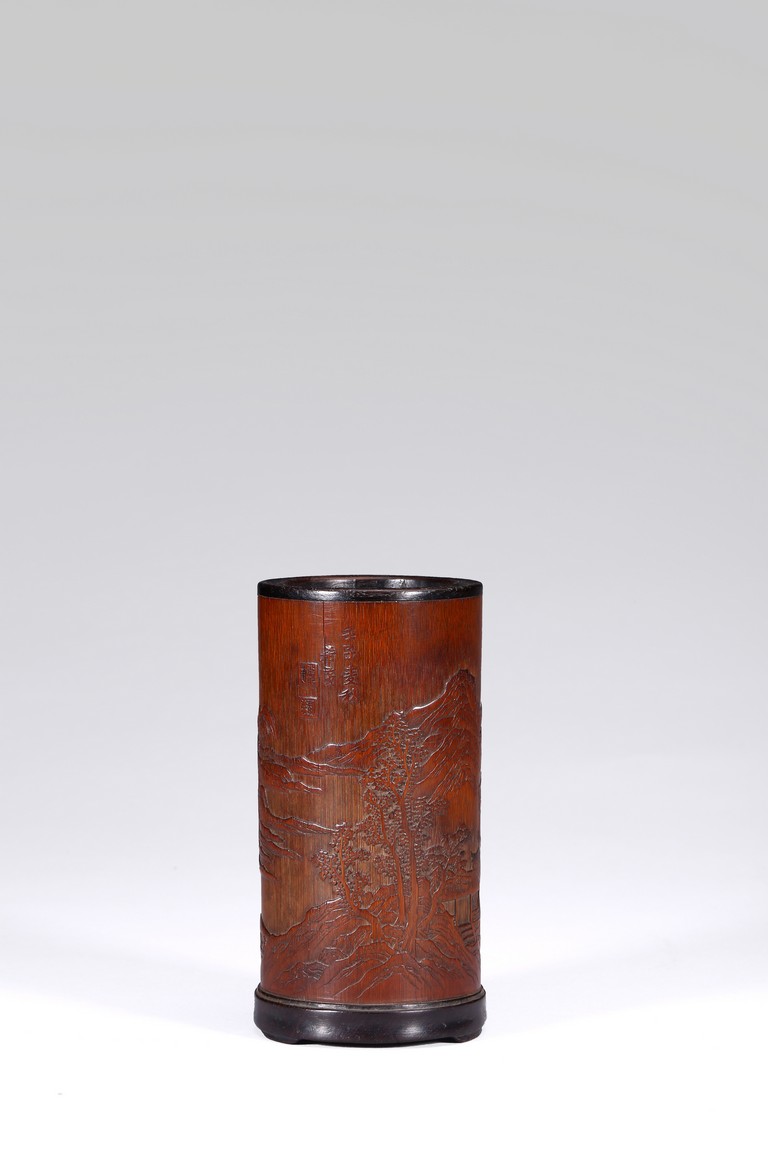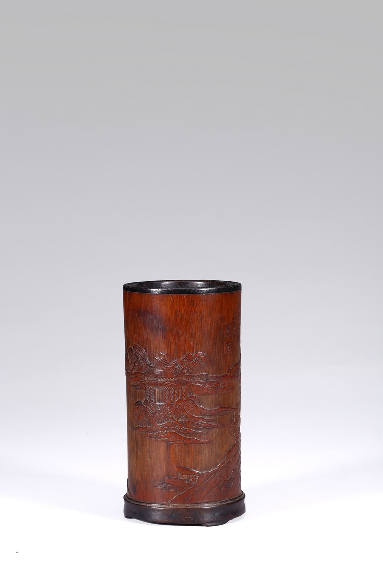Of cylindrical form and supported on three short feet, the body finely carved in low relief with riverscape scene with mountains and cottages, with carved inscription and signed Xi Huang with seal marks. Late Ming Dynasty period