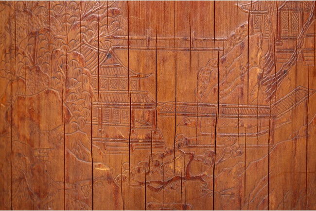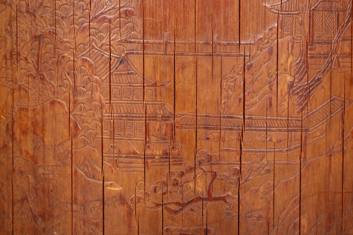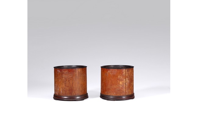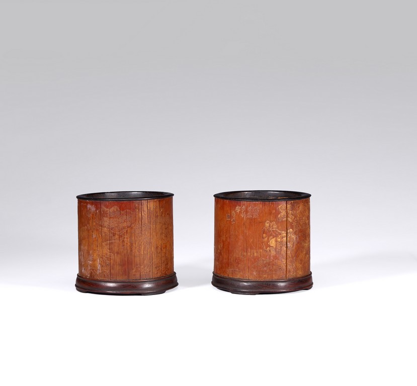 Of circular shape and mounted on hardwood, each brushpot is skillfully carved through the ochreous skin to the brownish red body with landscape scene, one decorated with an entrance to the front leading to the pavilions and palaces inside, surrounded by different varieties of trees emerging from the rocky outcrops, to the left with a fisherman rowing a boat by the bank, above with a seven character inscription and artist's signature 'XI HUANG' and two seal marks, the reverse with an arched bridge linking two rocky hills; the other carved with similar landscape with three figures walking on the riverside below a circular seal mark and a rectangular seal mark. Late Ming Dynasty period.