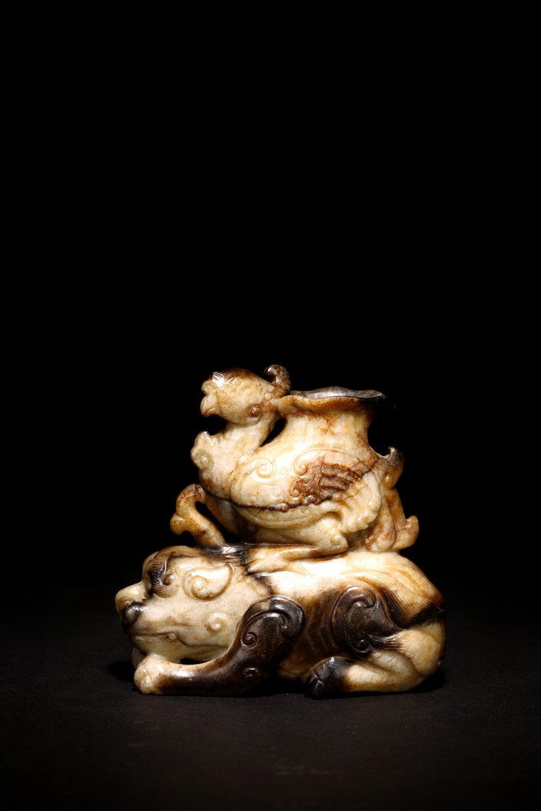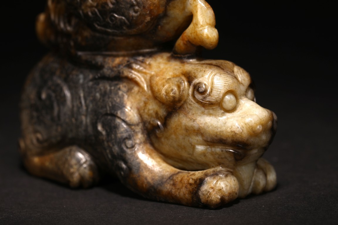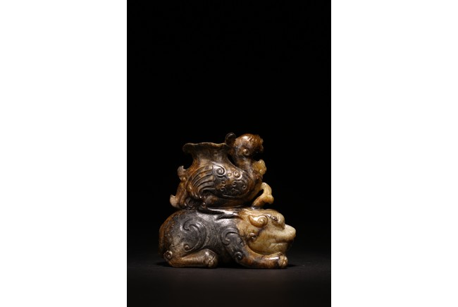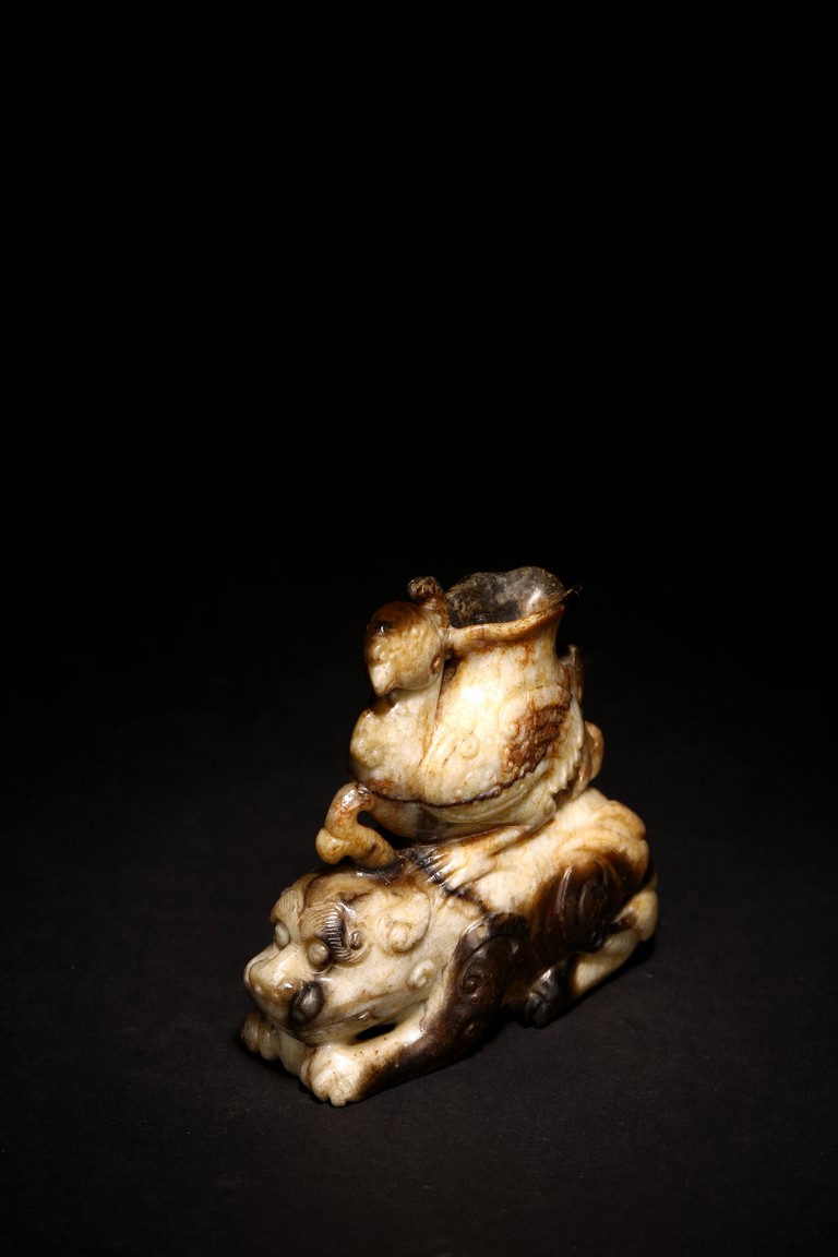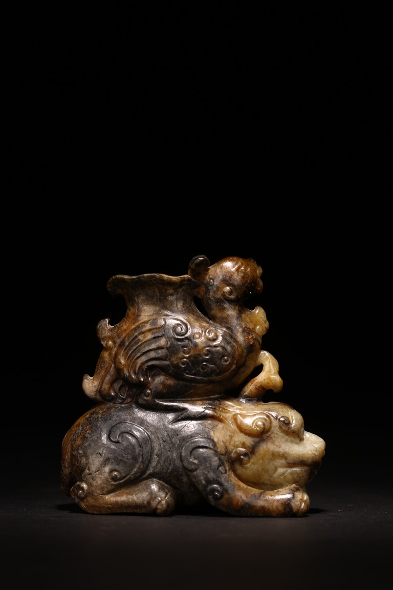 Chinese. Depicted recumbent with legs tucked beneath its body and bushy tail curled alongside its rear haunches, his back supporting a phoenix with detailed plumage and wings, on its back rests an opening. The stone is of mottled russet and white tone.