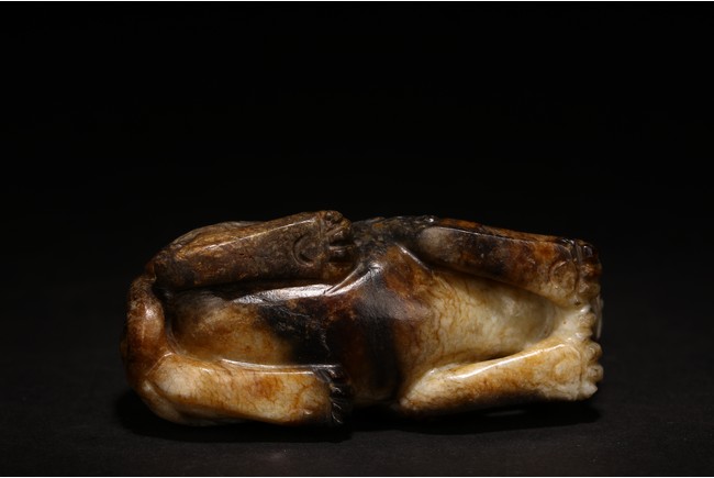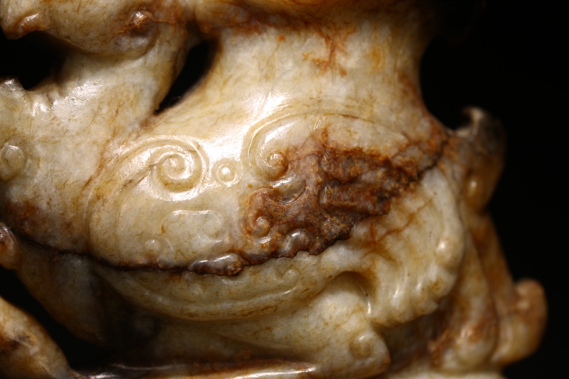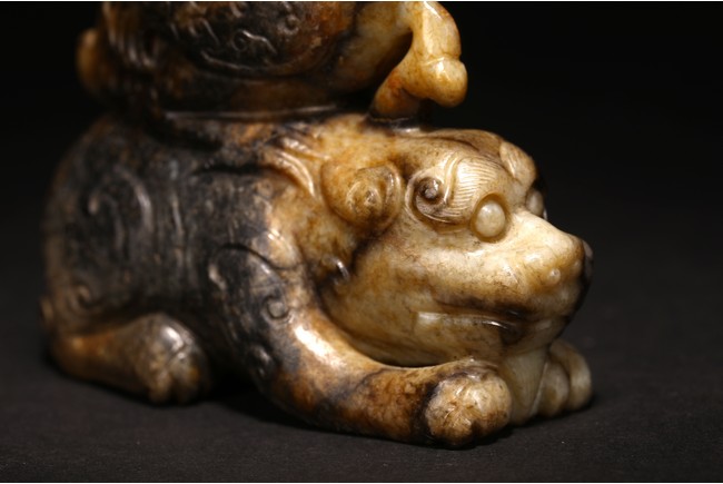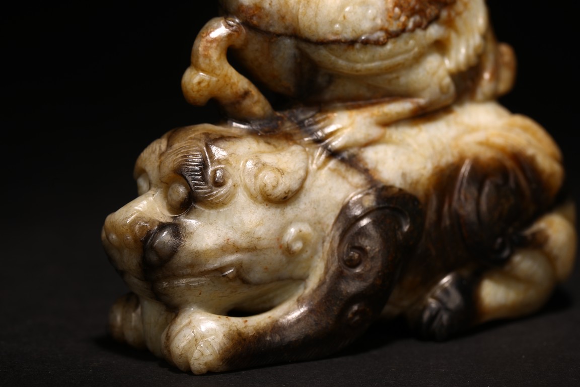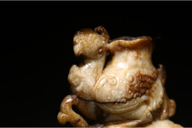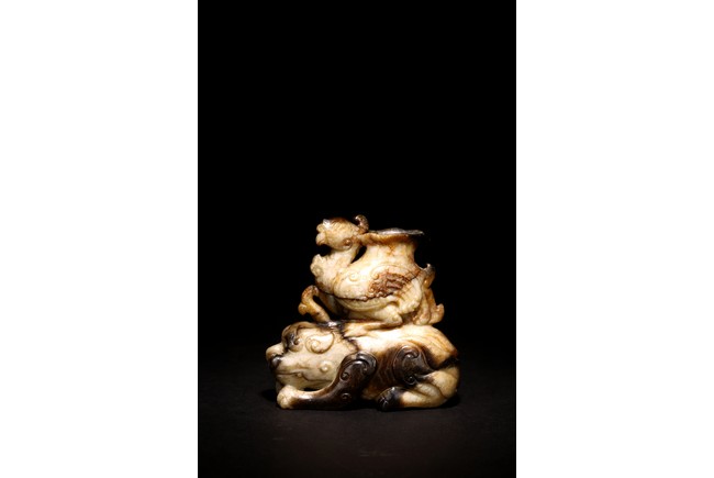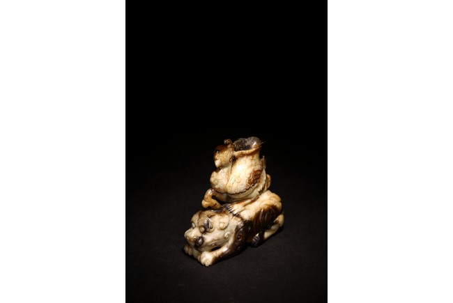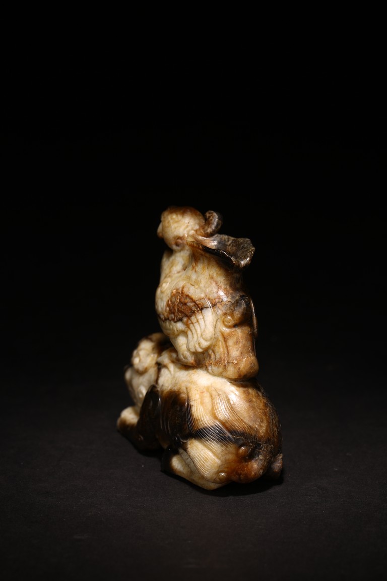 Chinese. Depicted recumbent with legs tucked beneath its body and bushy tail curled alongside its rear haunches, his back supporting a phoenix with detailed plumage and wings, on its back rests an opening. The stone is of mottled russet and white tone.
