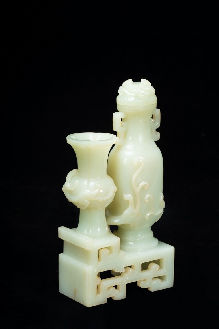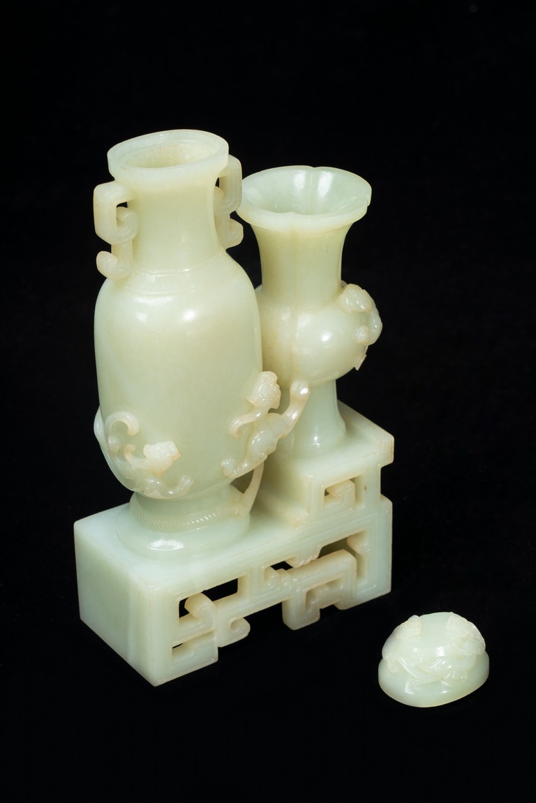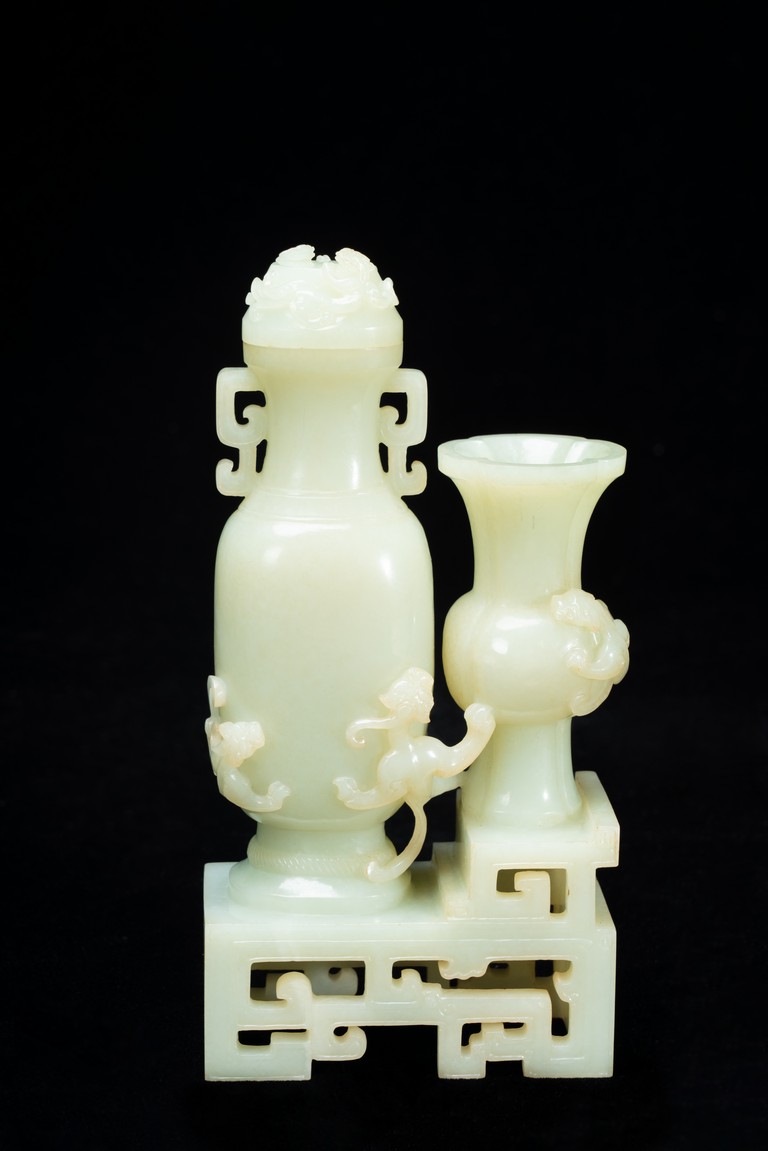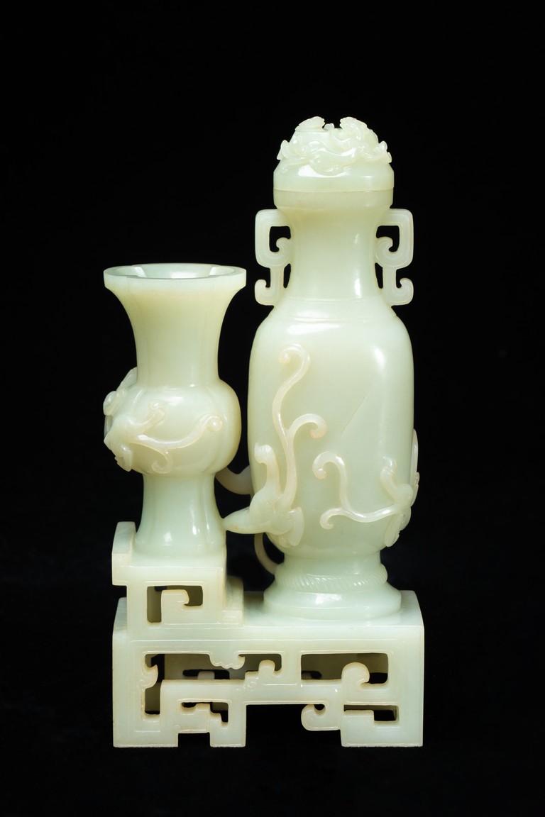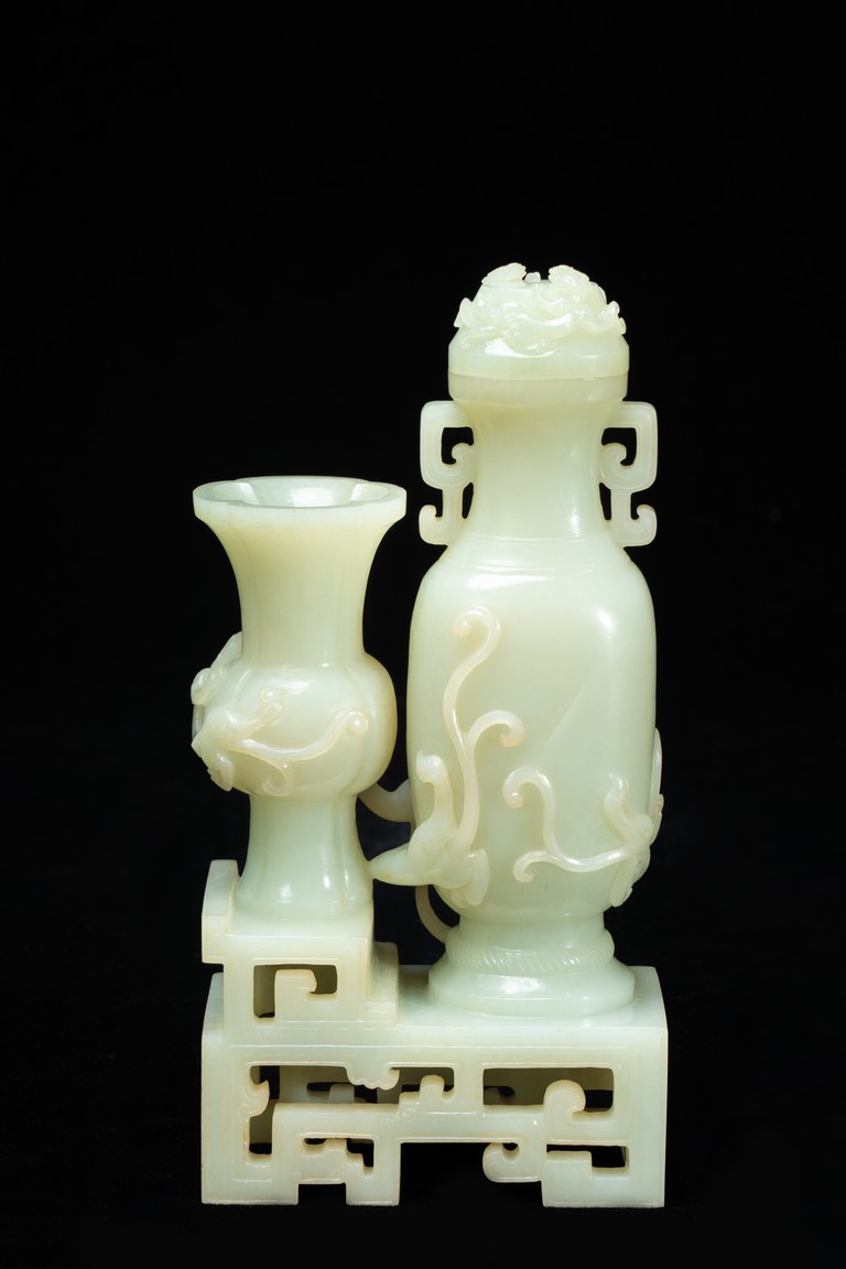 乾隆至嘉慶初年裡宮廷制玉之巔峰時期,造型千奇百怪,工藝精湛,本件拍品即為其中一例。聯瓶屬於瓶式之一,因兩瓶合為一器而名,器型源於新石器時代的雙聯壺,於清代之時極為流行,乾隆年間的合歡瓶即屬此類。本品選用上等和闐玉製成,溫潤滑膩,色澤瑩潤雅緻。採用深浮雕、鏤雕、圓雕等技法雕製而成,雙瓶分別為“蓋瓶”“花觚”,造型雅緻,一高一低,一胖一瘦,交錯相連,錯落有致,匠心獨運,。蓋瓶中間掏膛,,工藝精湛,膛腔光滑平整,子母口嚴絲合縫,蓋上雕琢雙螭龍,雕工精湛。束頸飾雙耳,直腹,圈足飾“絞絲紋”外撇。花觚花口外撇,鼓腹,圈足微撇。螭龍身軀挺健,昂首張目,俯身踞於雙瓶間,情勢生動,形象逼真,活靈活現。底座鏤空製成,高低錯落,線條流暢,嚴謹精緻。整體線條硬朗有力,刀法運用靈活,技藝極為精湛。此器無論質地、工藝都堪稱上品,充分反映乾隆宮廷的工藝水準及審美趣味,藝術價值極高。來源: 内華達州拉斯維加斯重要私人收藏 Provenance: Property from an important collection, Las Vegas, Nevada