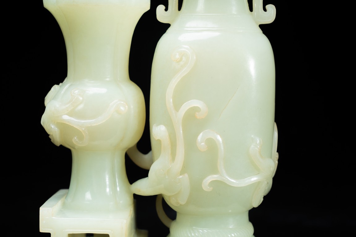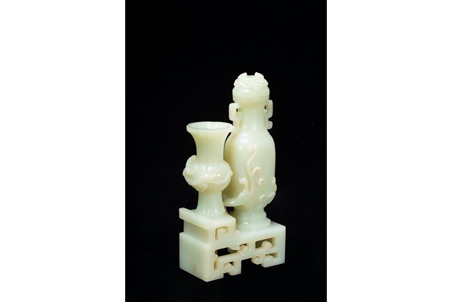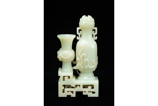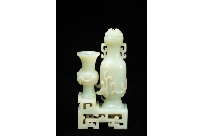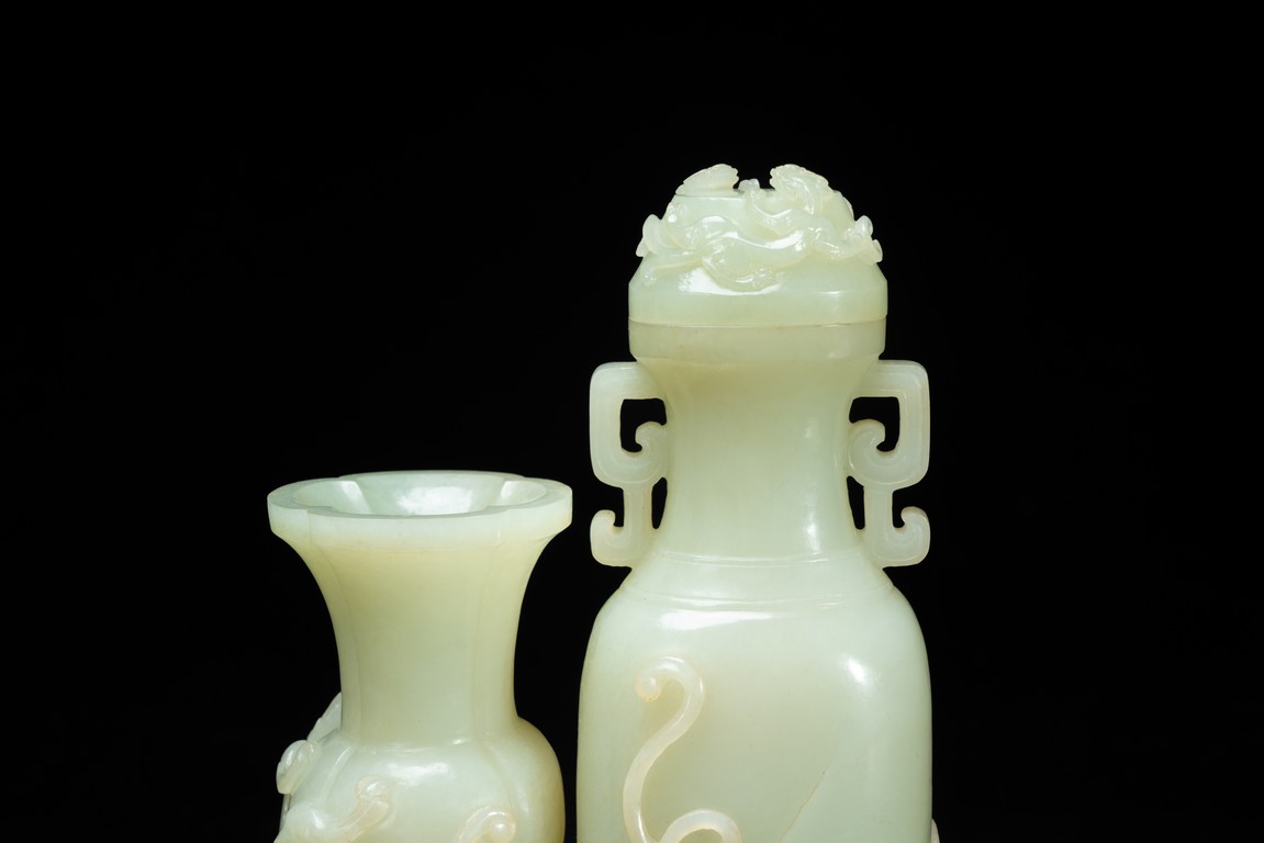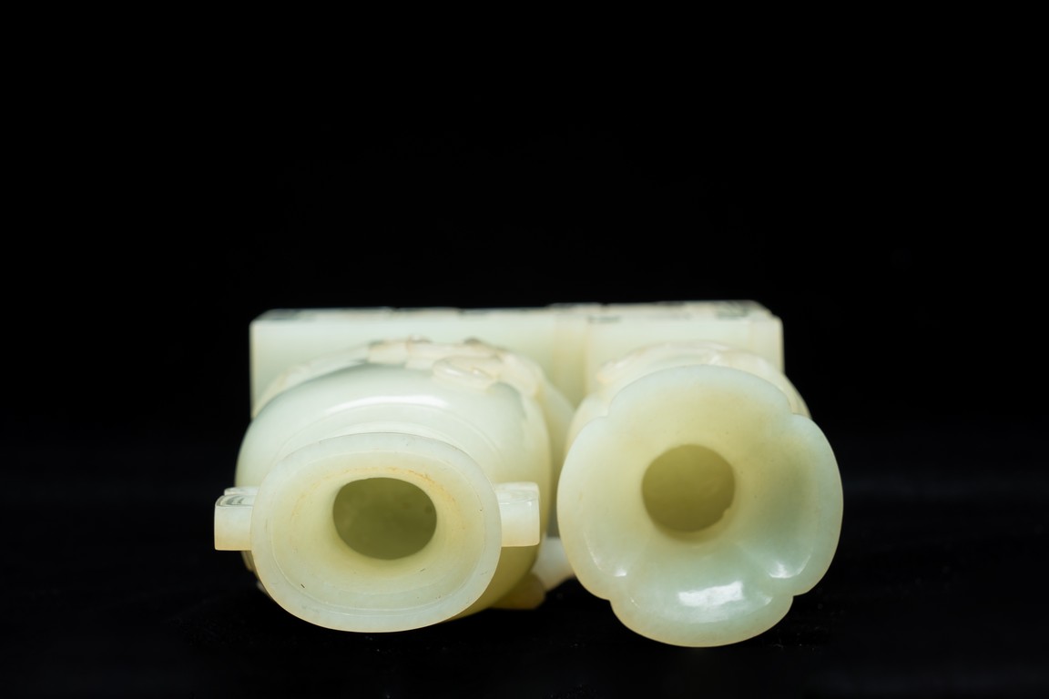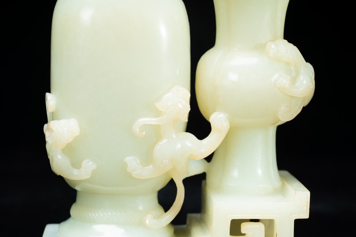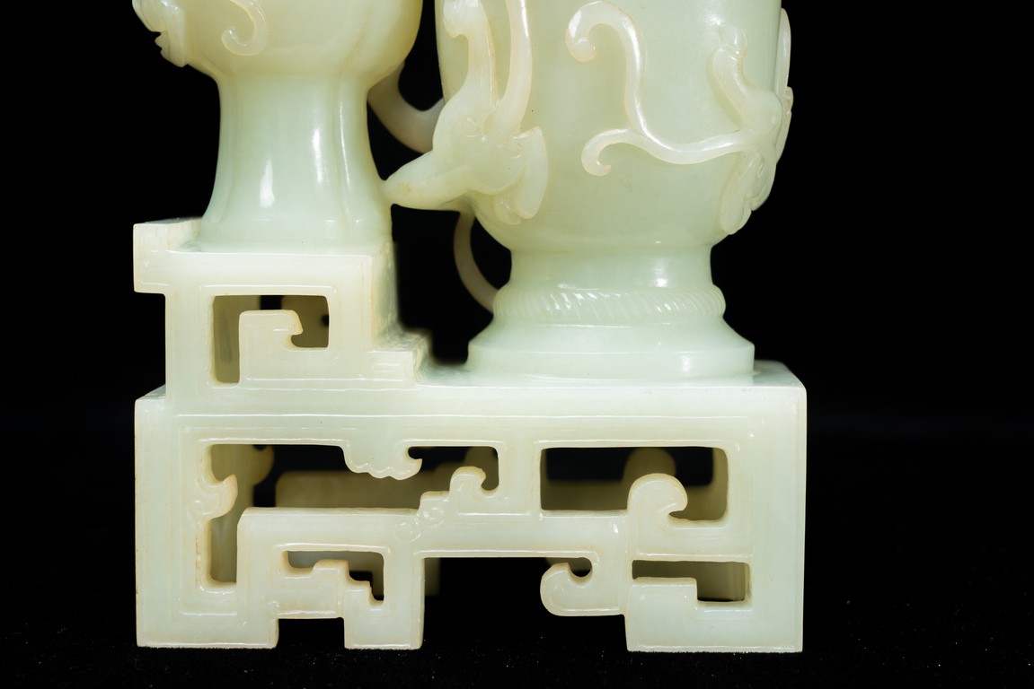 乾隆至嘉慶初年裡宮廷制玉之巔峰時期,造型千奇百怪,工藝精湛,本件拍品即為其中一例。聯瓶屬於瓶式之一,因兩瓶合為一器而名,器型源於新石器時代的雙聯壺,於清代之時極為流行,乾隆年間的合歡瓶即屬此類。本品選用上等和闐玉製成,溫潤滑膩,色澤瑩潤雅緻。採用深浮雕、鏤雕、圓雕等技法雕製而成,雙瓶分別為“蓋瓶”“花觚”,造型雅緻,一高一低,一胖一瘦,交錯相連,錯落有致,匠心獨運,。蓋瓶中間掏膛,,工藝精湛,膛腔光滑平整,子母口嚴絲合縫,蓋上雕琢雙螭龍,雕工精湛。束頸飾雙耳,直腹,圈足飾“絞絲紋”外撇。花觚花口外撇,鼓腹,圈足微撇。螭龍身軀挺健,昂首張目,俯身踞於雙瓶間,情勢生動,形象逼真,活靈活現。底座鏤空製成,高低錯落,線條流暢,嚴謹精緻。整體線條硬朗有力,刀法運用靈活,技藝極為精湛。此器無論質地、工藝都堪稱上品,充分反映乾隆宮廷的工藝水準及審美趣味,藝術價值極高。來源: 内華達州拉斯維加斯重要私人收藏 Provenance: Property from an important collection, Las Vegas, Nevada