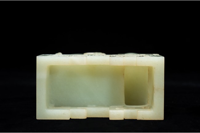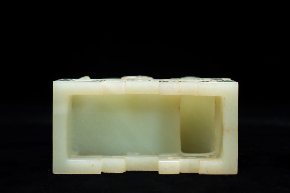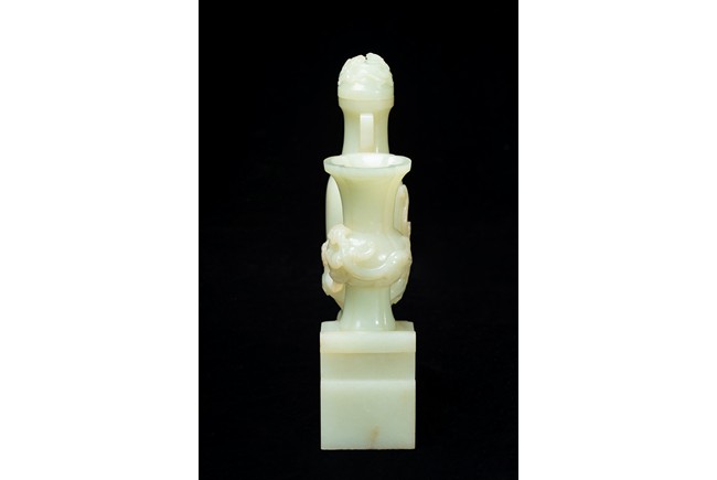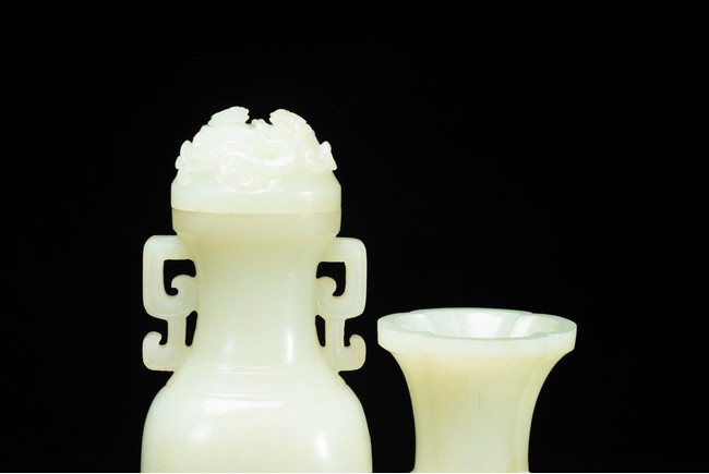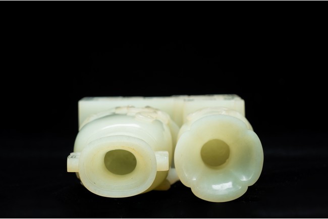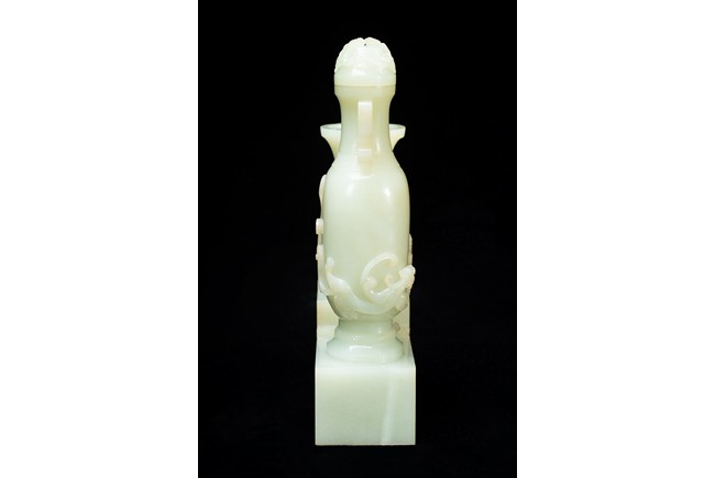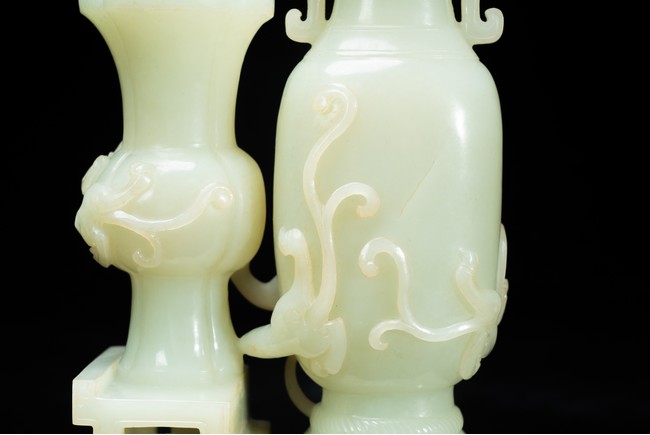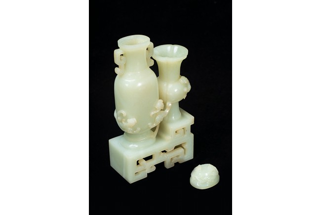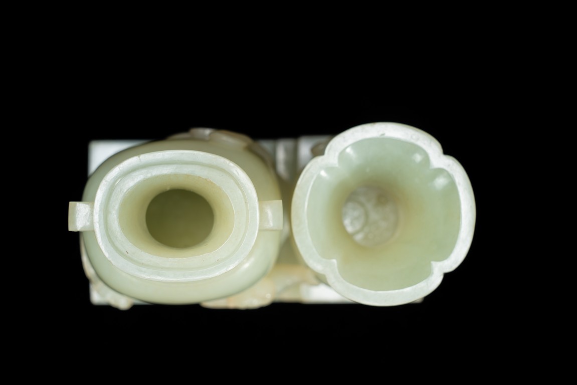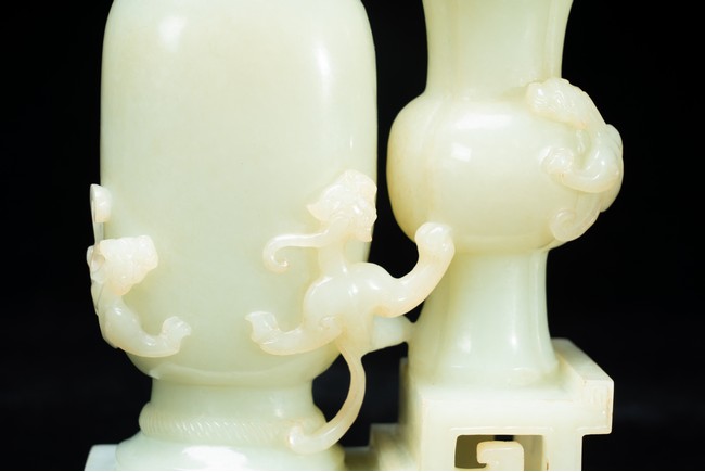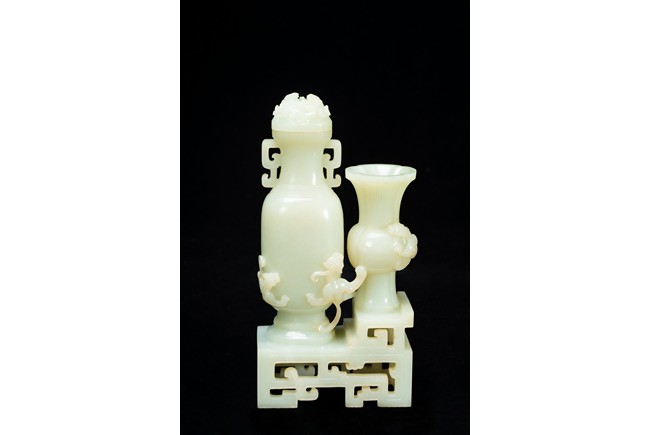乾隆至嘉慶初年裡宮廷制玉之巔峰時期,造型千奇百怪,工藝精湛,本件拍品即為其中一例。聯瓶屬於瓶式之一,因兩瓶合為一器而名,器型源於新石器時代的雙聯壺,於清代之時極為流行,乾隆年間的合歡瓶即屬此類。本品選用上等和闐玉製成,溫潤滑膩,色澤瑩潤雅緻。採用深浮雕、鏤雕、圓雕等技法雕製而成,雙瓶分別為“蓋瓶”“花觚”,造型雅緻,一高一低,一胖一瘦,交錯相連,錯落有致,匠心獨運,。蓋瓶中間掏膛,,工藝精湛,膛腔光滑平整,子母口嚴絲合縫,蓋上雕琢雙螭龍,雕工精湛。束頸飾雙耳,直腹,圈足飾“絞絲紋”外撇。花觚花口外撇,鼓腹,圈足微撇。螭龍身軀挺健,昂首張目,俯身踞於雙瓶間,情勢生動,形象逼真,活靈活現。底座鏤空製成,高低錯落,線條流暢,嚴謹精緻。整體線條硬朗有力,刀法運用靈活,技藝極為精湛。此器無論質地、工藝都堪稱上品,充分反映乾隆宮廷的工藝水準及審美趣味,藝術價值極高。來源: 内華達州拉斯維加斯重要私人收藏 Provenance: Property from an important collection, Las Vegas, Nevada