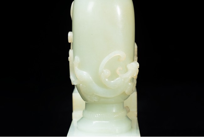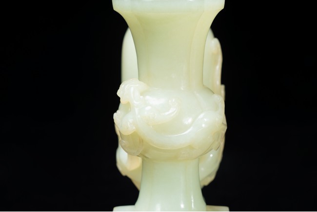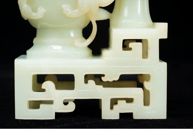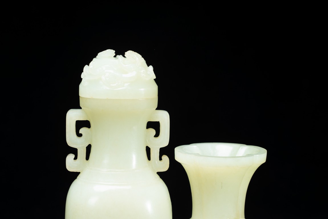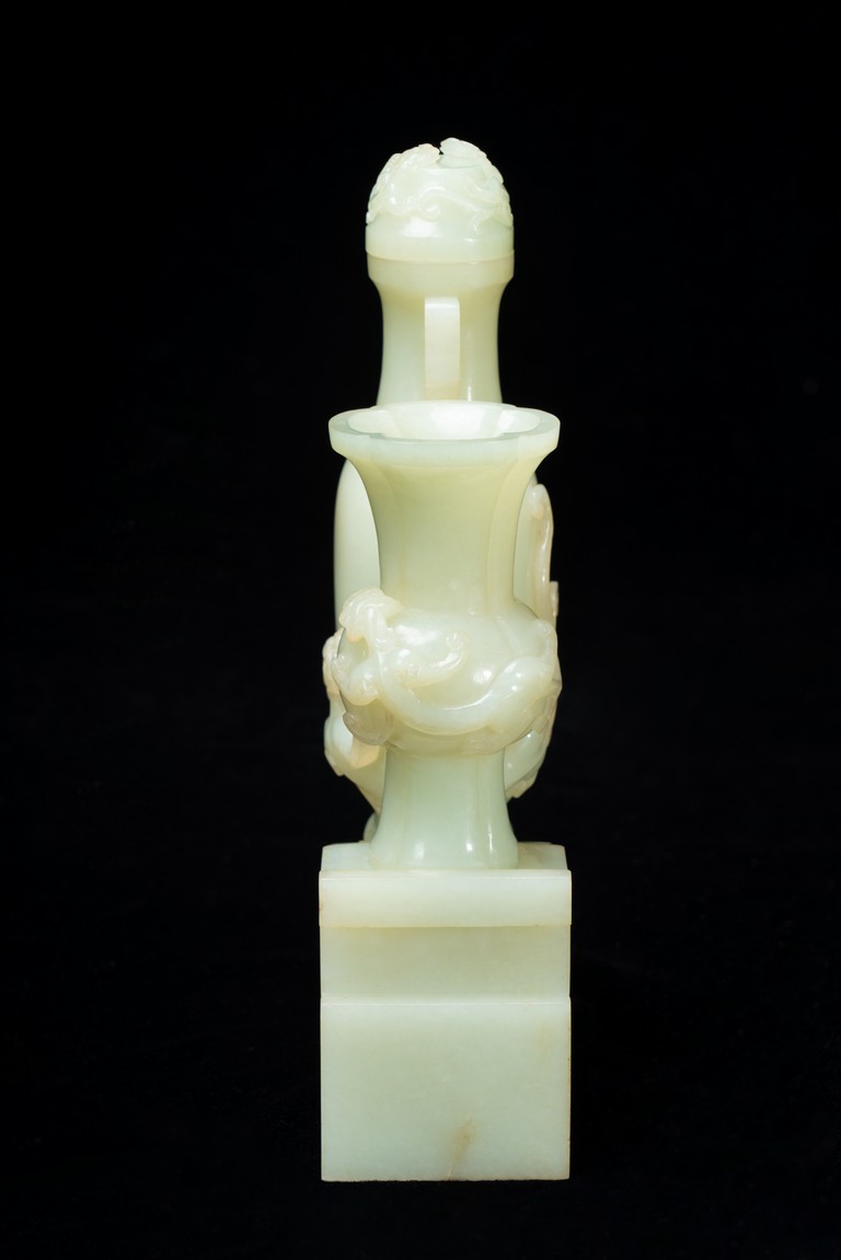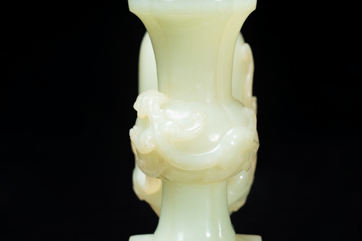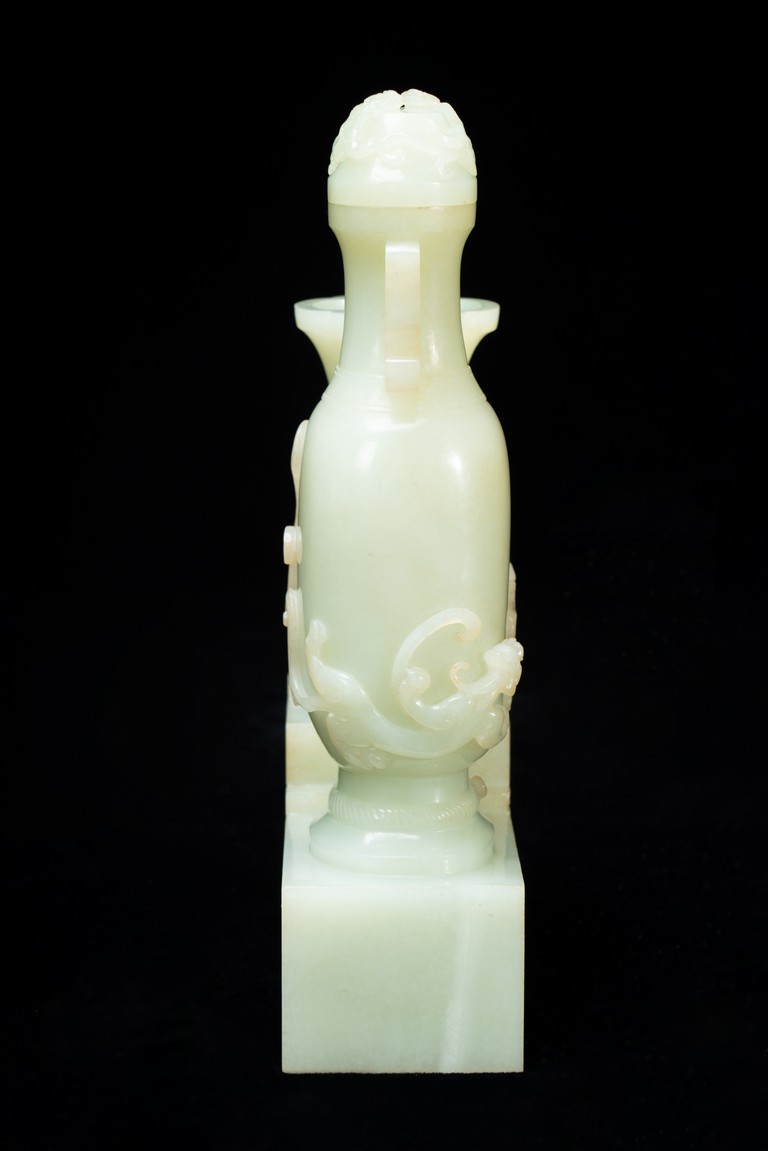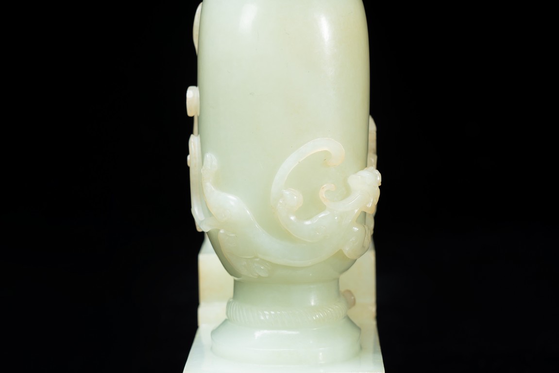 Chinese. Exquisitely carved as a baluster vase with well hollowed interior topped by a domed cover carved with pair of chilong, next to an archaistic lobed Gu vase amongst three clambering chilong, all supported on an elaborate square scroll stand. The stone is of highly polished white tone. Qing Dynasty Qianlong period.