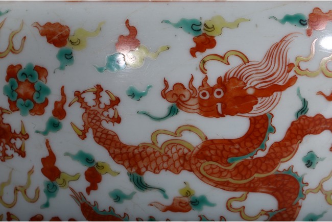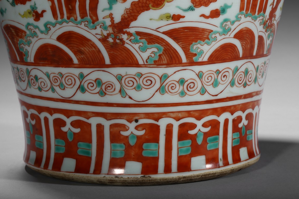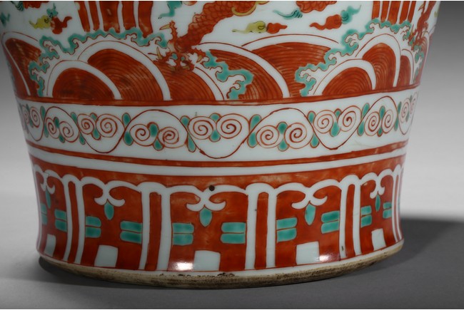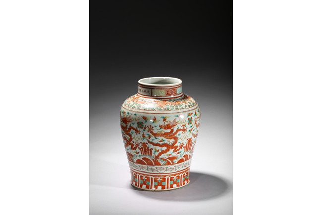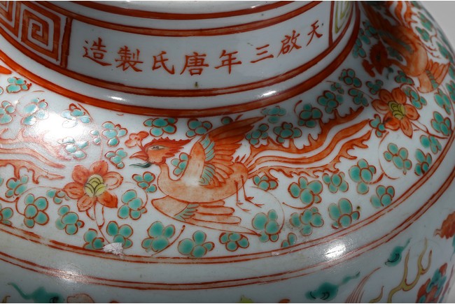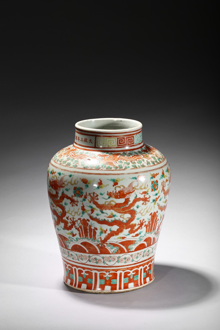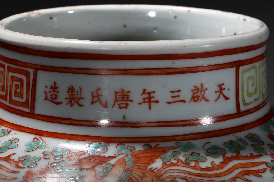 Chinese.The high-shouldered ovoid jar brightly enameled around the body with sinuous five-clawed dragons amidst green, yellow and red fire and clouds above crashing waves and mountains, all flanked between a lappet border the foot, and a band of phoenix in flight amidst dense leafy stems around the shoulder, the short neck decorated with a band of key-fret pattern and inscribed a eight character mark reads as made in the third year of Tianqi Reign by Tang. Ming Dynasty Tianqi period.