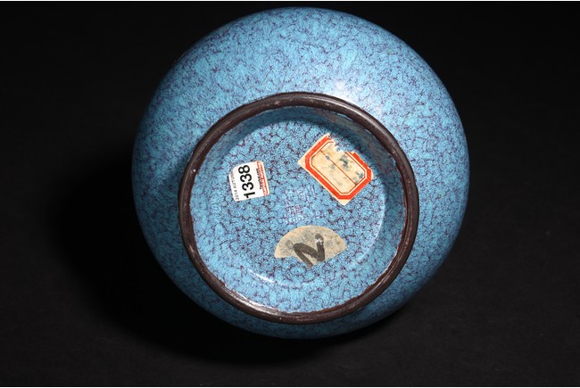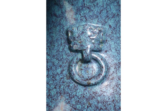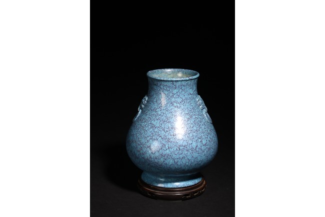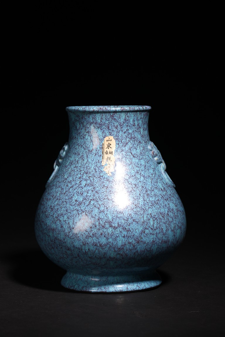 Chinese. Of pear-shaped form, the well potted vase is raised on a slightly splayed foot, the shoulder moulded with a pair of mask and ring handles, covered overall with a mottled opaque glaze of turquoise and purplish-blue tone that continues over the mouth rim and also covers the base that bears a reign mark. Qing Dynasty period.
