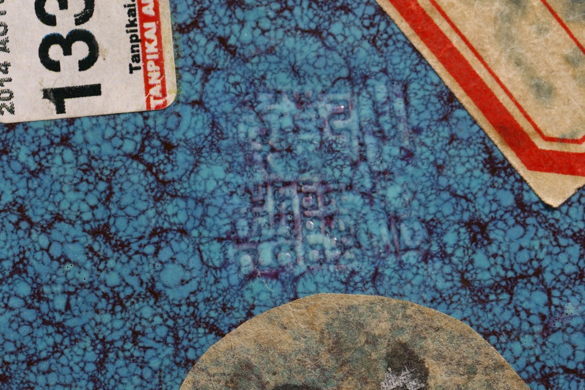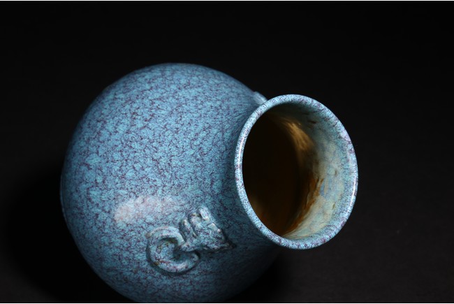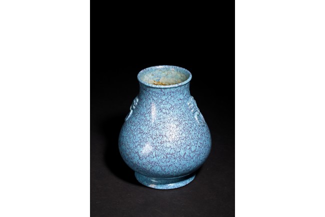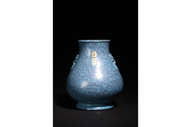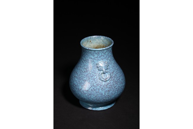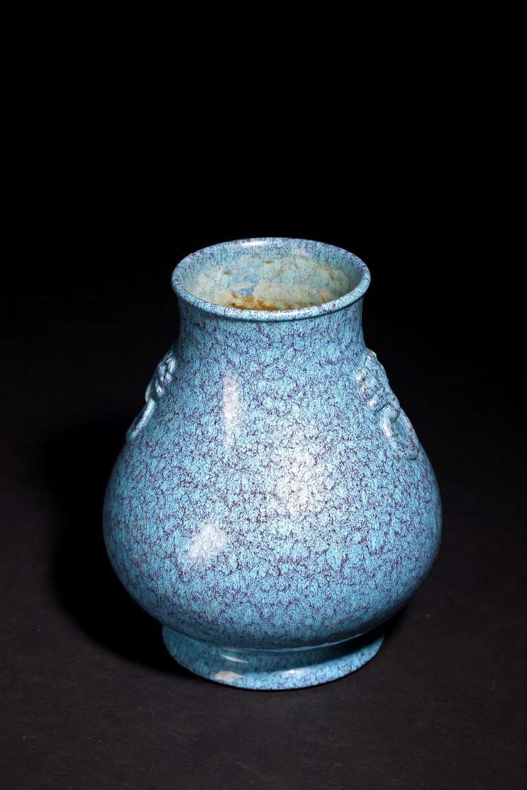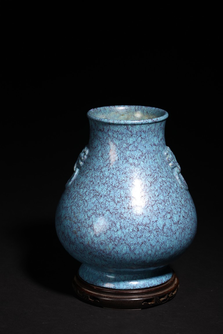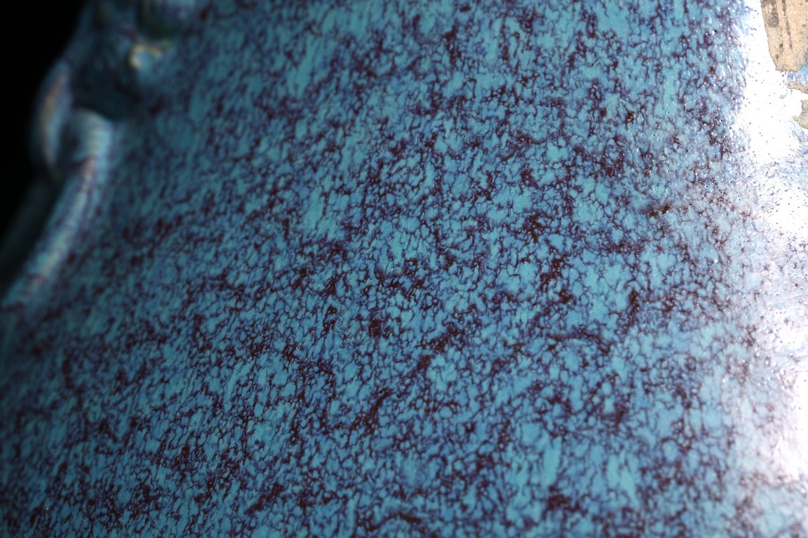 圓口,束頸,飾雙獸耳銜環,鼓垂腹,圈足。器身滿施爐鈞釉,釉彩自然流淌,藍、紫色交織熔融,極盡變幻。整器造型規整,釉色均勻,釉汁肥厚,保存完好,實屬難得。