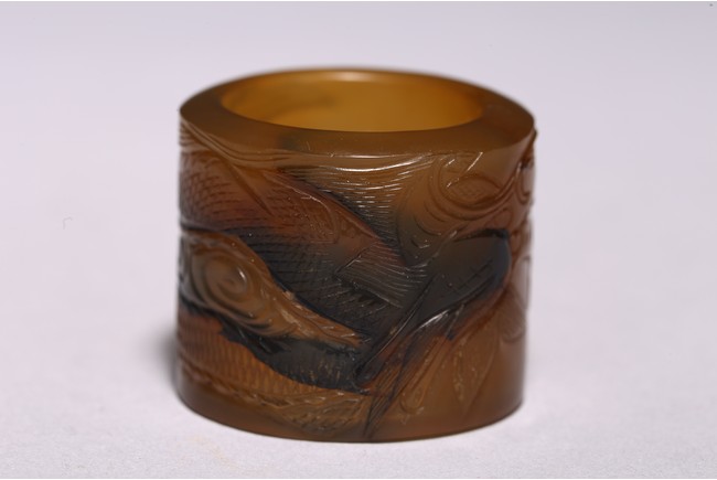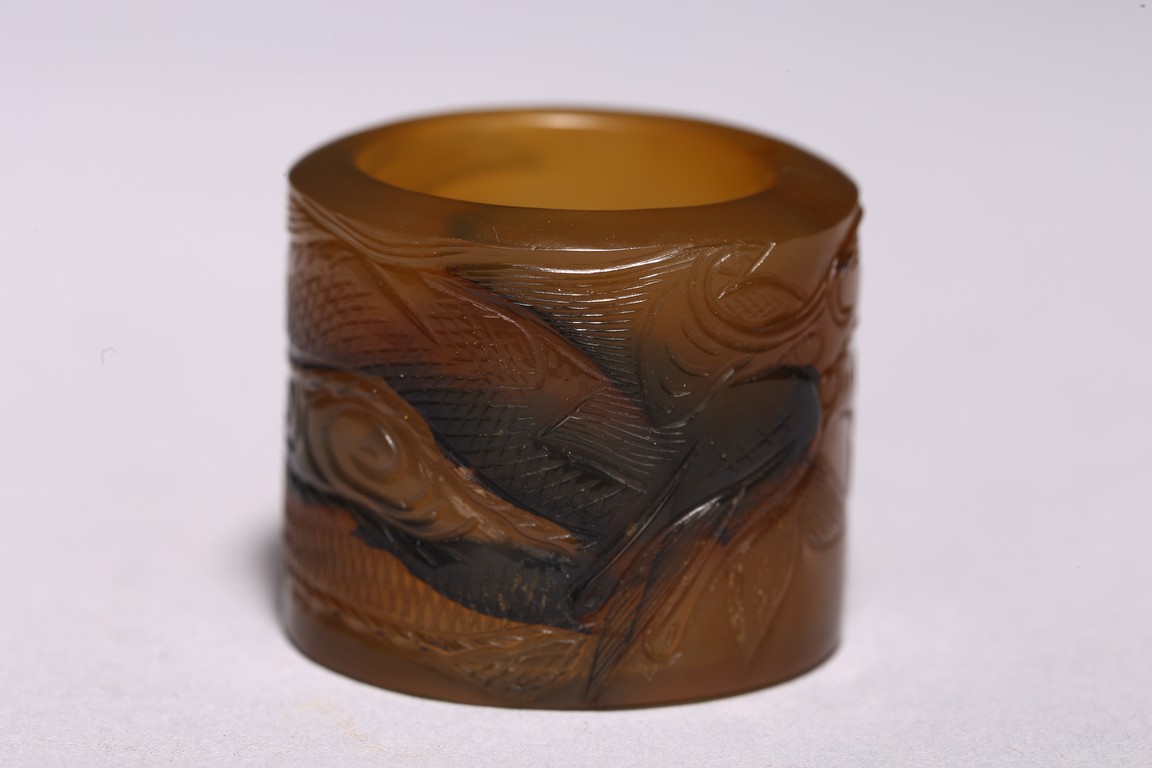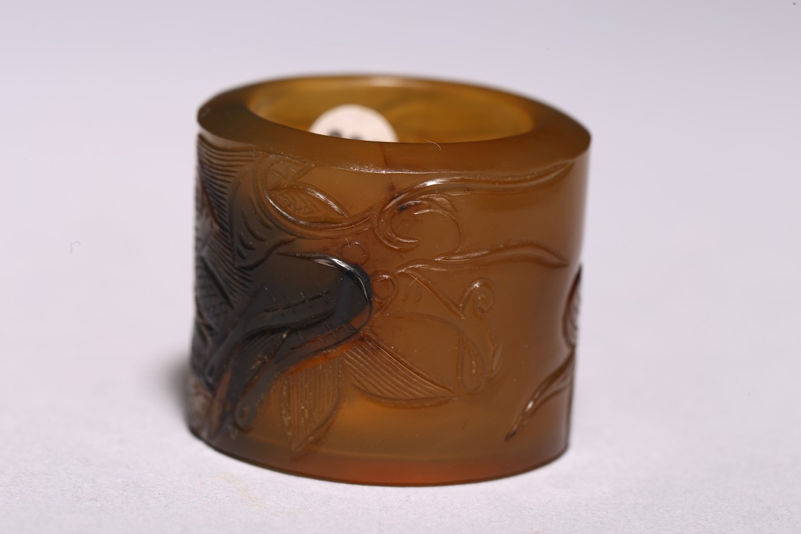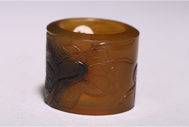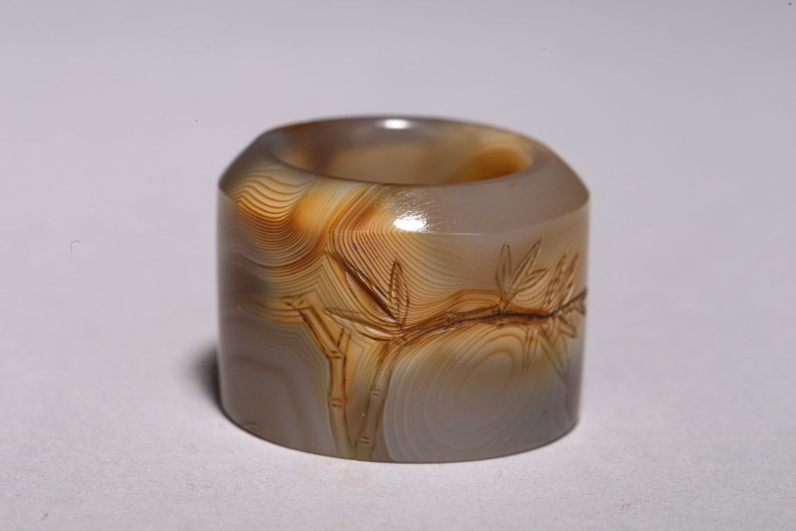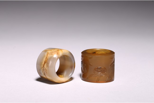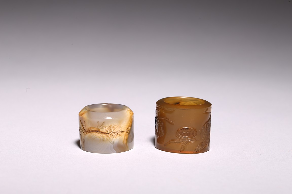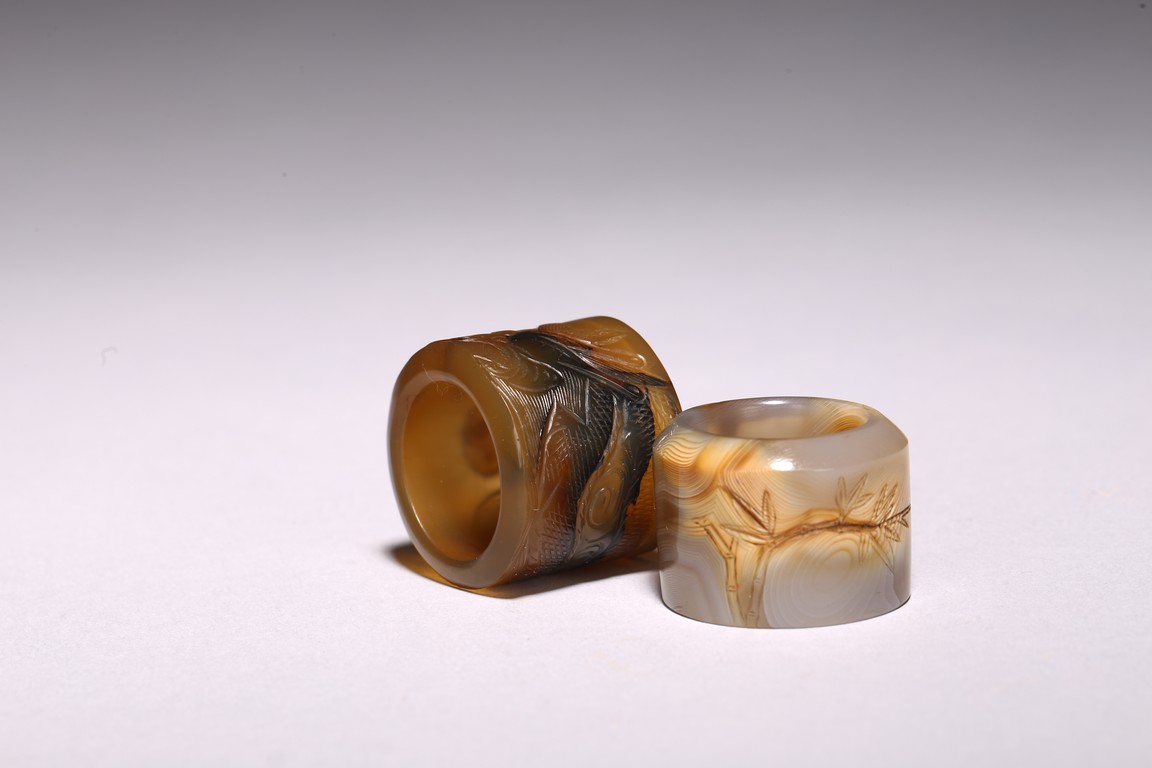 扳指古稱韘,原為游牧狩獵引弓勾弦的實用器,後逐漸變為佩飾。本器圓筒狀,中空,瑪瑙製成,紋理變化多端,成對保存。來源: 凯恩斯-克里茨(Kaynes-Klitz)收藏 Provenance: From the Kaynes-Klitz Collection. Kaynes-Klitz is a notable collector of Chinese snuff bottles and porcelain, and his collection was widely published and auctioned at Sotheby's Hong Kong in the 1990s. The current archer's rings are published in the catalog 'Chinese Archer's Rings from the Kaynes-Klitz Collection' in 2001.