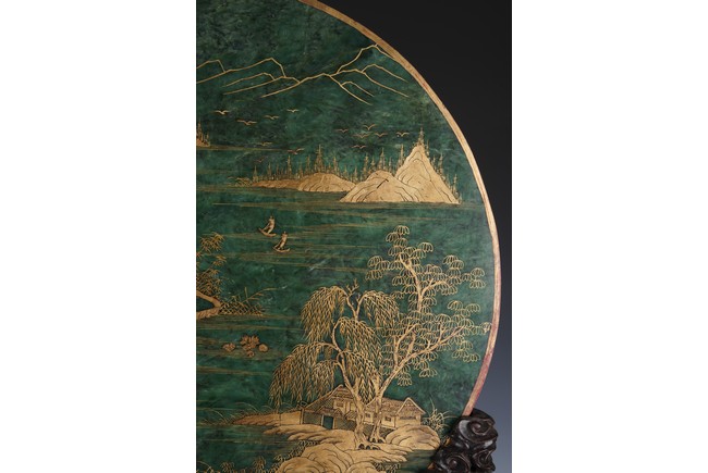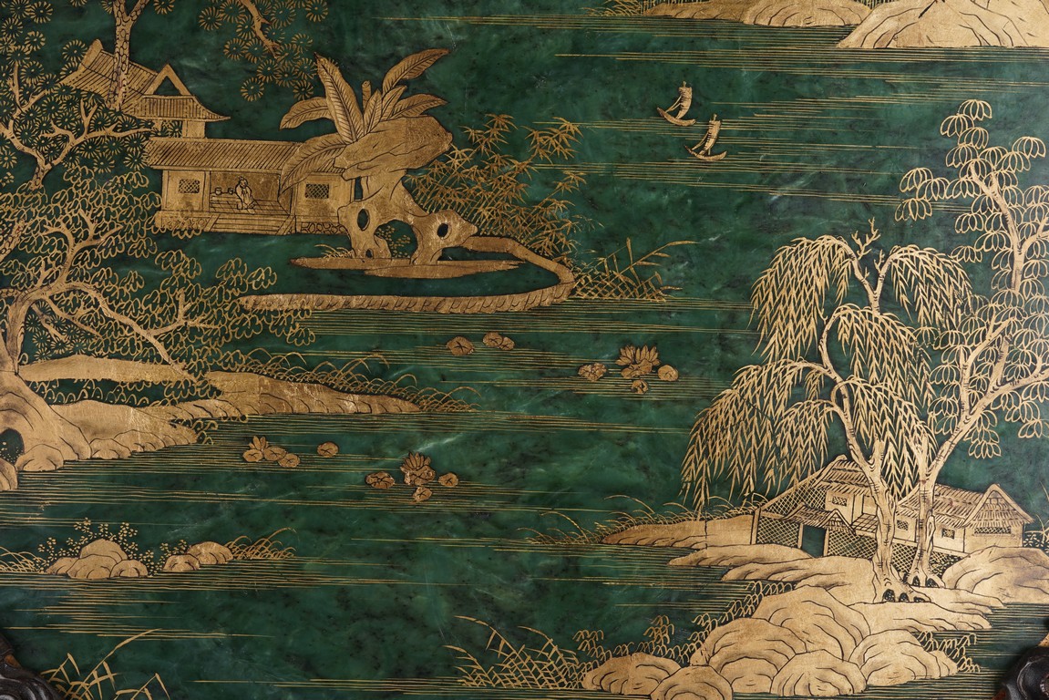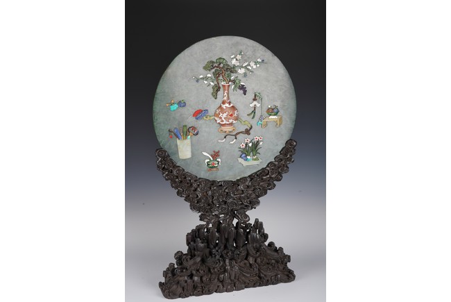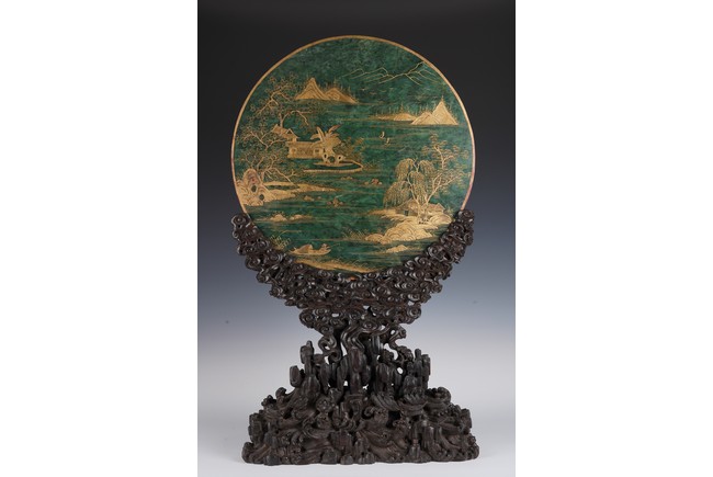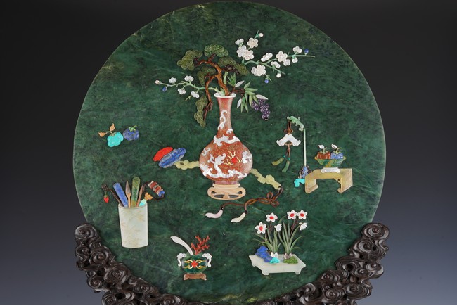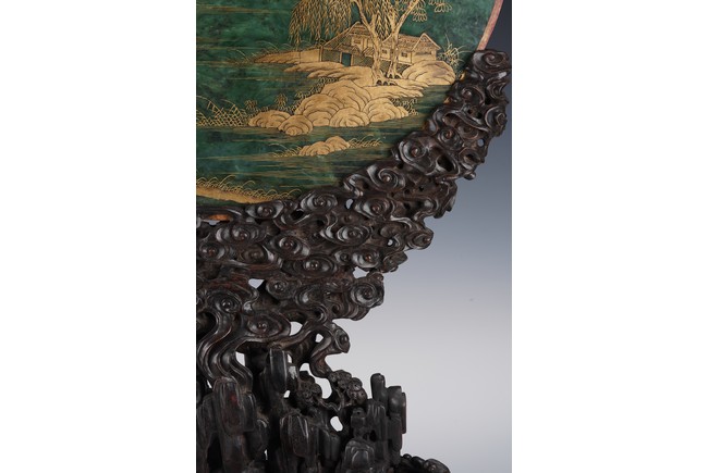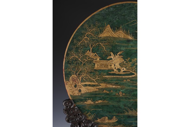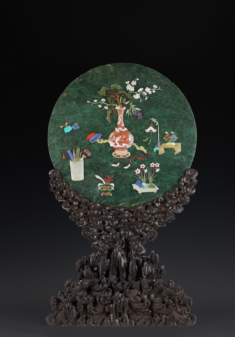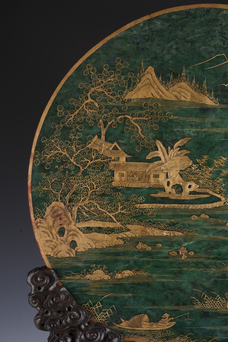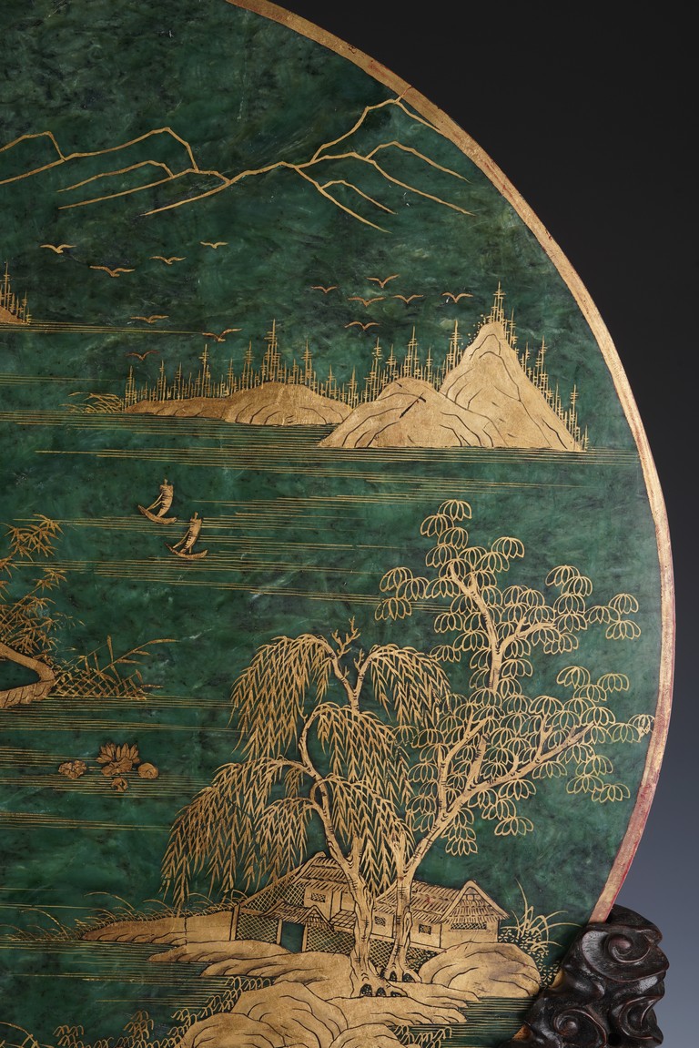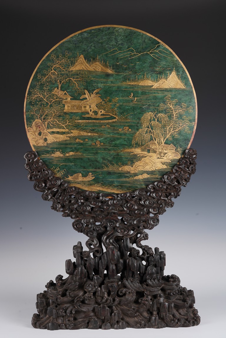 Chinese. A very large and magnificent hardstones and gems inlaid gilt green jade circular screen. Of circular form, the screen elaborately inlaid in various semiprecious gems, including mother-of-pearl, green jade, yellow jade, lapis lazuli, white jade, turquoise, jadeite, agate, soapstone, etc. to depict flower vase, ruyi scepter, flower pots, antiques, scholar objects, etc. The back intricately painted in gilt with a idyllic village riverscape, all supported on highly carved zitan or hardwood stand in the form of clouds rising from mountains above crashing water. Qing Dynasty period or republic period.