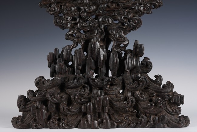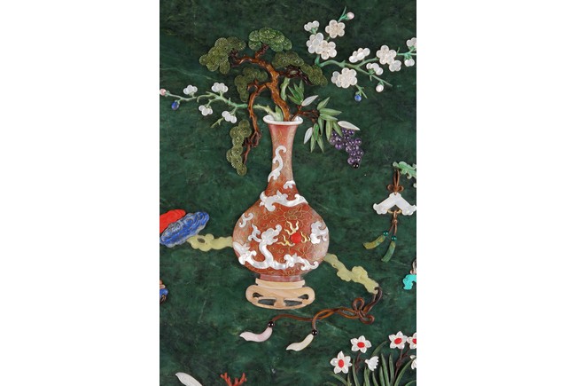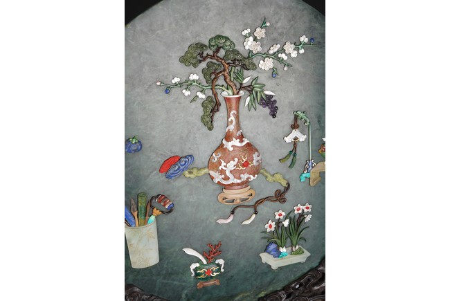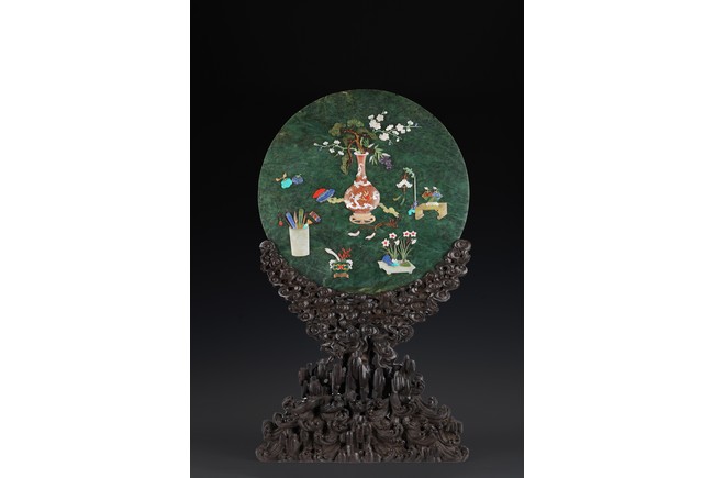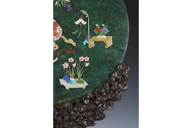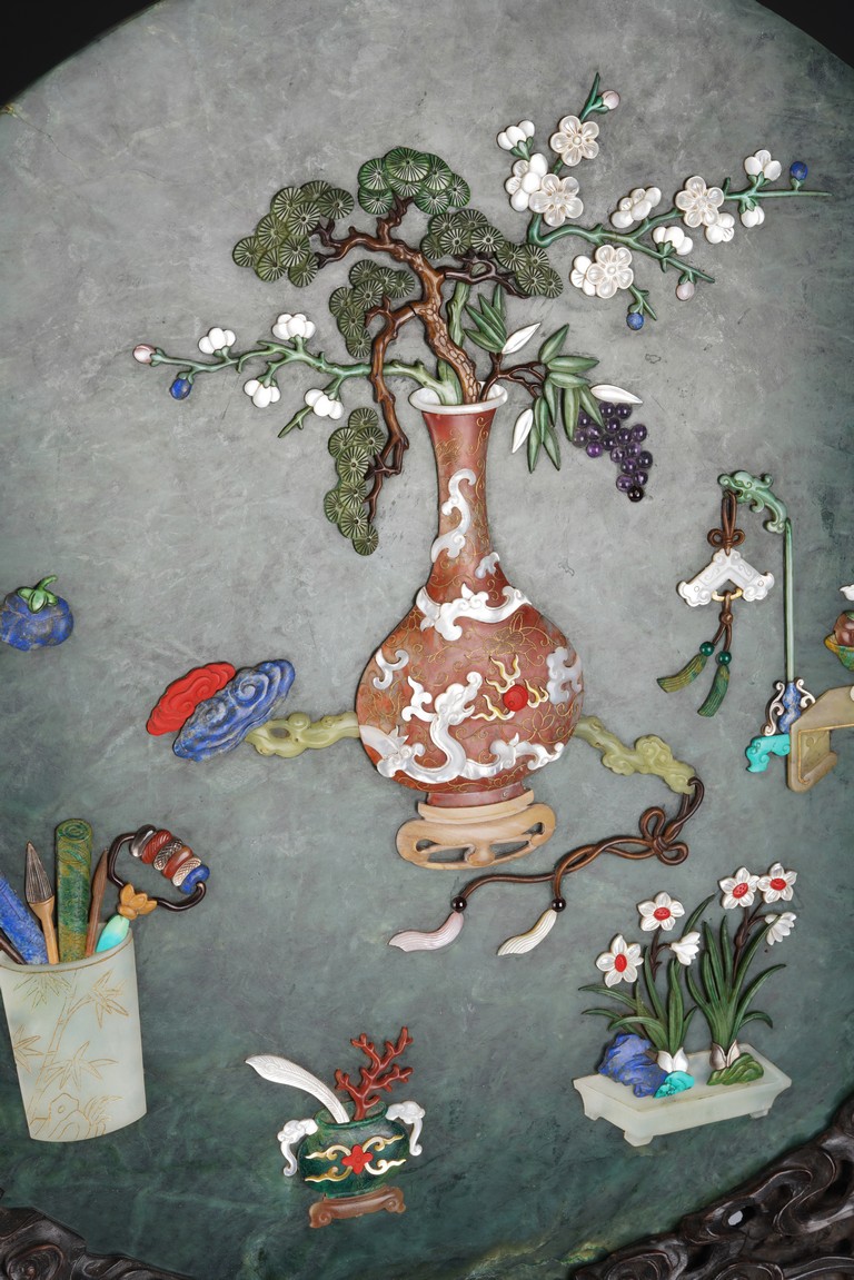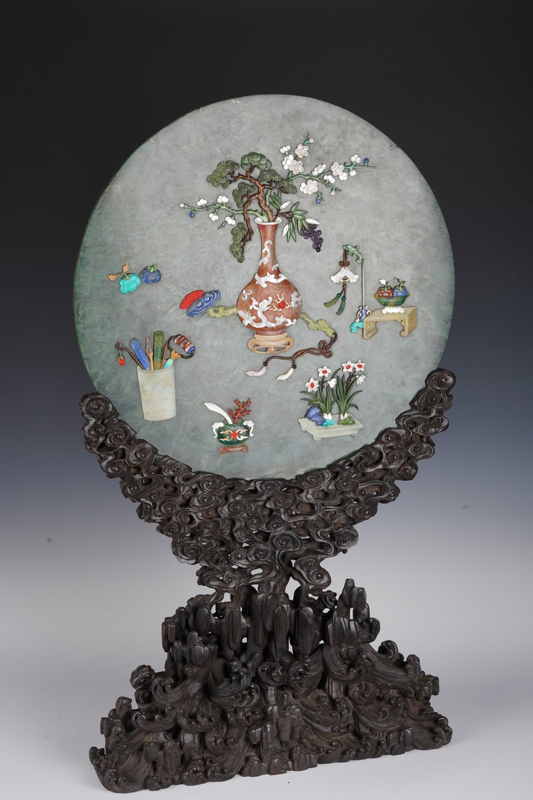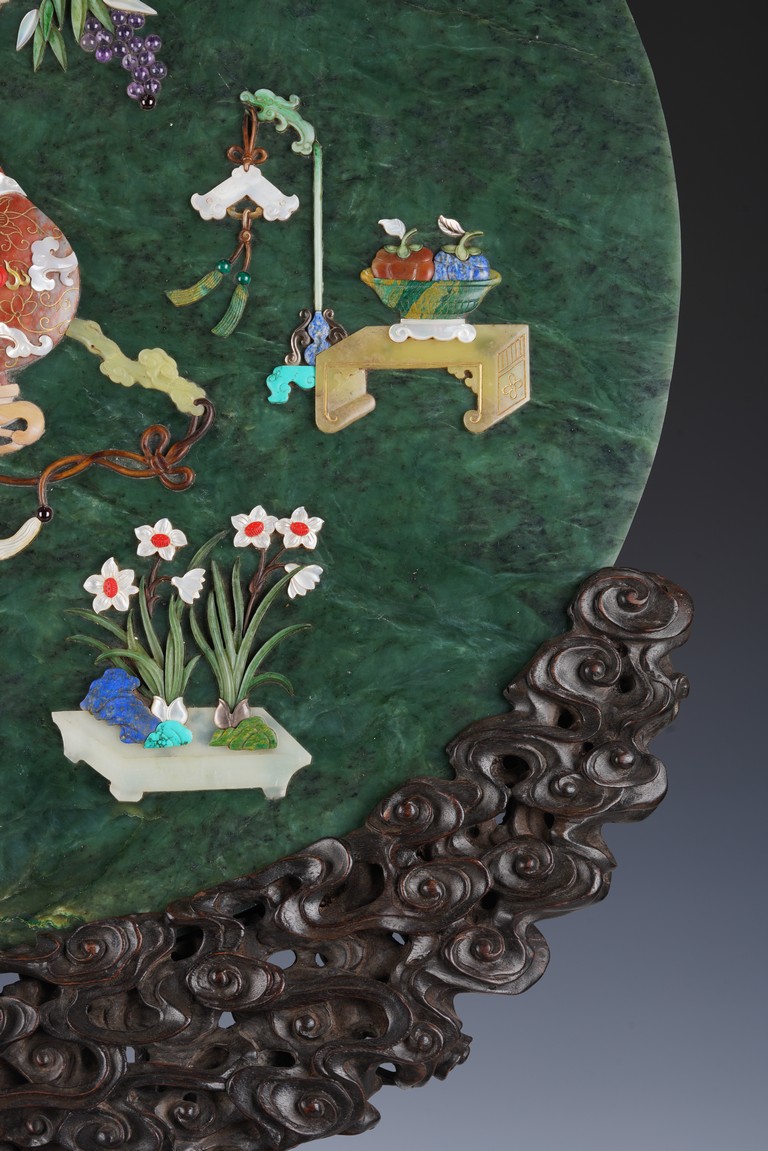插屏圓形,體量碩大,底部為紫檀鏤雕海水江崖雲紋座,上面以整塊和田碧玉圓板為底,厚度均勻,以百寶鑲嵌出博古紋飾,插屏造型大氣磅礴,玉質溫潤細膩,宮廷氣息十足。來源: 三藩市私人收藏 Provenance: Property from a private collection, San Francisco