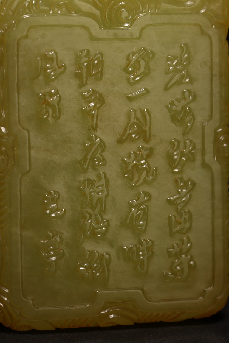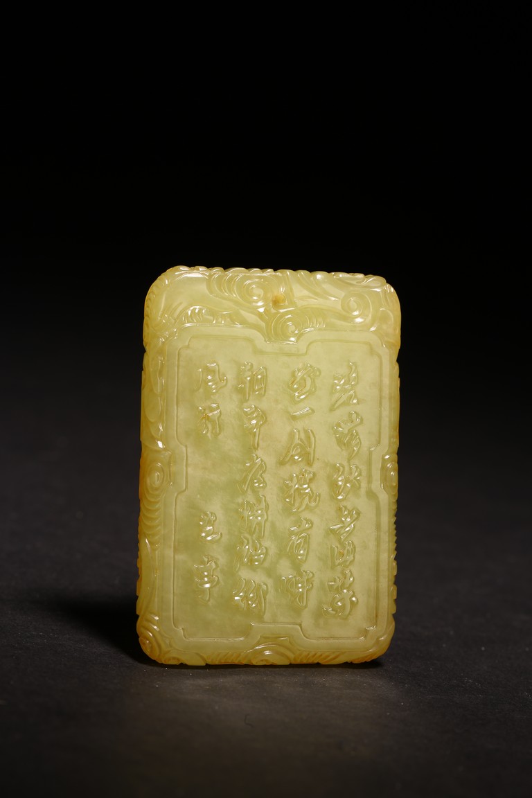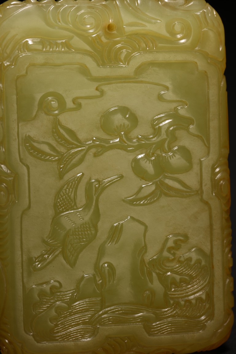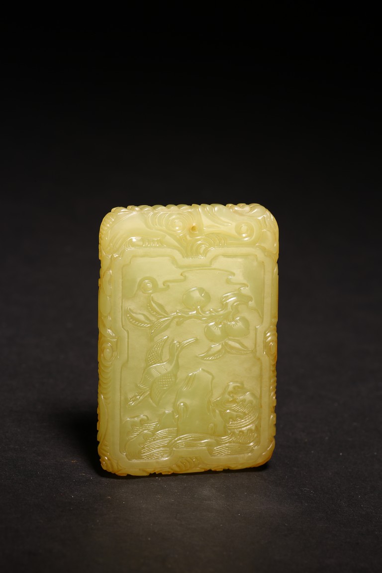 黃玉雕成,玉質極佳,玉色純淨,瑩潤如脂。正面淺浮雕“仙鶴”“壽桃”“海水江崖”,寓意美好,有鶴壽延年之意。反面刻詩文,字體秀逸俊朗,行雲流水。整體刀法細勁遒婉,構圖佈局要妙,精雕細琢,實為難得。