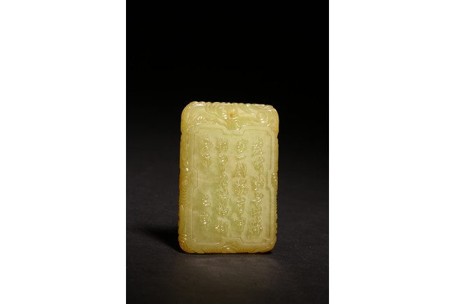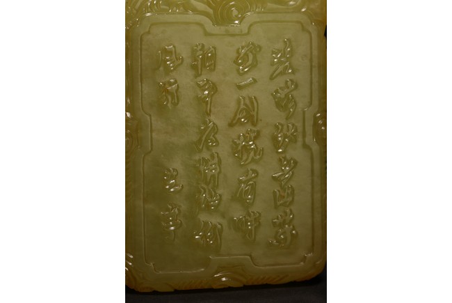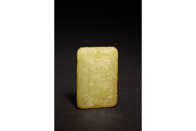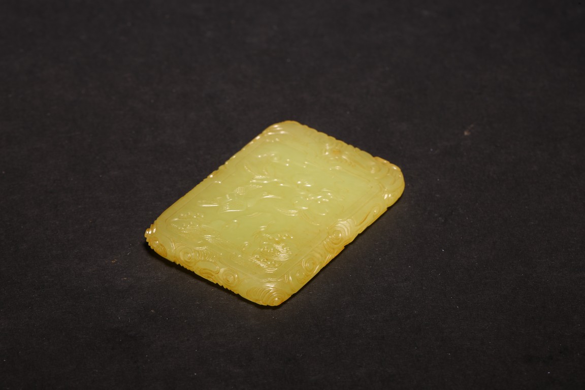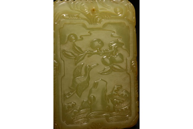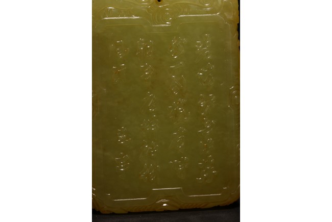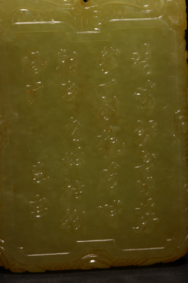黃玉雕成,玉質極佳,玉色純淨,瑩潤如脂。正面淺浮雕“仙鶴”“壽桃”“海水江崖”,寓意美好,有鶴壽延年之意。反面刻詩文,字體秀逸俊朗,行雲流水。整體刀法細勁遒婉,構圖佈局要妙,精雕細琢,實為難得。