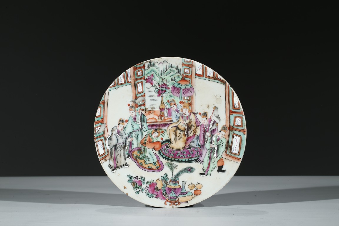 A FAMILLE VERTE 'FIGURES' CIRCULAR PLAQUE    清 五彩人物圓瓷板