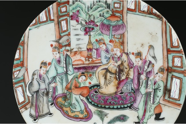 Enamelled with a female figure kneeling for a seated elderly official figure, accompanied by five attendants in an interior setting. Qing Dynasty period.