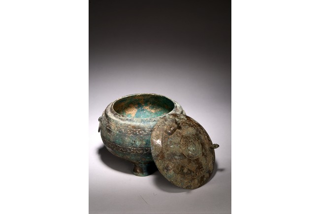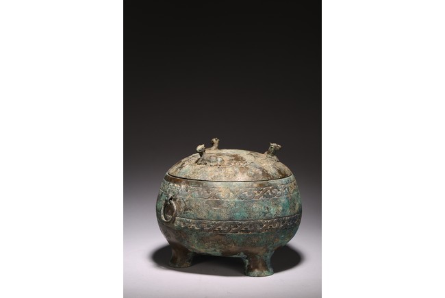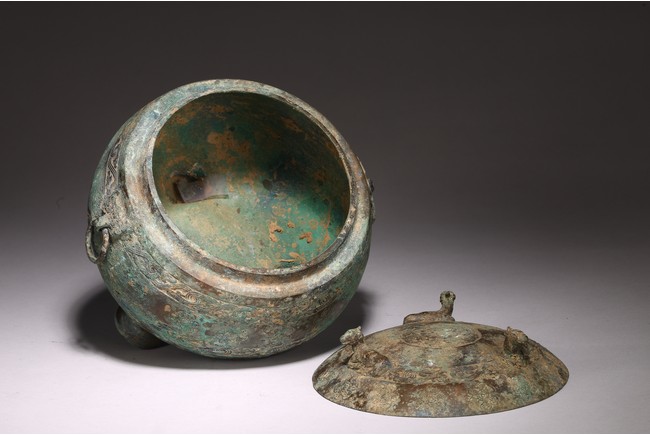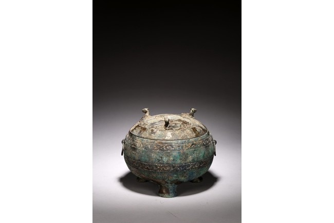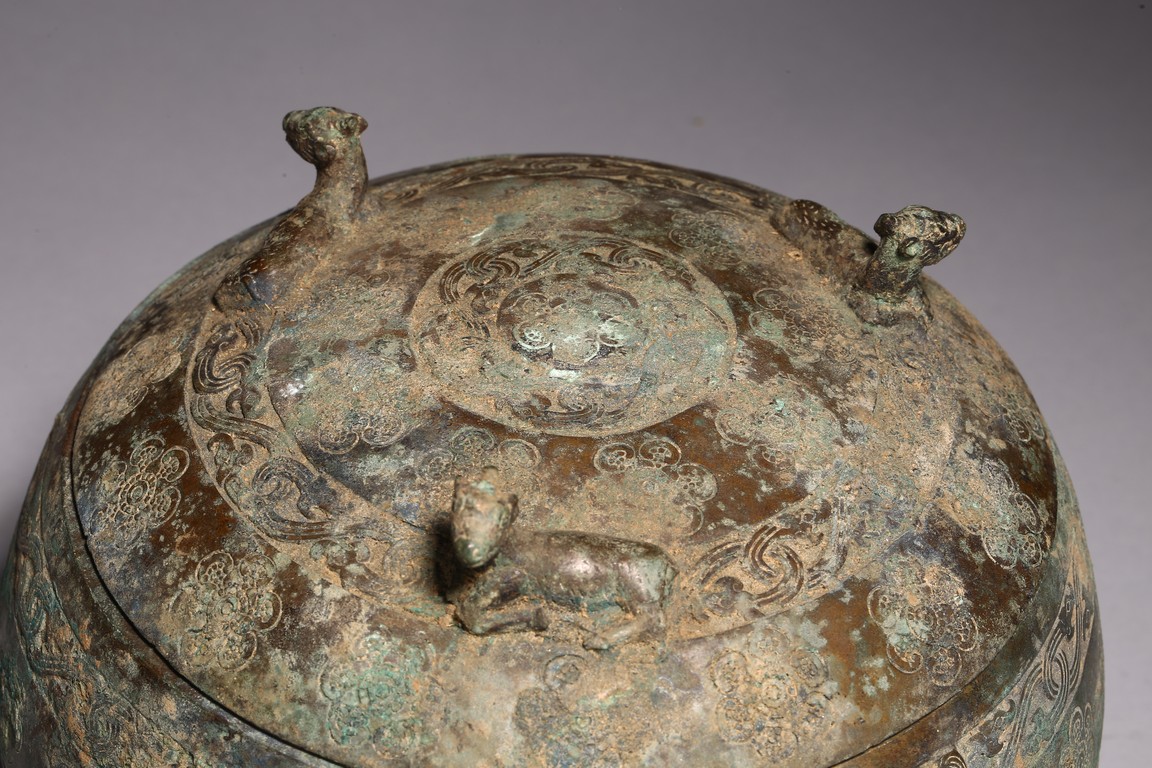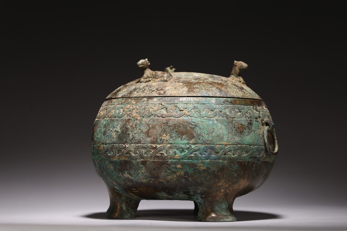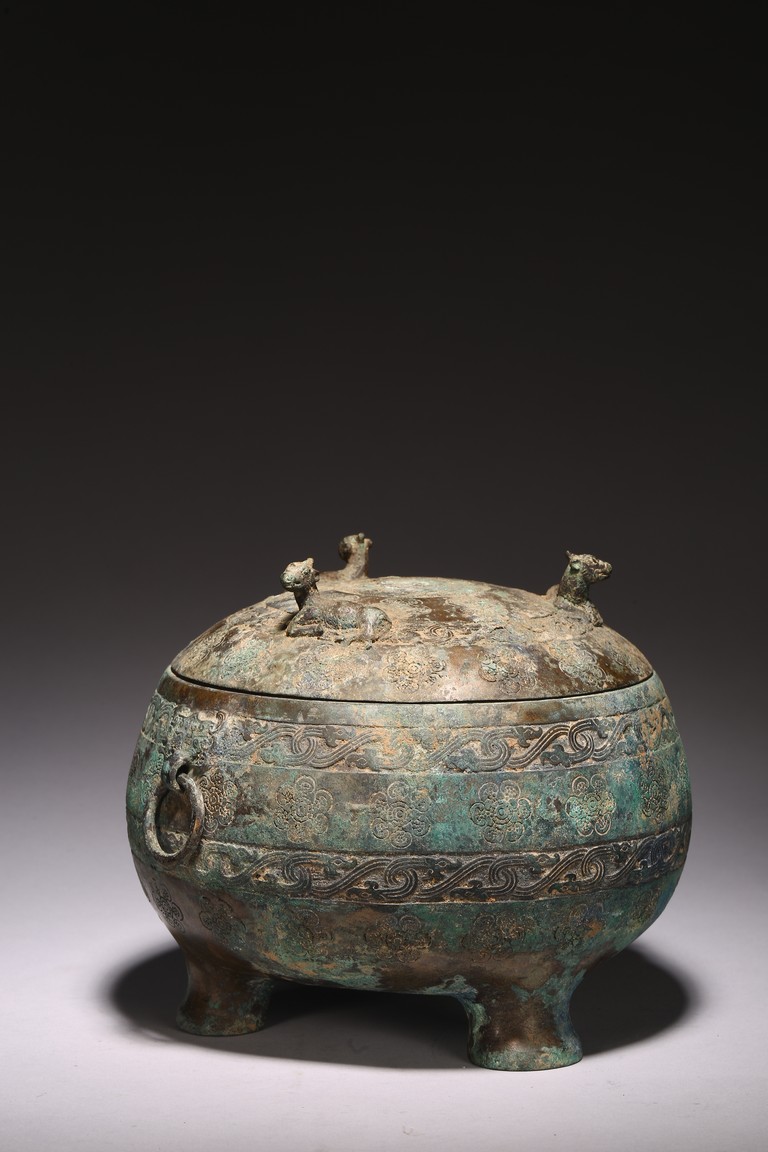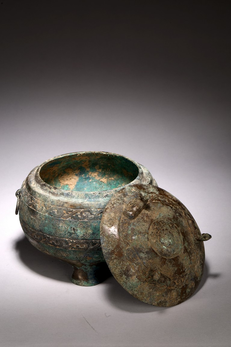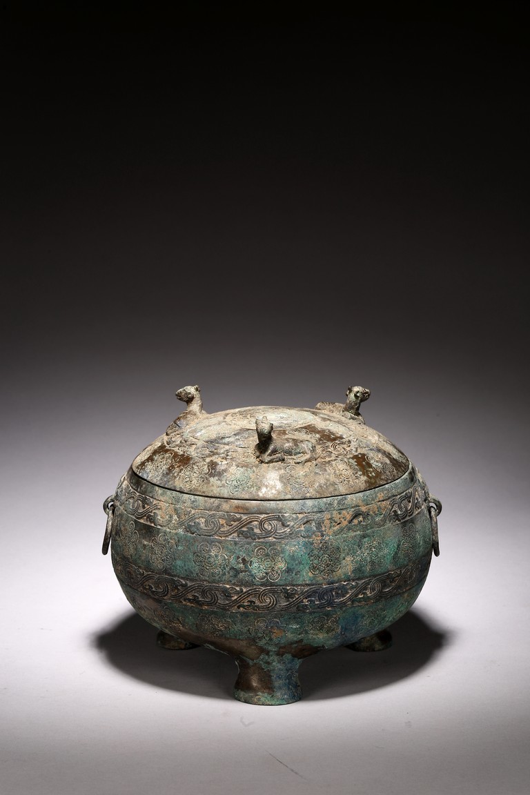 Chinese. With a rounded bowl and domed cover, supported by three short cabriole legs, two loop handles on each side suspended with loose rings, cover with three recumbent beast knobs, both the bowl and cover decorated with bands of stylised dragons and flower motifs. Warring State period/ Western Han Dynasty period or later.
