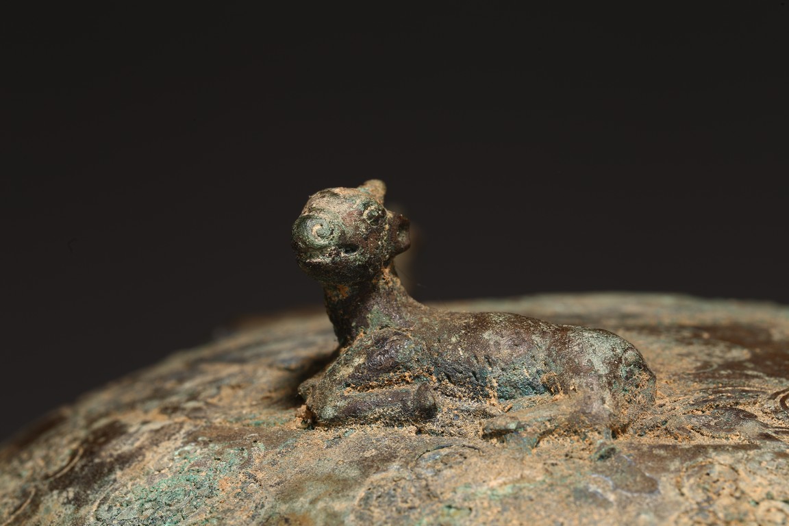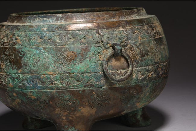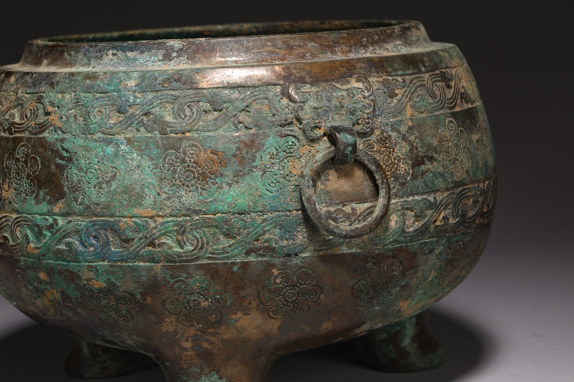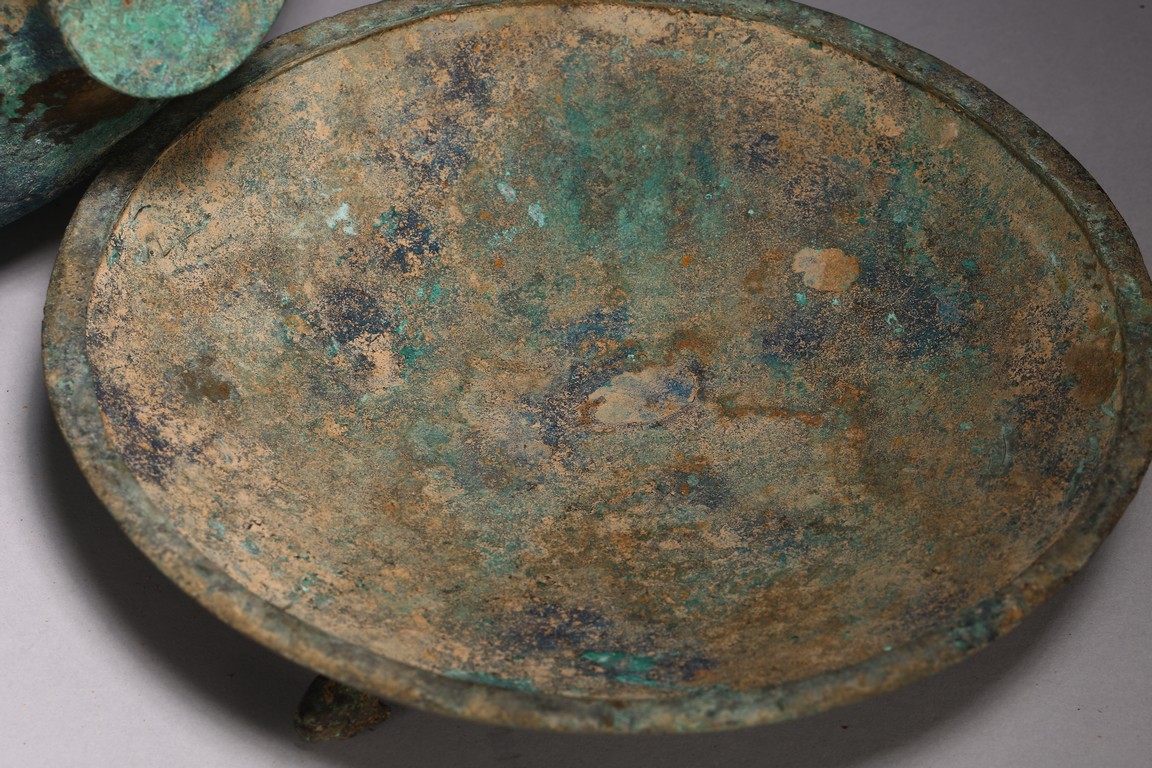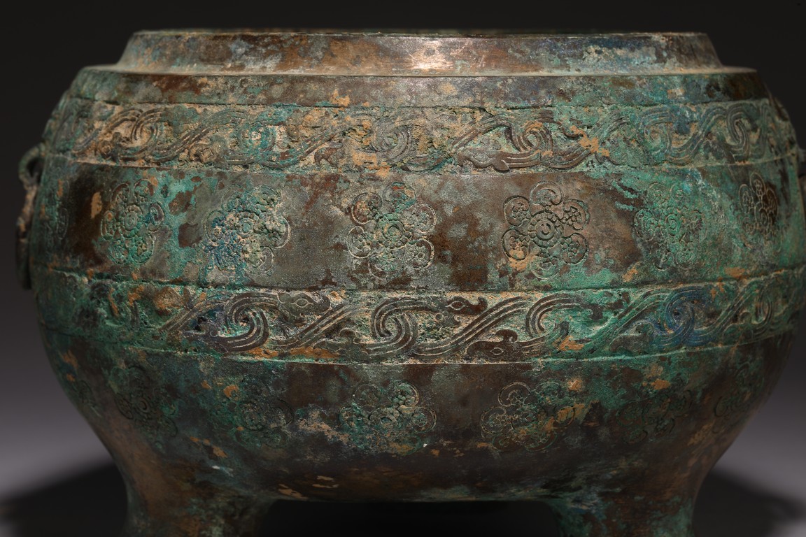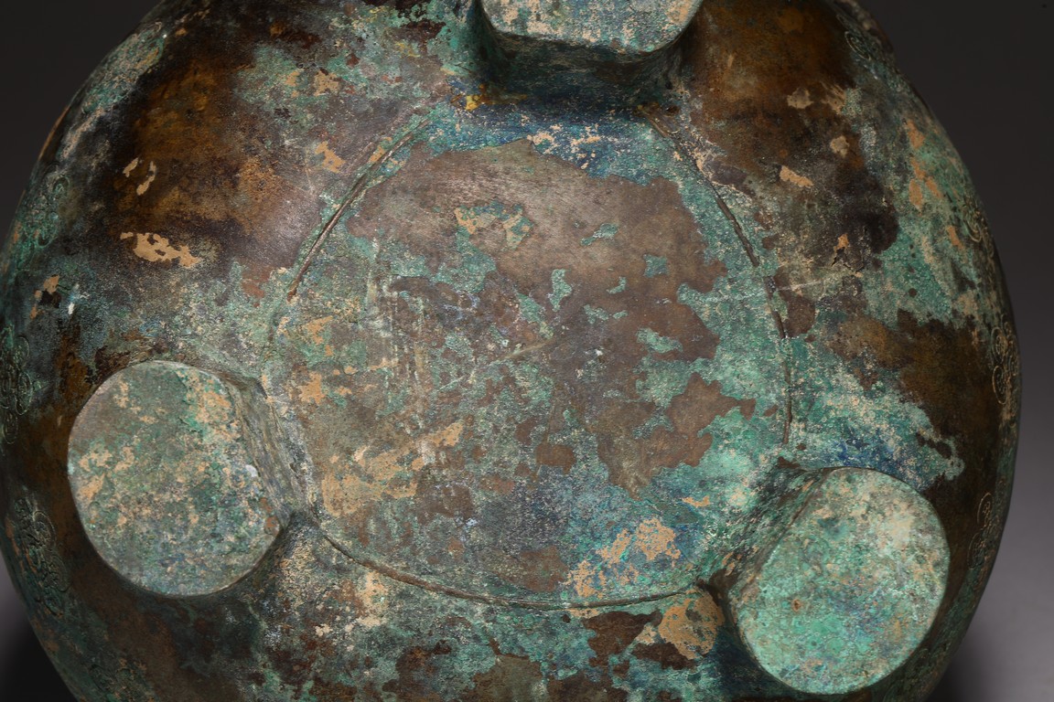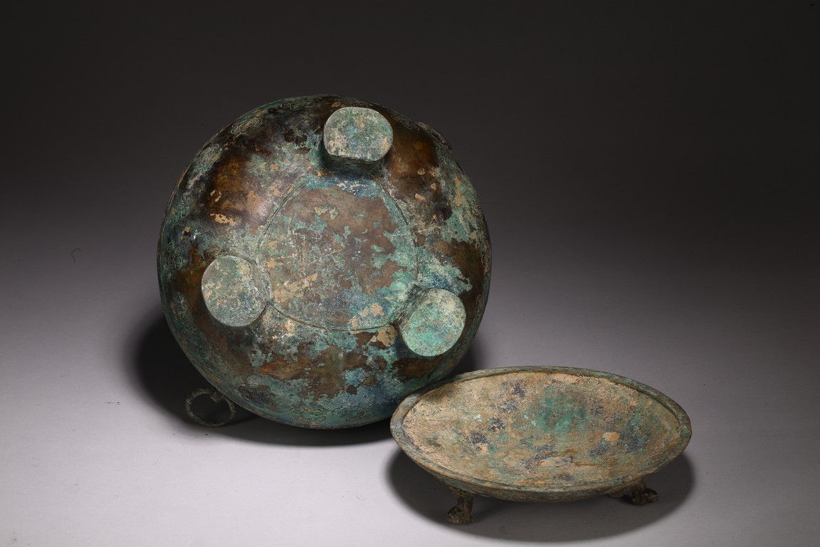 Chinese. With a rounded bowl and domed cover, supported by three short cabriole legs, two loop handles on each side suspended with loose rings, cover with three recumbent beast knobs, both the bowl and cover decorated with bands of stylised dragons and flower motifs. Warring State period/ Western Han Dynasty period or later.