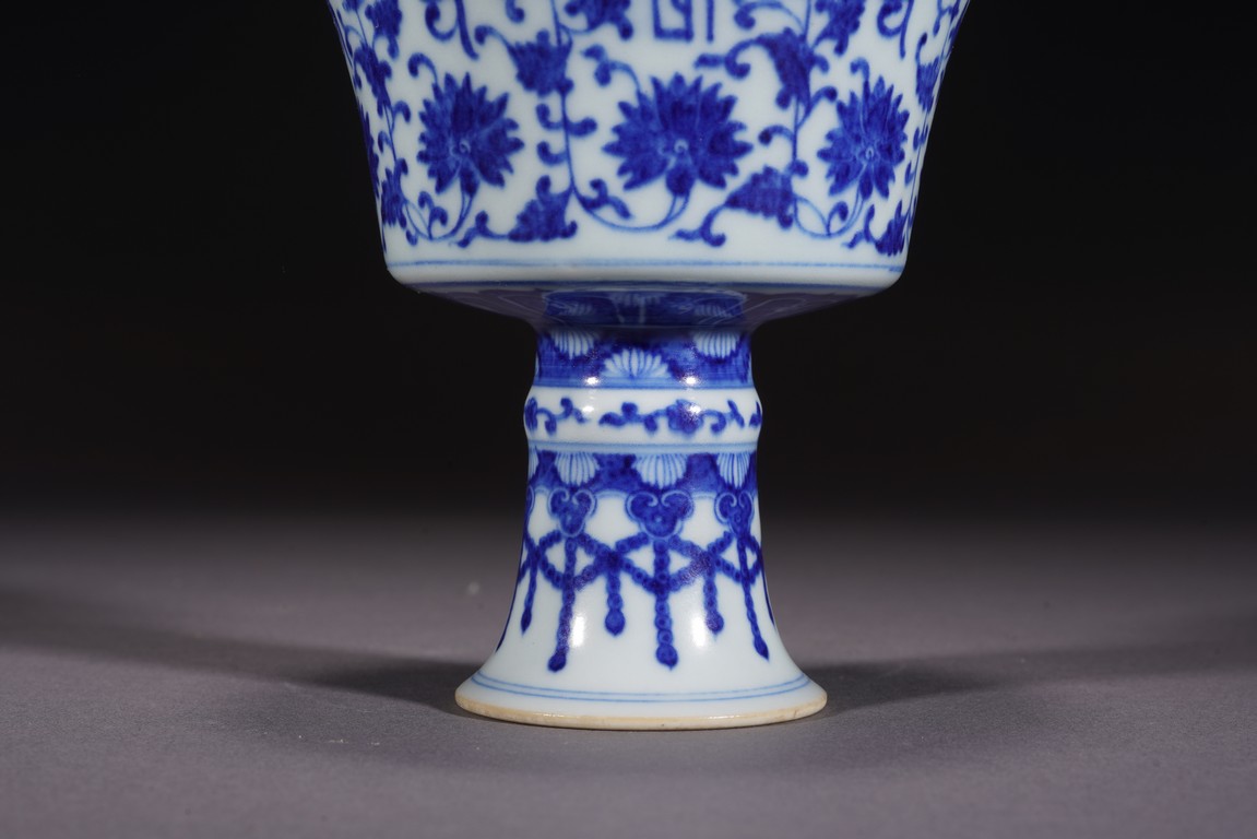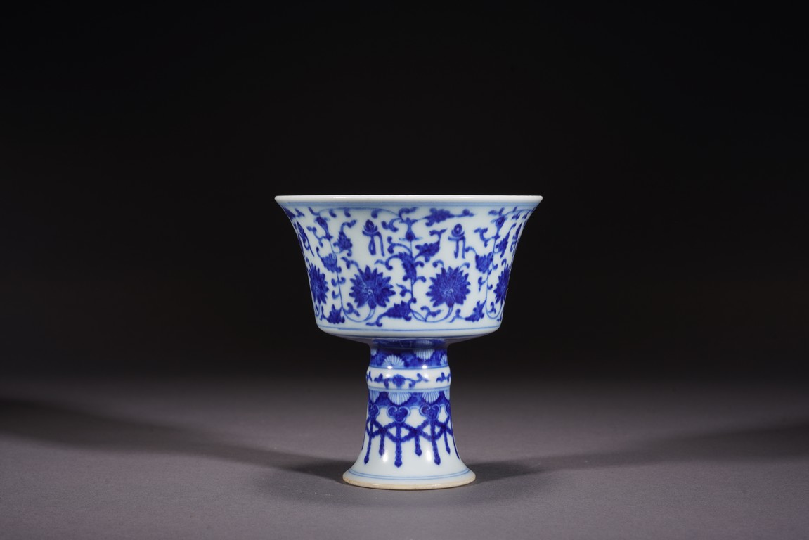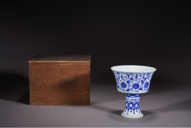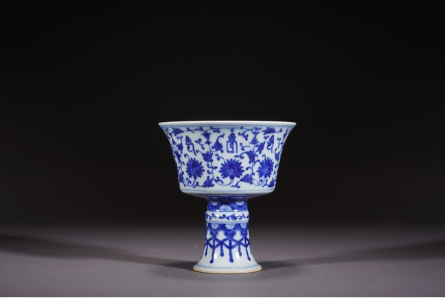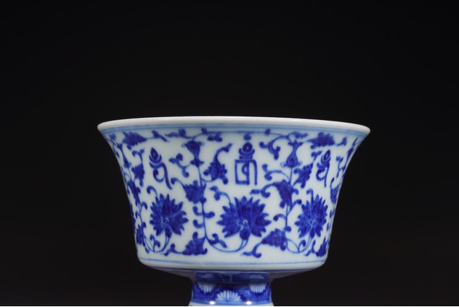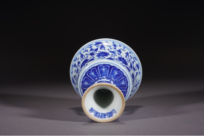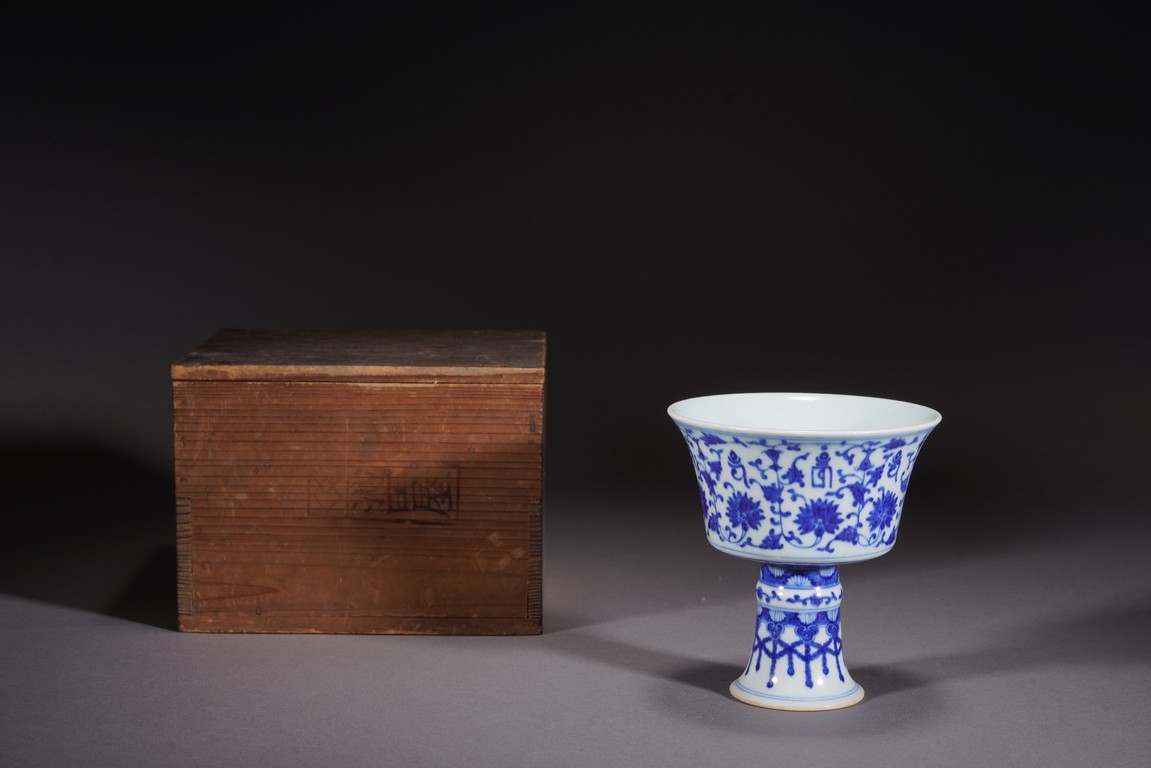 器仿西藏寺廟中銅酥油燈造型而製,撇口,深腹,喇叭形高足,外壁一周纏枝 蓮紋,上托梵文真言,藏傳佛教認爲,常持誦六字大明咒,可以消除病苦、刑罰、 非時死之恐懼,壽命增加,財富充盈。底部繪變形蓮瓣紋,杯足纓絡纏繞,皆爲 藏傳佛教傳統裝飾題材。釉色潔白瑩潤,青花發色明麗,“大清乾隆年制款識”。配木盒(參閱香港蘇富比拍賣有限公司 2014 年春季拍賣會重要中國瓷器及工藝 品 3131 號拍品,成交價:HKD 575000)