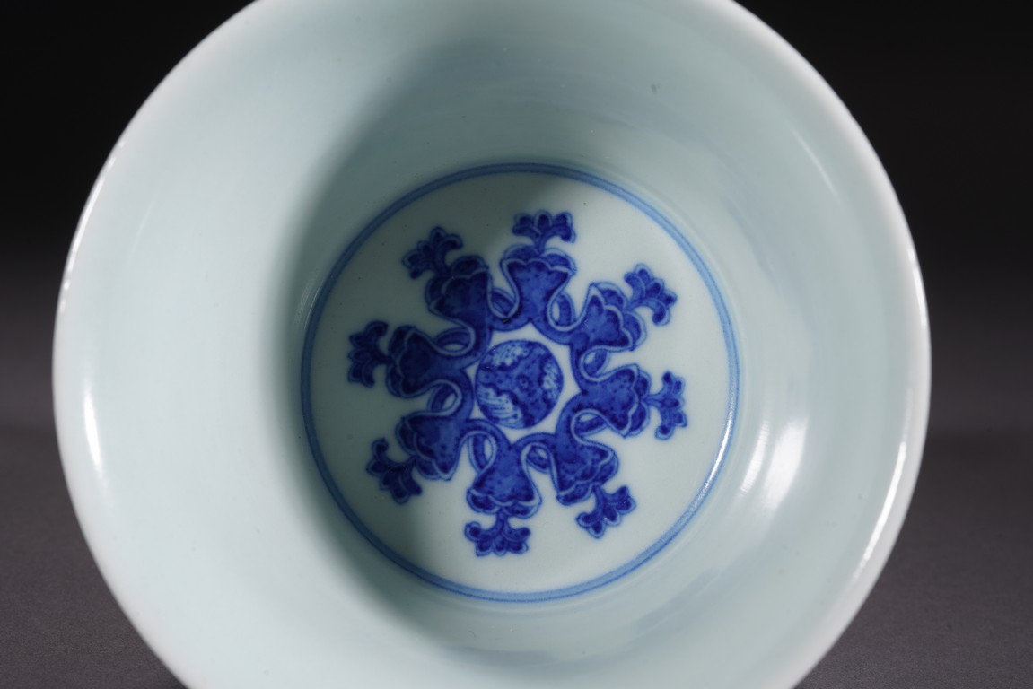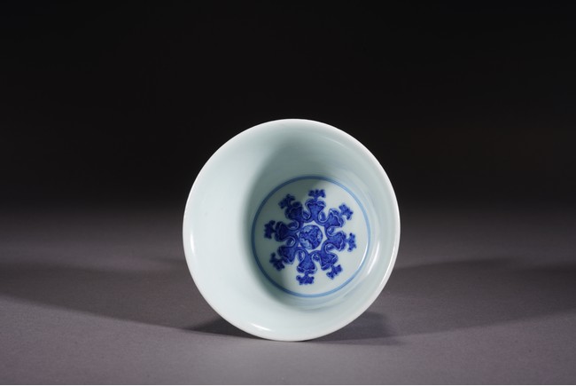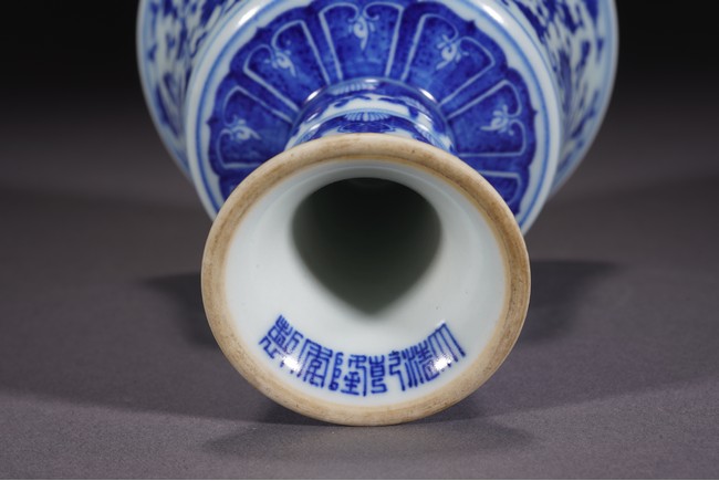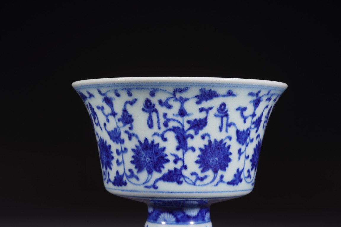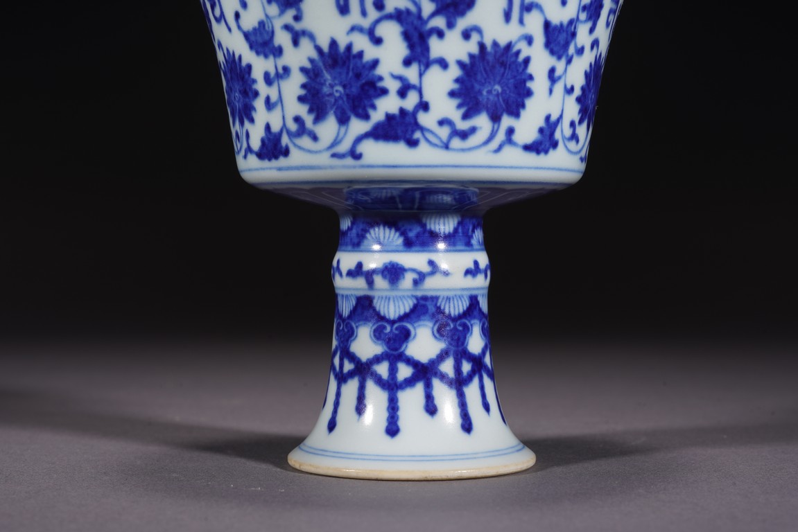 器仿西藏寺廟中銅酥油燈造型而製,撇口,深腹,喇叭形高足,外壁一周纏枝 蓮紋,上托梵文真言,藏傳佛教認爲,常持誦六字大明咒,可以消除病苦、刑罰、 非時死之恐懼,壽命增加,財富充盈。底部繪變形蓮瓣紋,杯足纓絡纏繞,皆爲 藏傳佛教傳統裝飾題材。釉色潔白瑩潤,青花發色明麗,“大清乾隆年制款識”。配木盒(參閱香港蘇富比拍賣有限公司 2014 年春季拍賣會重要中國瓷器及工藝 品 3131 號拍品,成交價:HKD 575000)