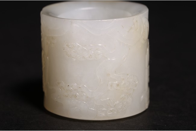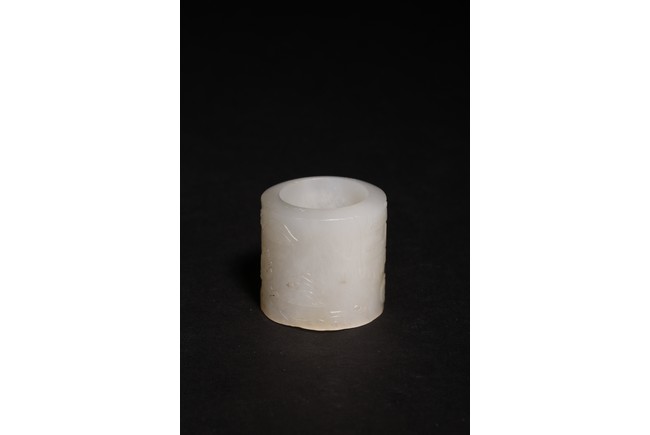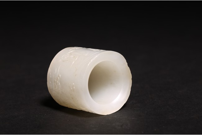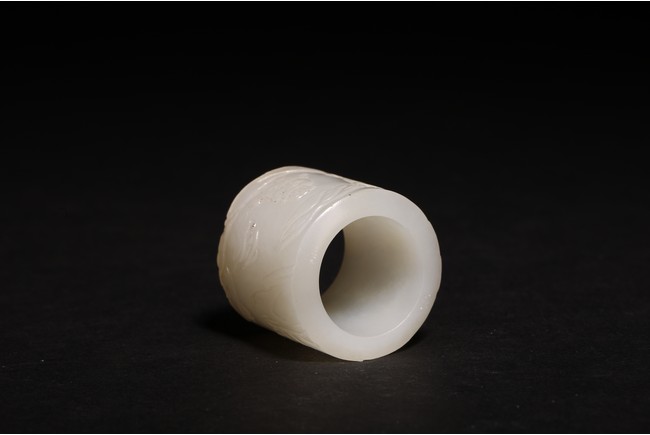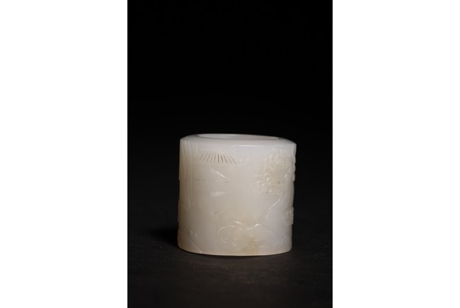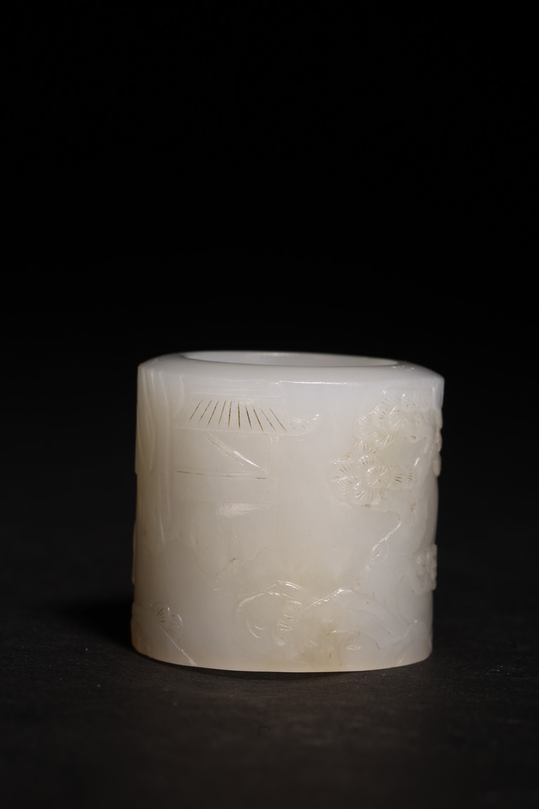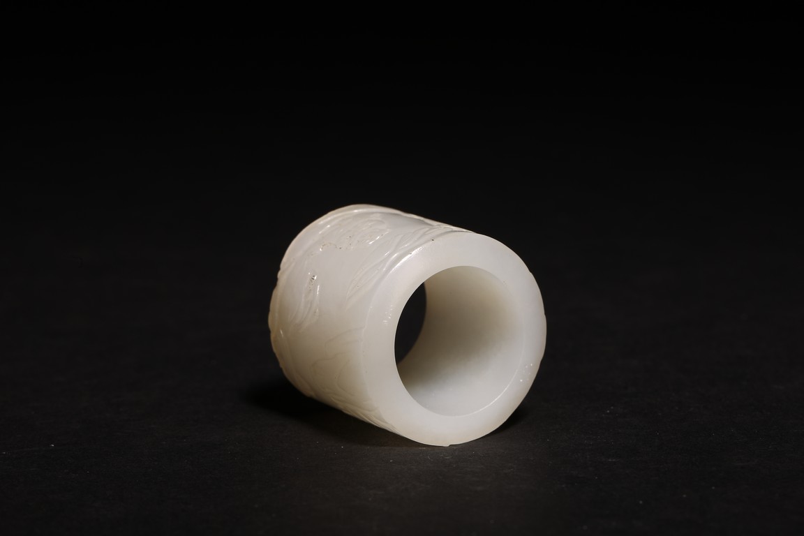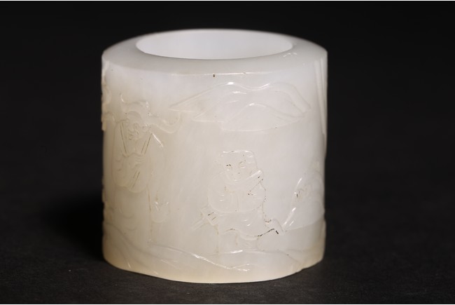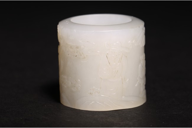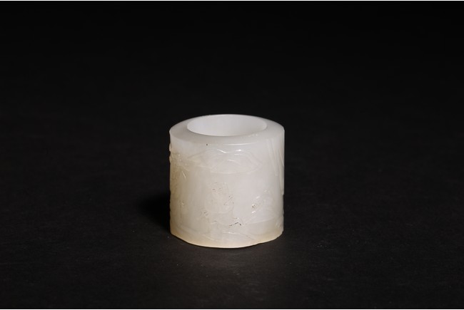Chinese. The archer's ring exterior carved in low relief with figures in landscape. Qing Dynasty period.