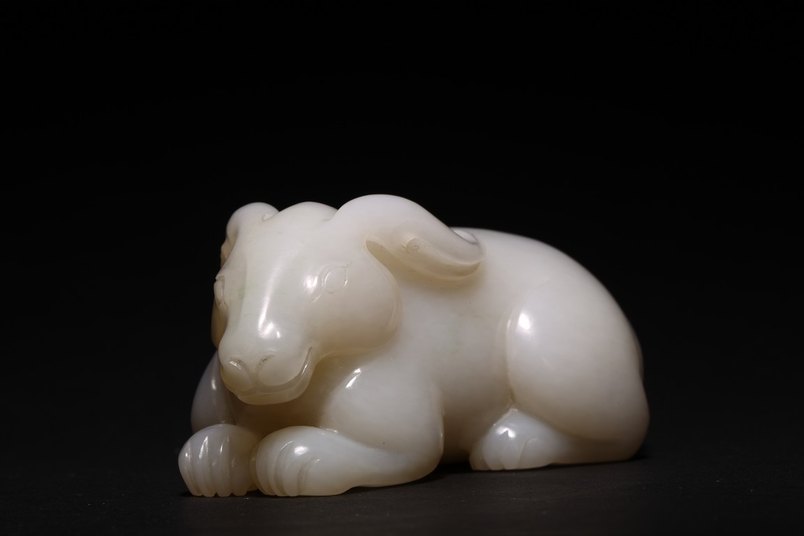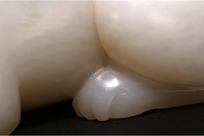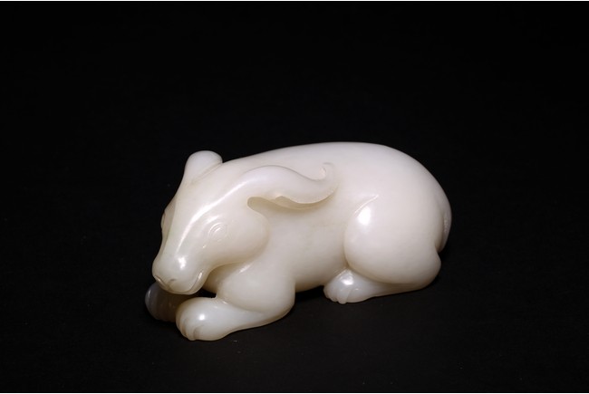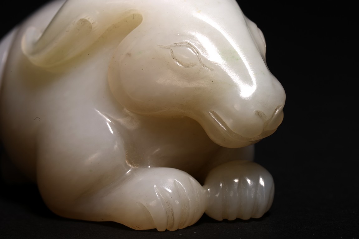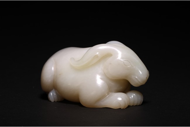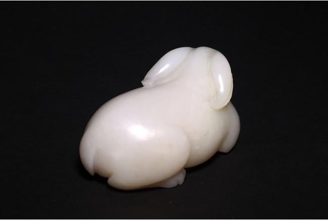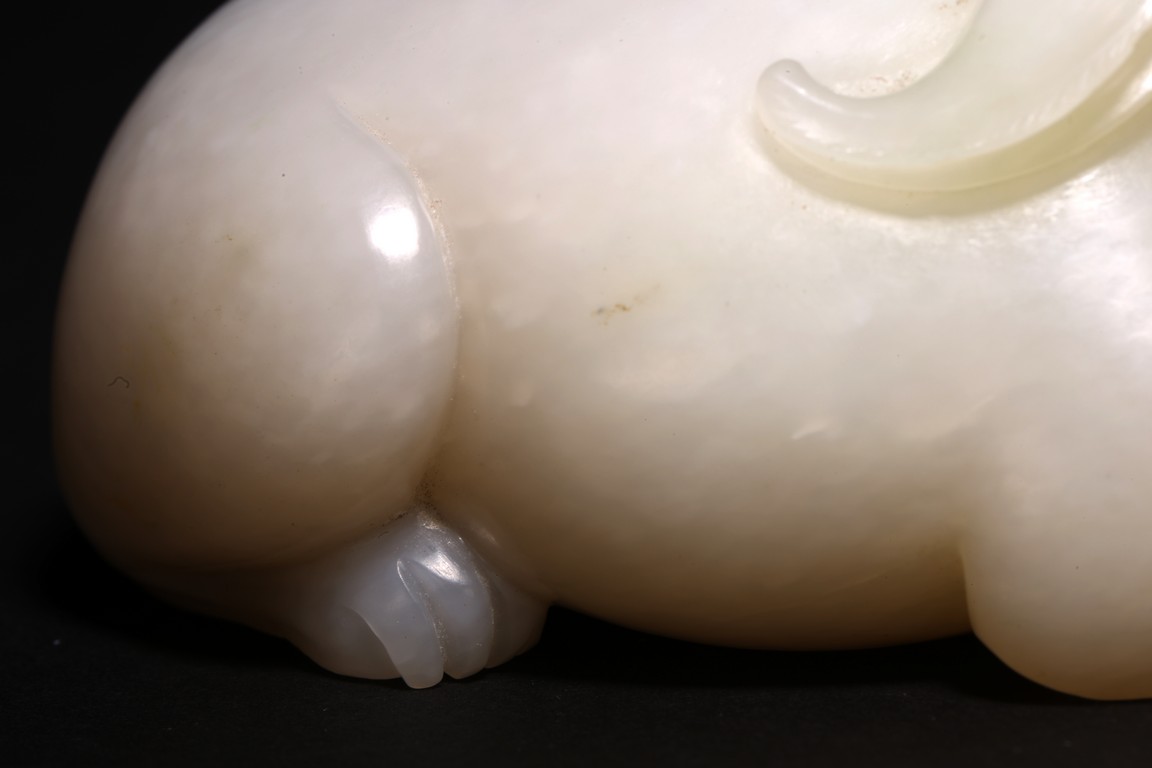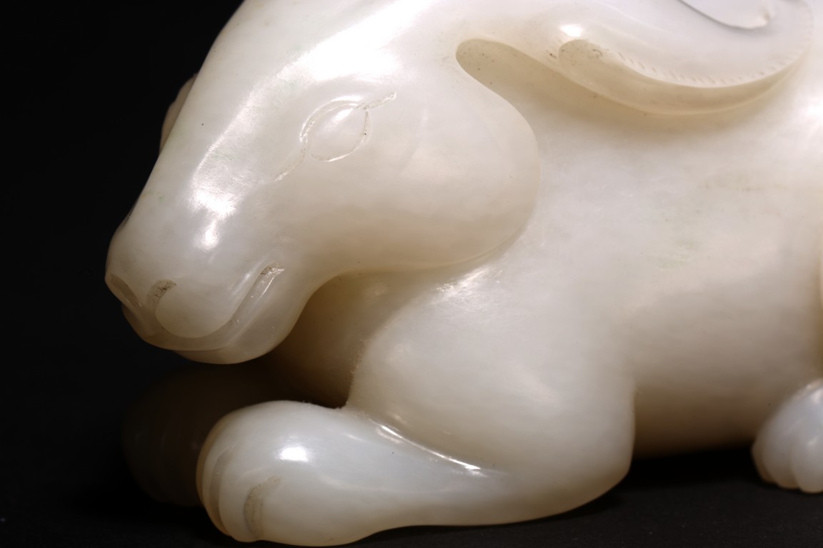 此白玉圓雕兔,長耳,溫順伏臥,觀其蜷身縮首,小心翼翼,兔體豐圓,著實可愛。擺件和闐白玉質溫潤,工刀流暢勁朗,十分難得。