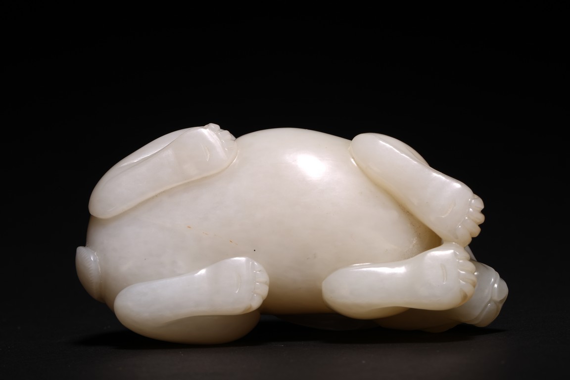 The rabbit is carved and pierced with the front paws held together and the hind legs tucked under the body, The stone is of well polished even white tone. Qing Dynasty period.