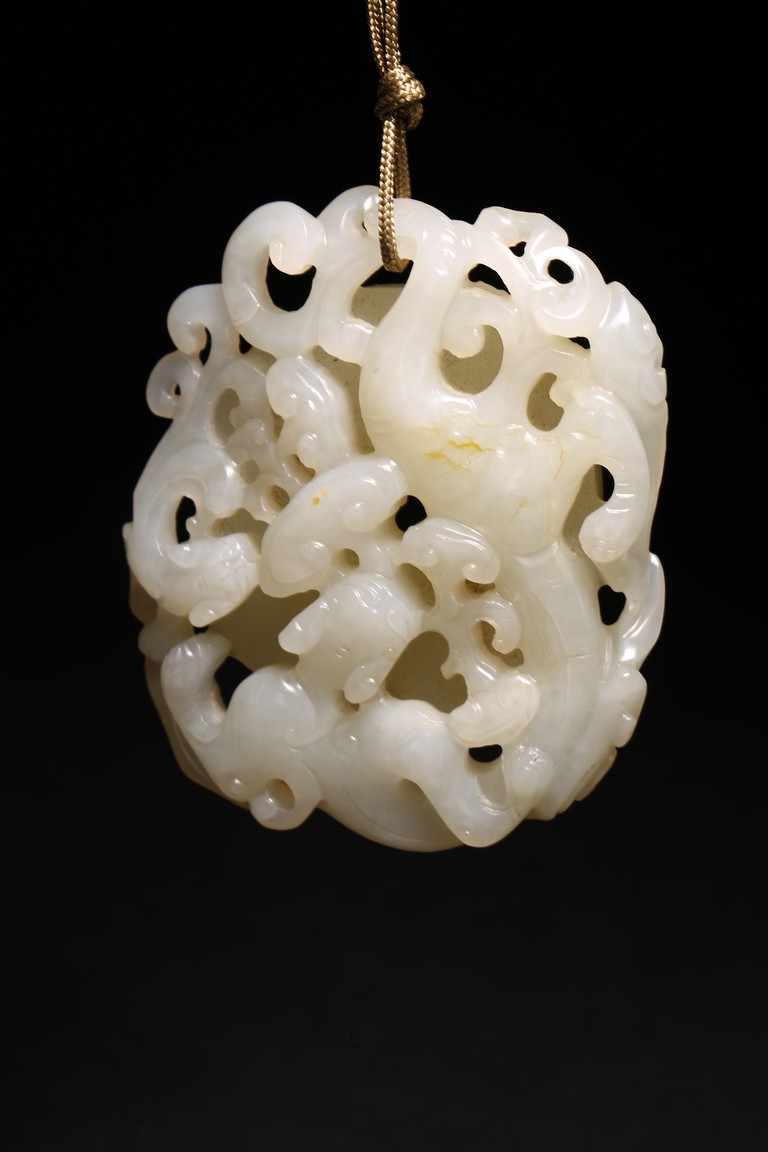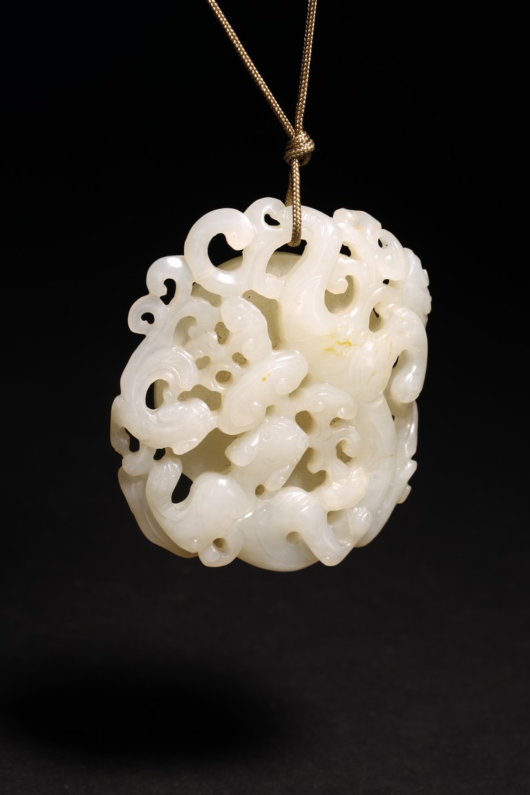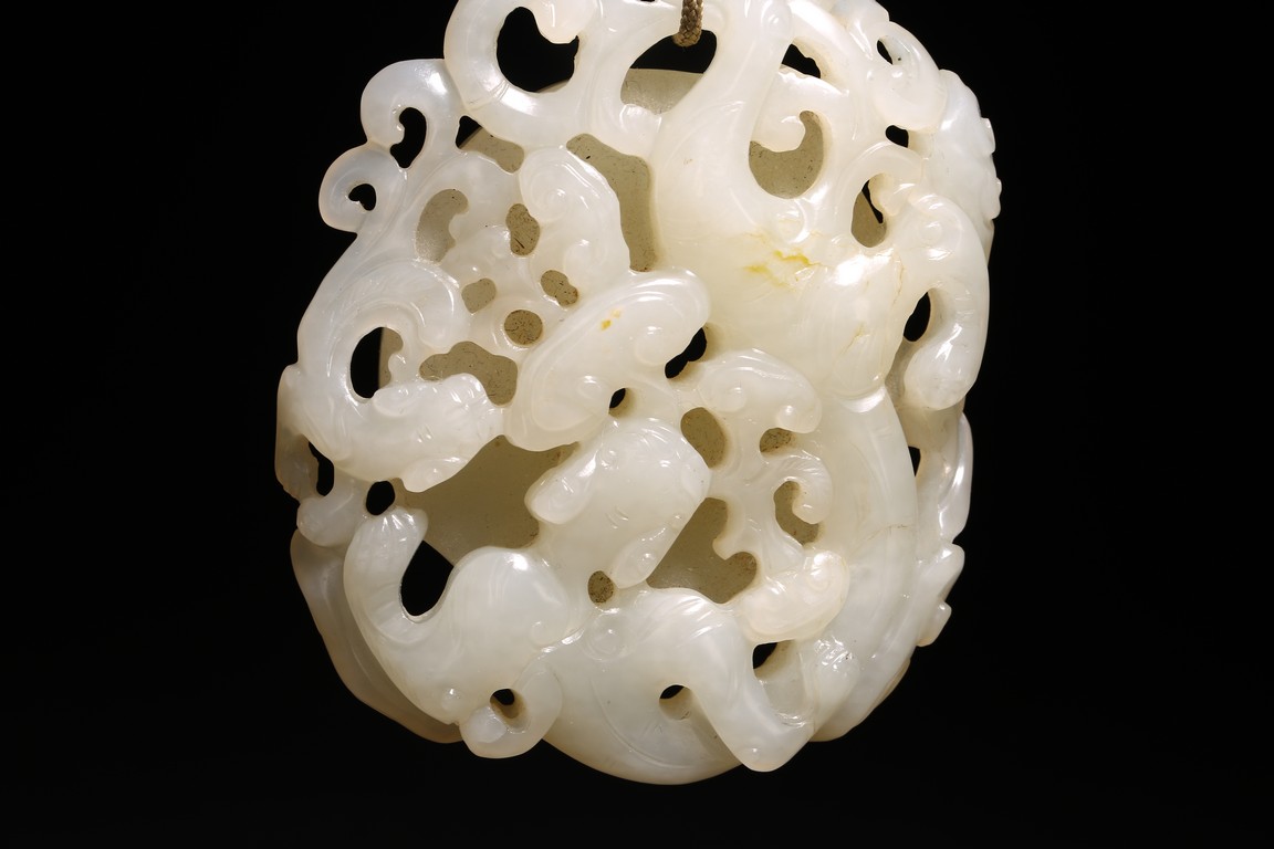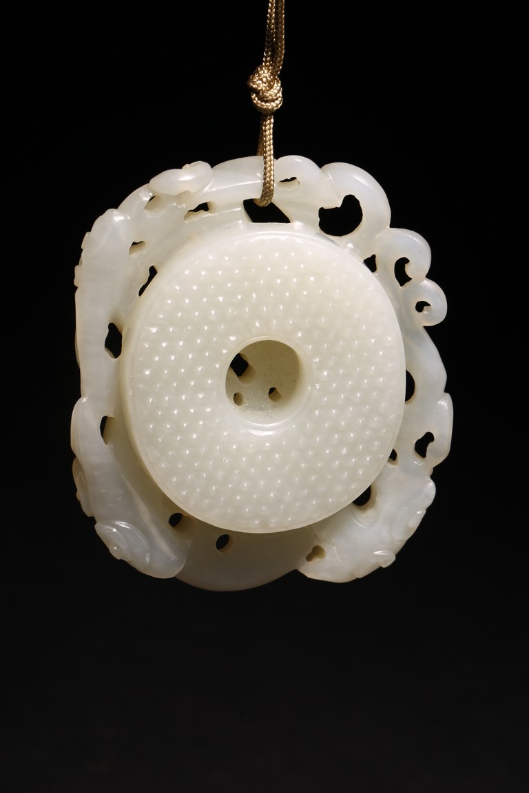 Chinese. Carved and pierced in the form of two sinuous chilong dragons amid undercut lingzhi fungus branches above a bi disc, the stone is of polished white tone. Qing Dynasty period.