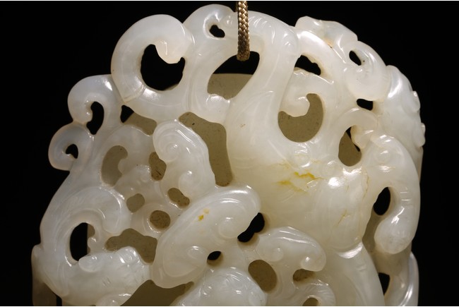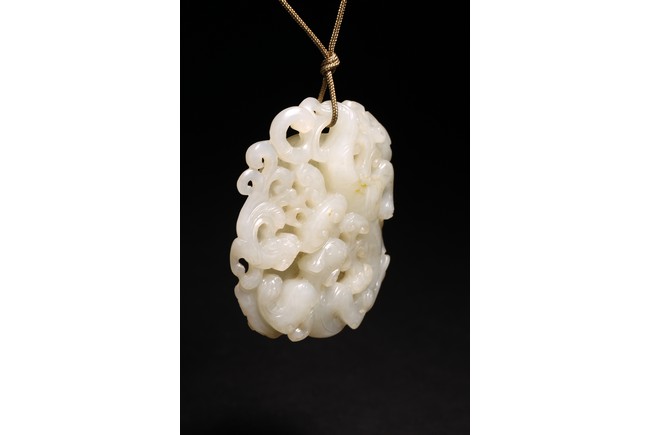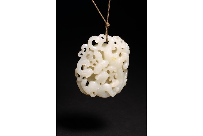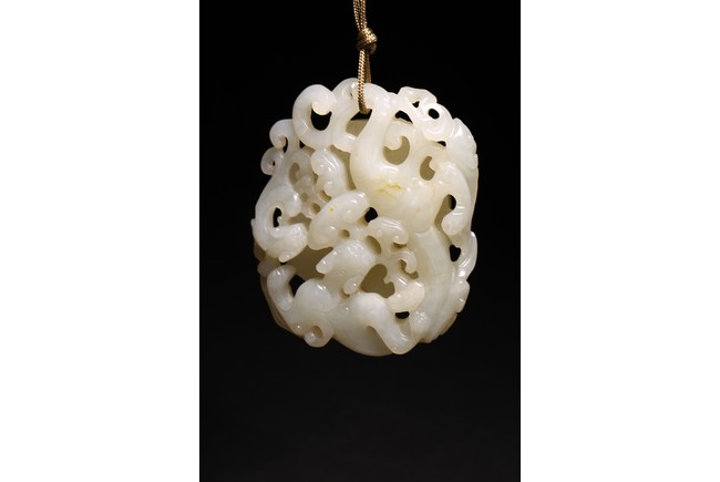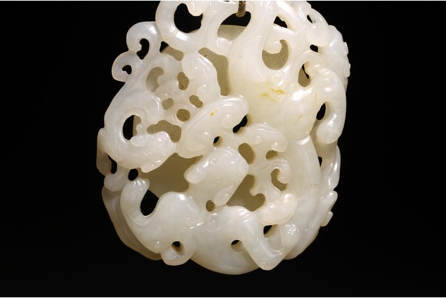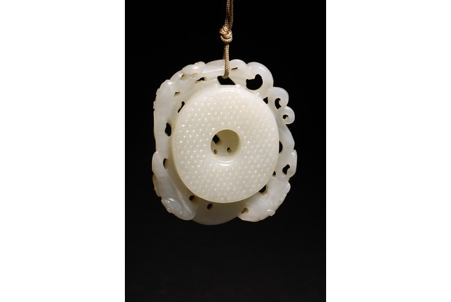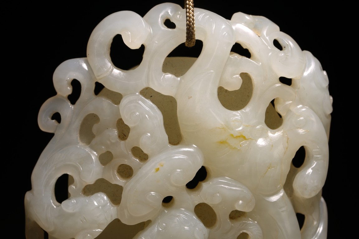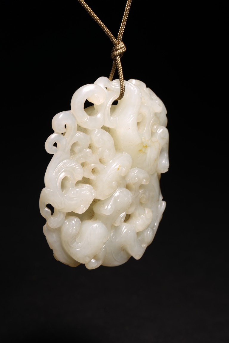 Chinese. Carved and pierced in the form of two sinuous chilong dragons amid undercut lingzhi fungus branches above a bi disc, the stone is of polished white tone. Qing Dynasty period.